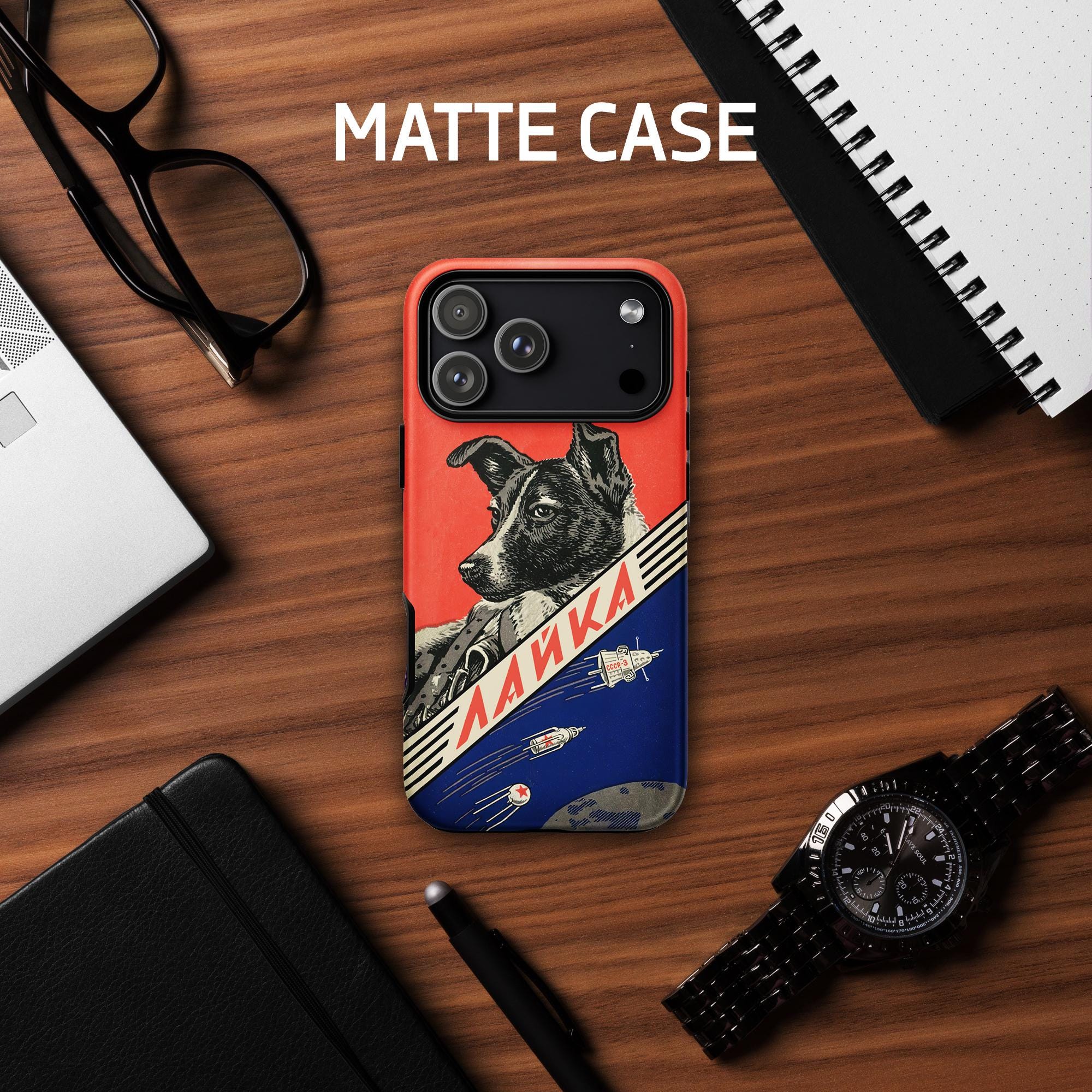 🚀 Laika / Лайка, USSR, 1958, Soviet vintage space poster — Tough Matte iPhone 17/16/15/14/12 case. Matte case. ⛔ HQ-quality.