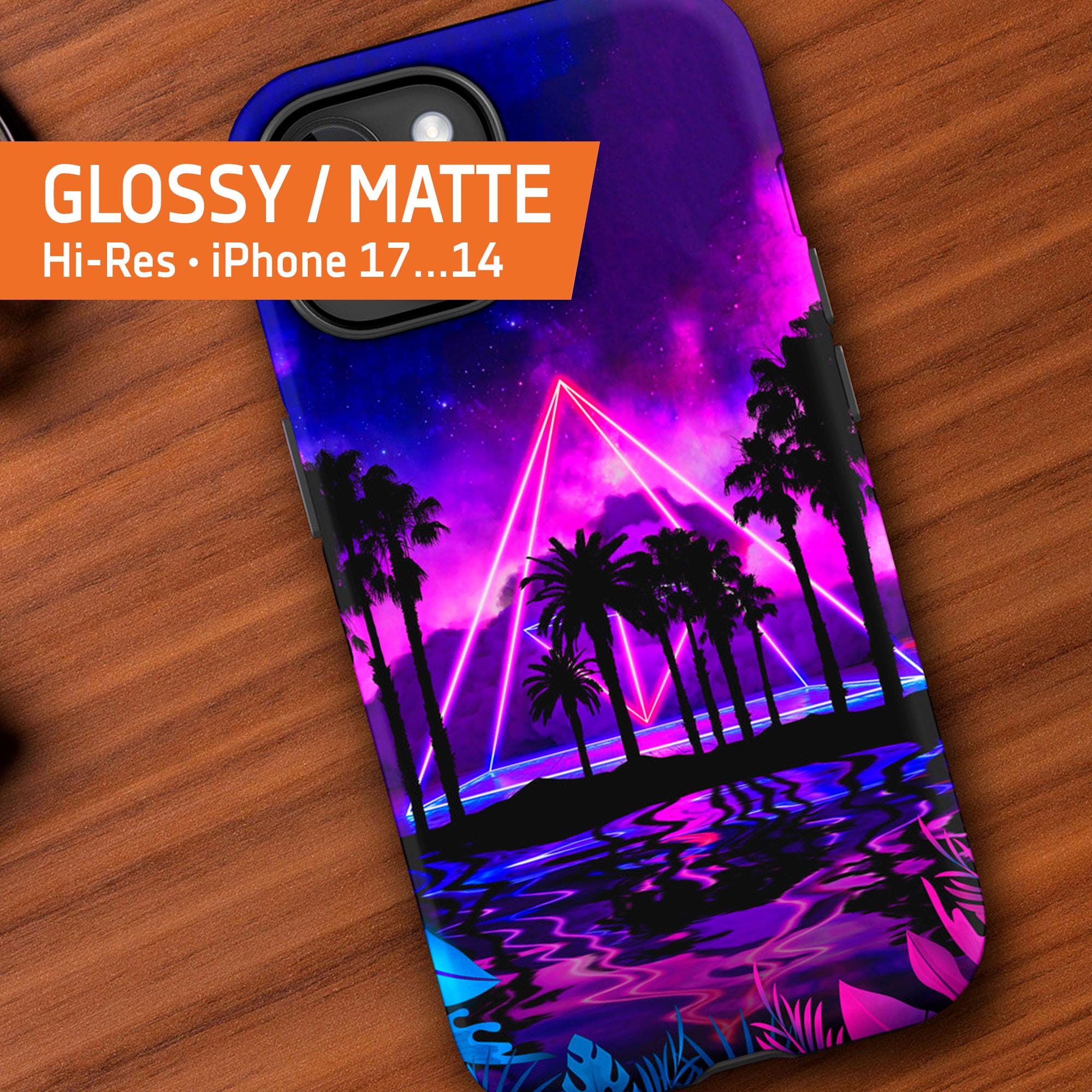 Neon palms landscape: Pyramid [synthwave/vaporwave/cyberpunk] — Tough Glossy/Matte iPhone 17/16/15 case. Vaporwave phone case, Neon phone case ⛔ HQ-quality