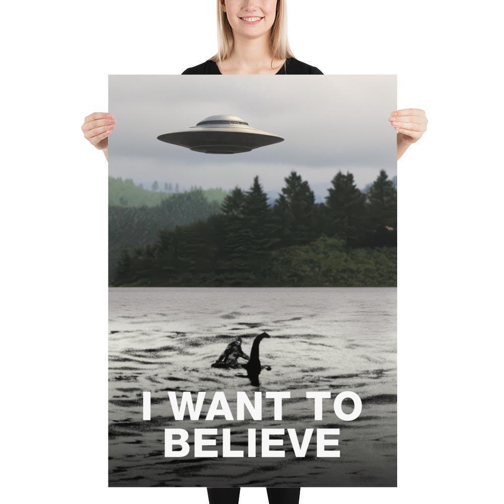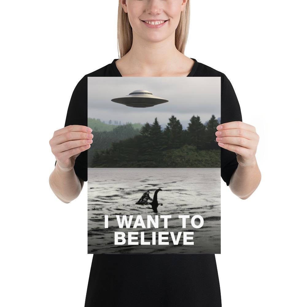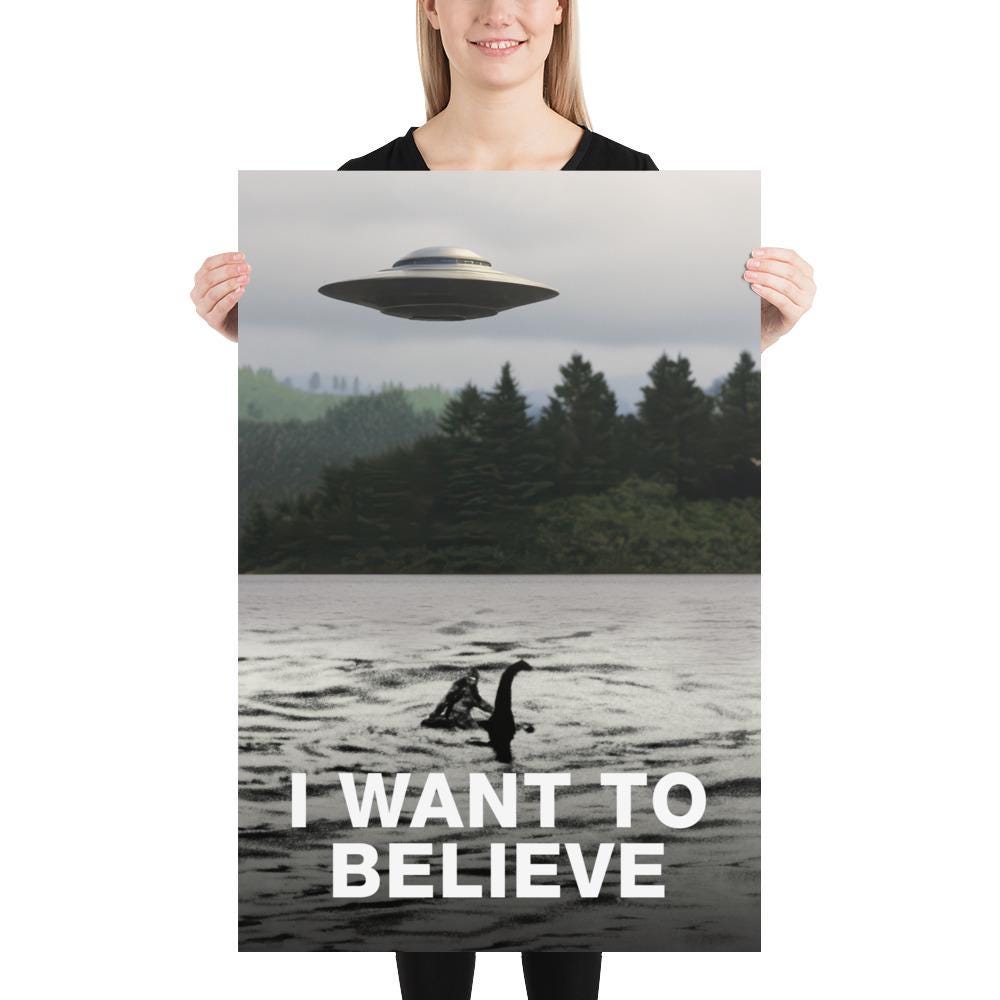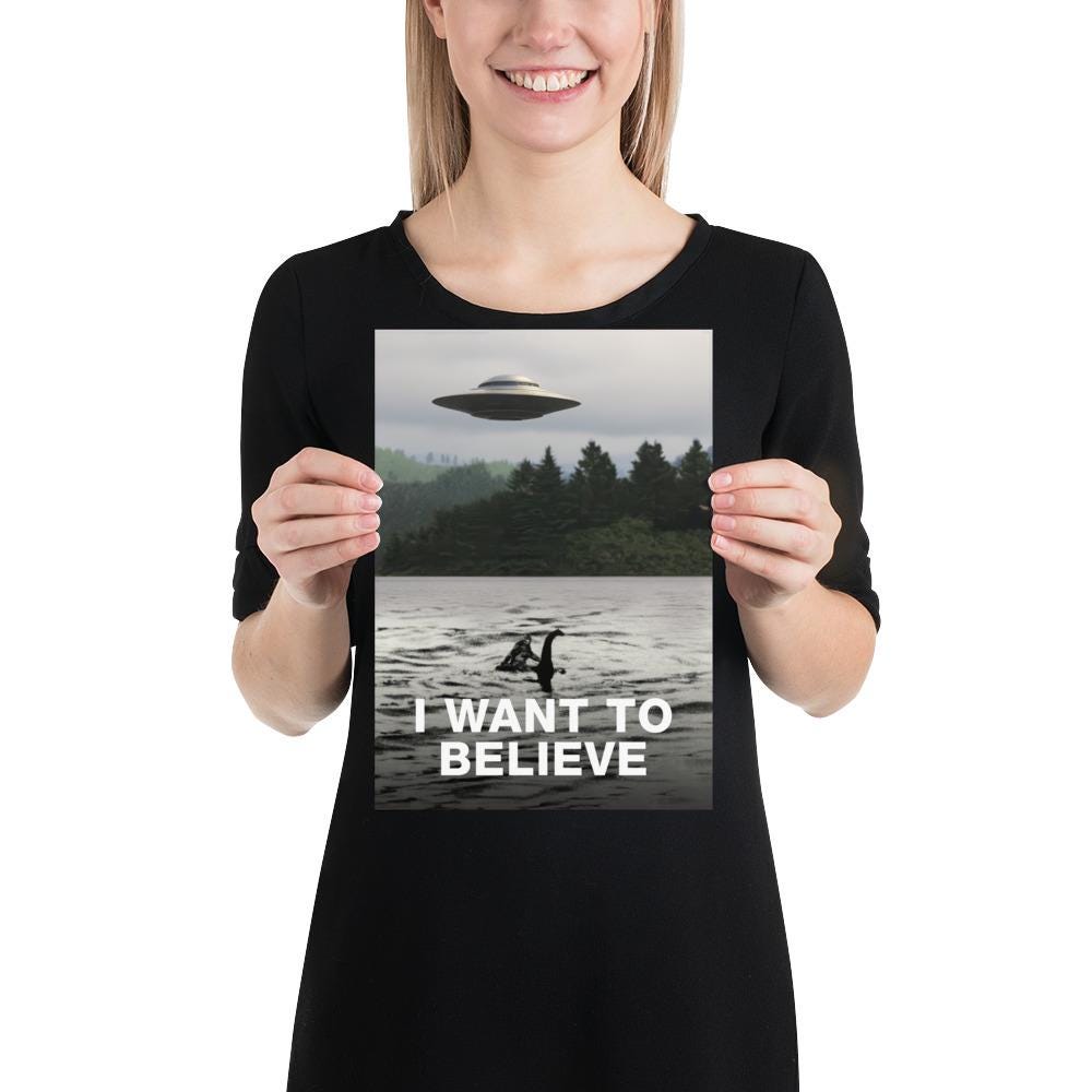 👽 This hilarious conspiracy poster recreates the legendary X-Files “I Want to Believe” style with a surreal cryptid twist. A UFO hovers above as the Loch Ness Monster carries a sasquatch across the lake, turning paranormal lore into meme-worthy wall art. Perfect for fans of aliens, Bigfoot posters, and classic 1990s sci-fi nostalgia. 🤣