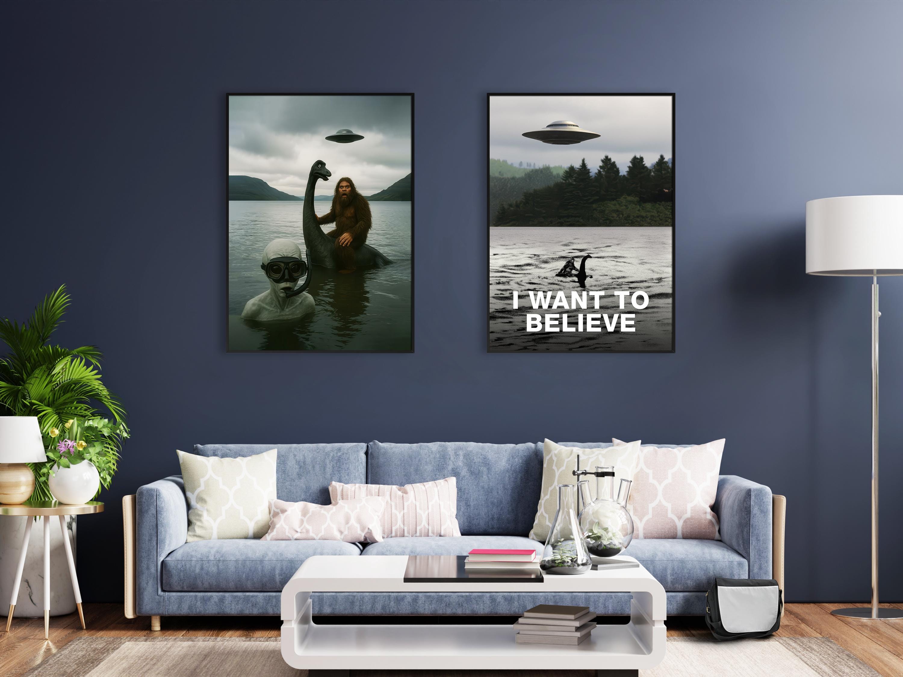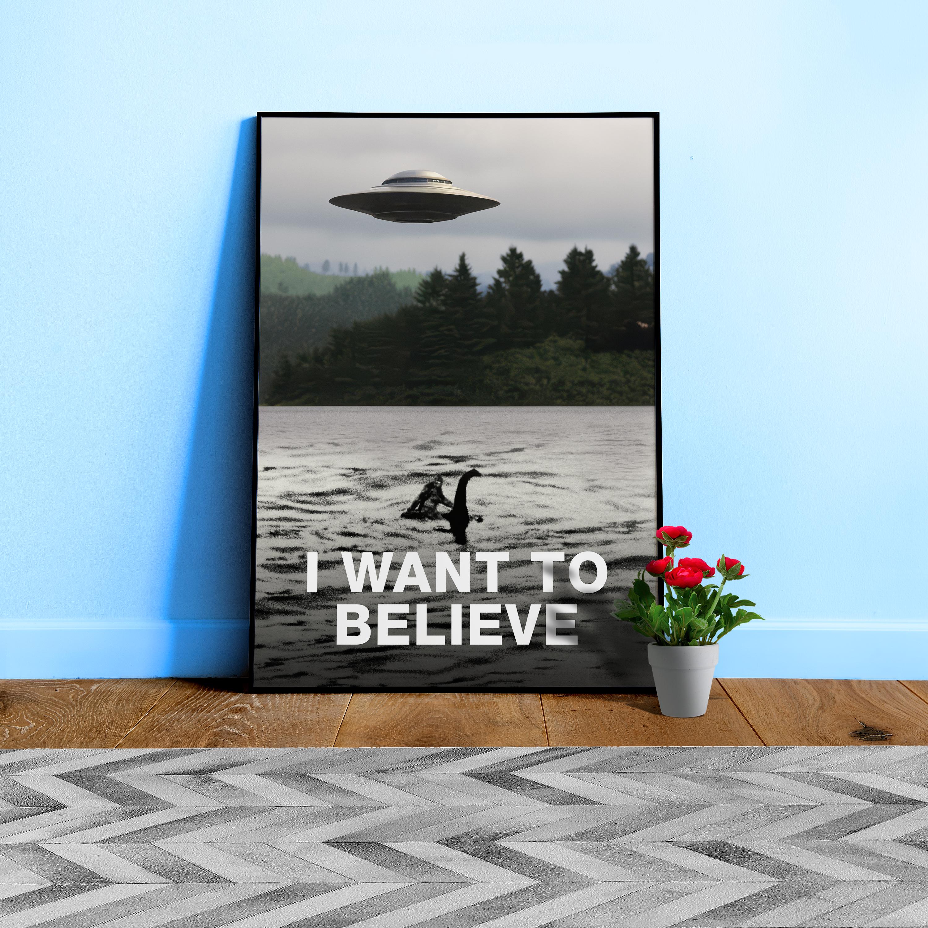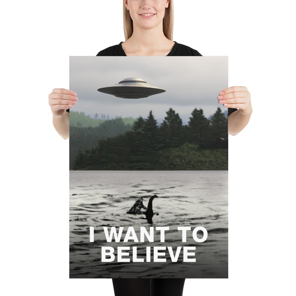 👽 This hilarious conspiracy poster recreates the legendary X-Files “I Want to Believe” style with a surreal cryptid twist. A UFO hovers above as the Loch Ness Monster carries a sasquatch across the lake, turning paranormal lore into meme-worthy wall art. Perfect for fans of aliens, Bigfoot posters, and classic 1990s sci-fi nostalgia. 🤣