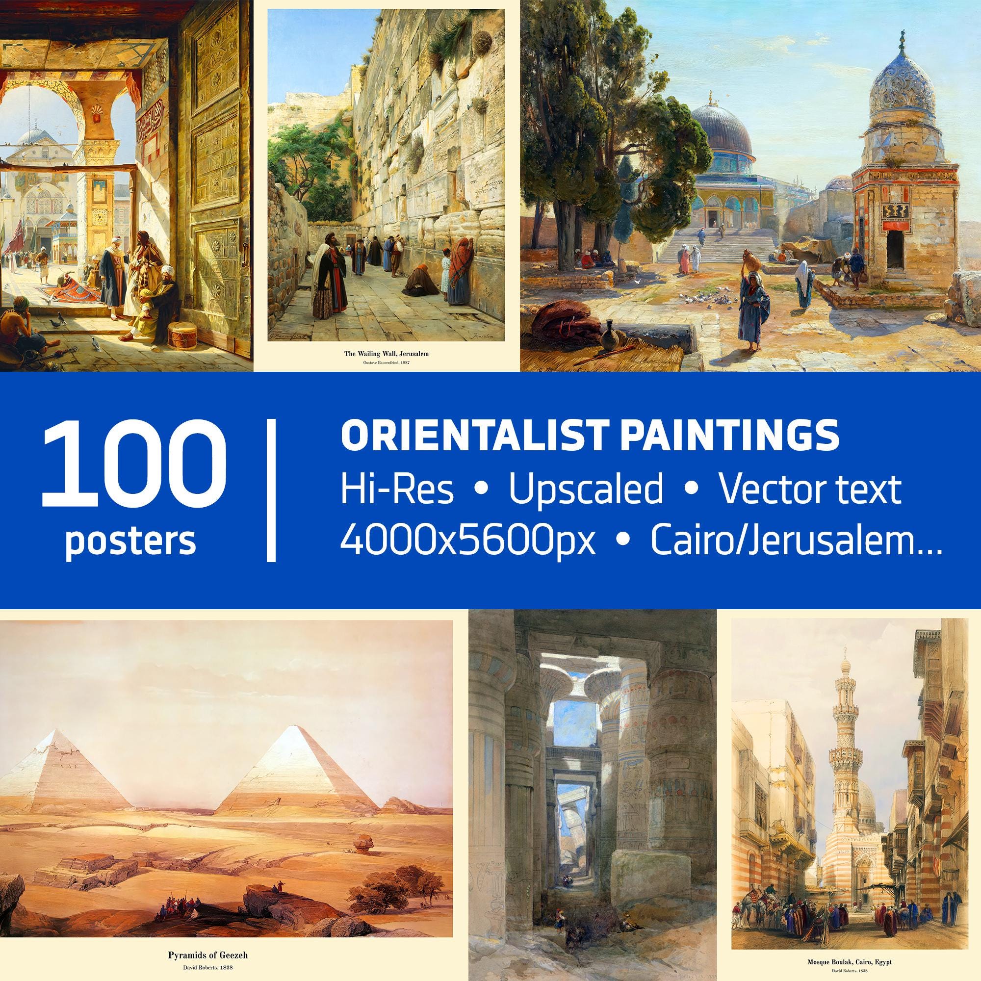 🌍 This Orientalism digital download bundle includes 100 hi-res vintage paintings of Cairo, Jerusalem, Egypt, and Lebanon by artists like David Roberts, Gustav Bauernfeind, and Jean-Léon Gérôme. Each Orientalist print is carefully upscaled for crisp detail, perfect for wall art, history lovers, or digital design projects. Bring the beauty of 19th-century Orientalist art into your space with this instant download collection.
