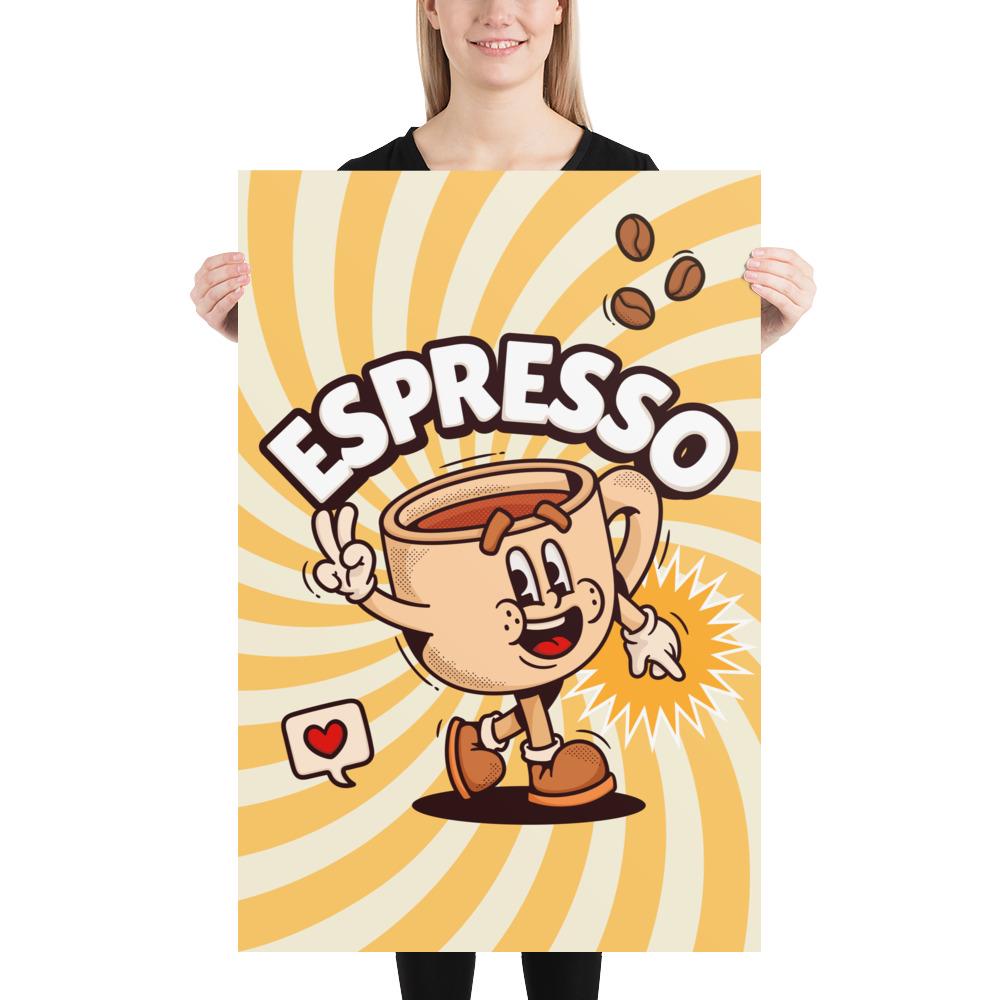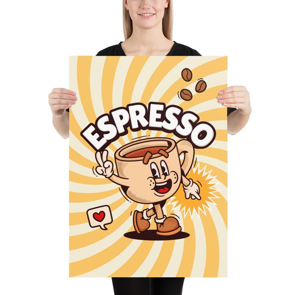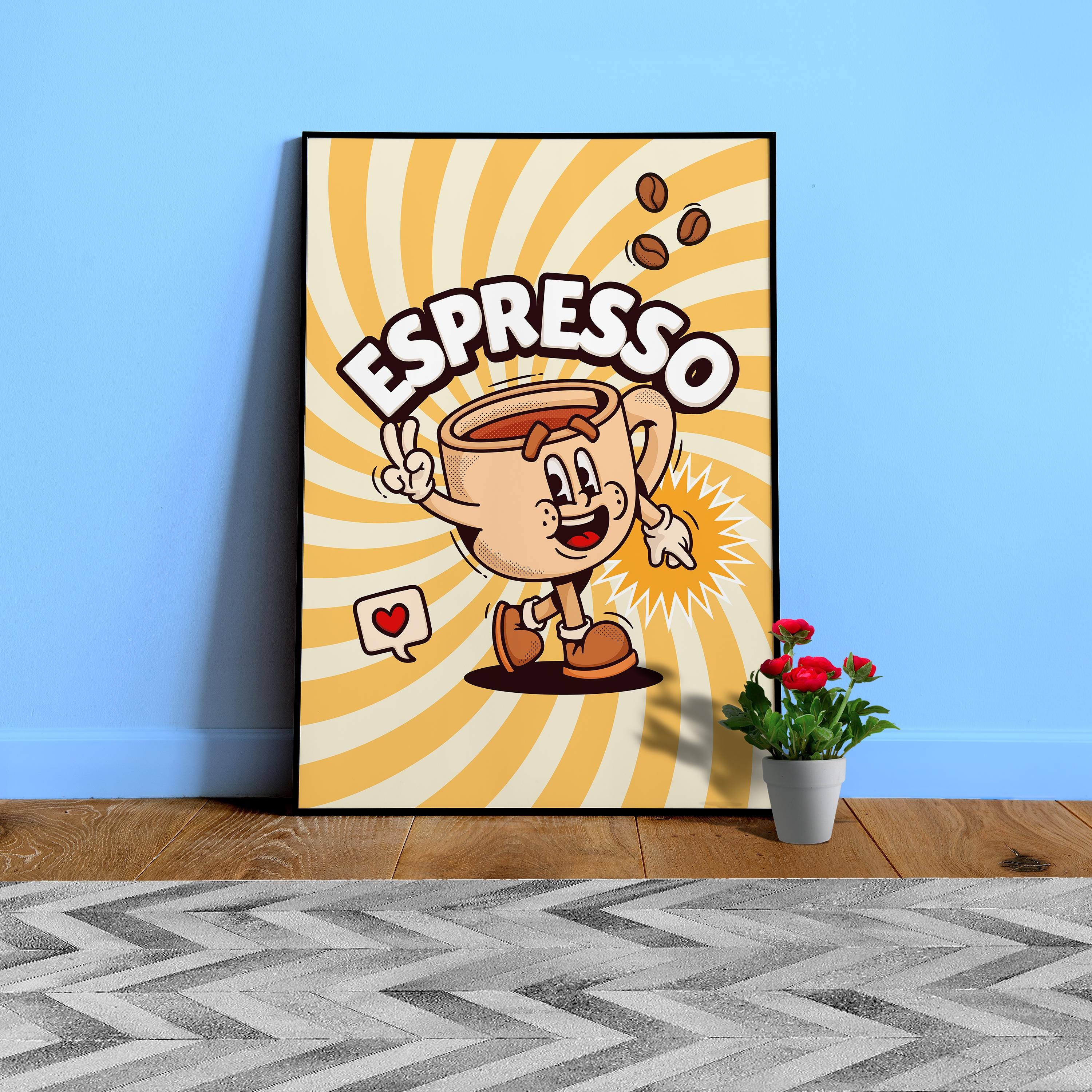 Retro cartoon coffee poster: Espresso — vintage espresso art prints, quirky kitchen wall decor, fun coffee shop artwork, caffeine lover gift ⛔ HQ-quality.