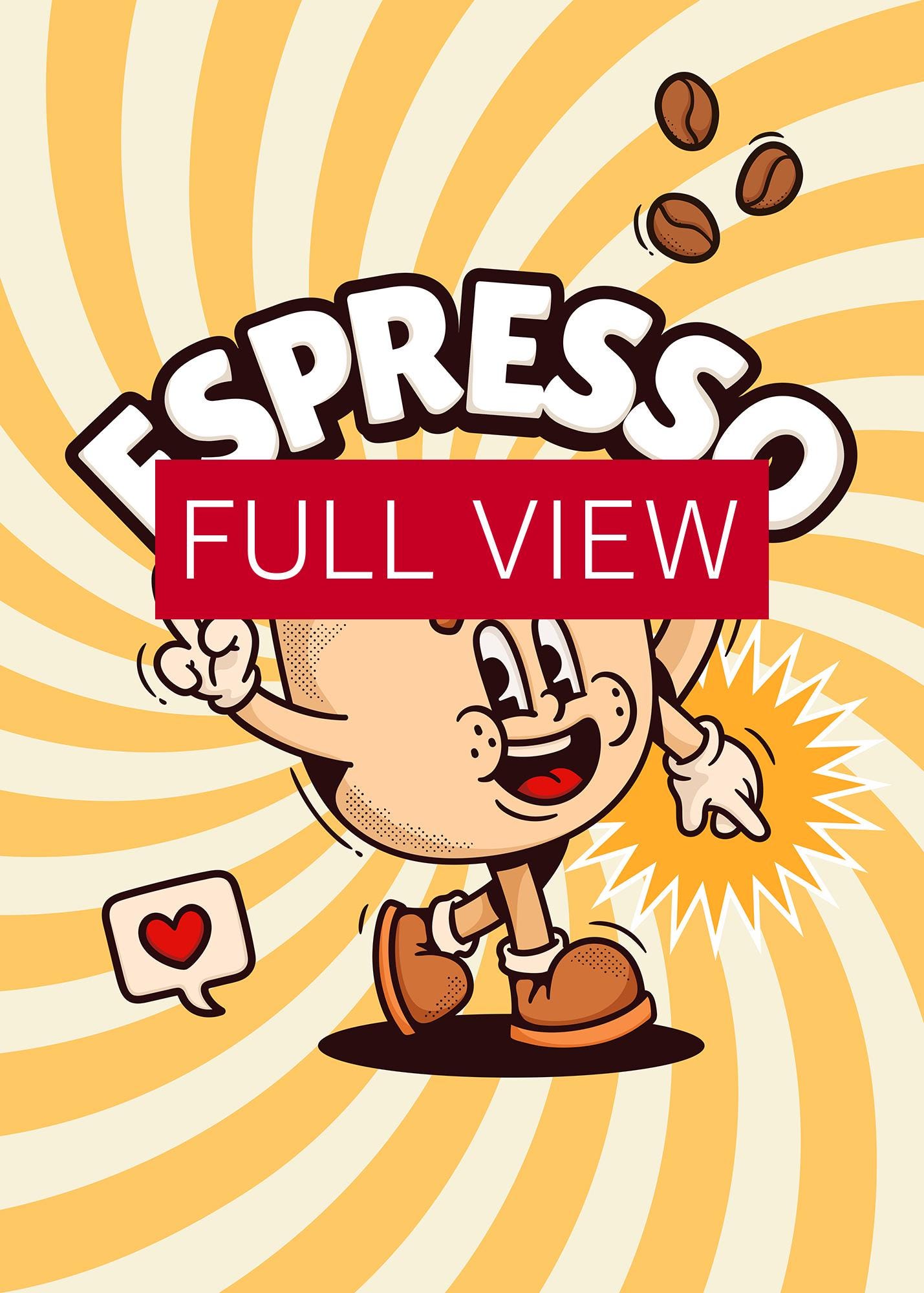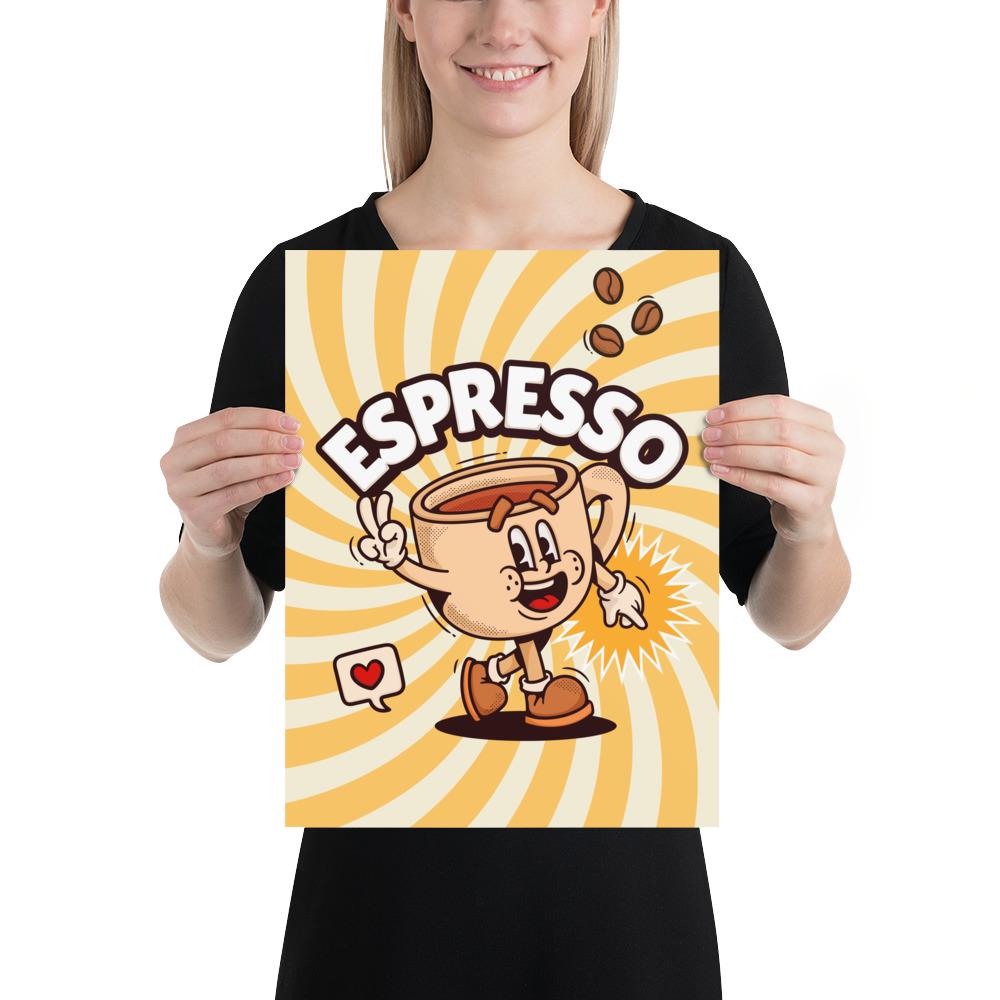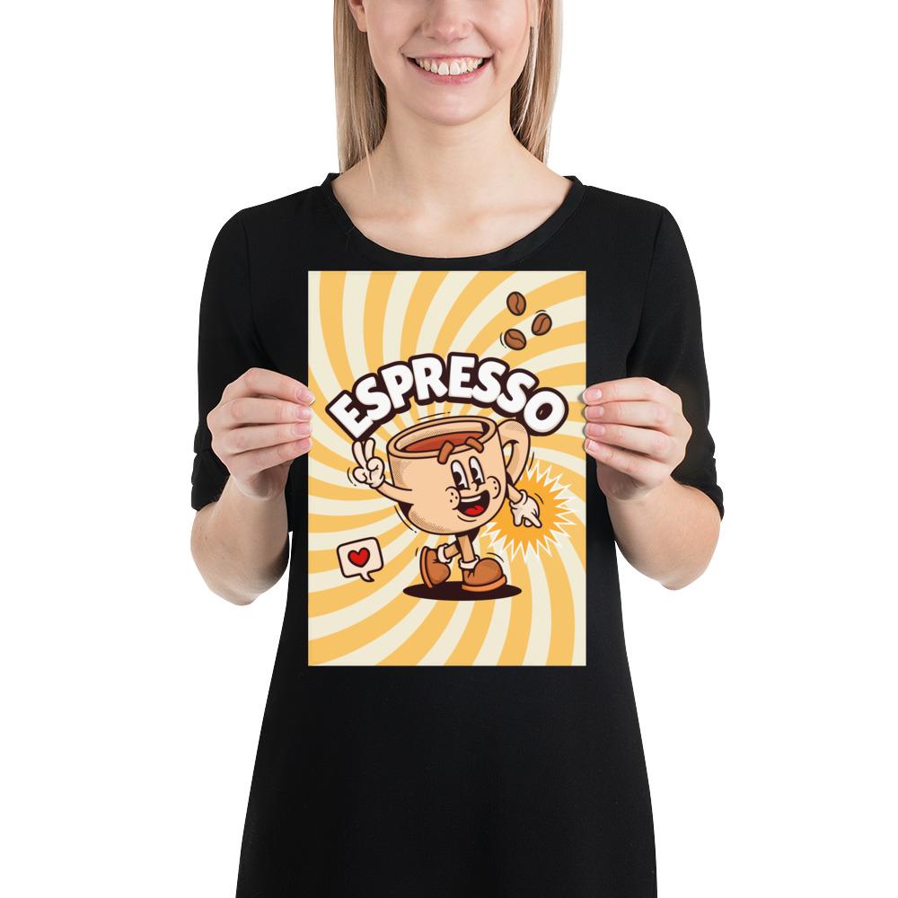 Retro cartoon coffee poster: Espresso — vintage espresso art prints, quirky kitchen wall decor, fun coffee shop artwork, caffeine lover gift ⛔ HQ-quality.