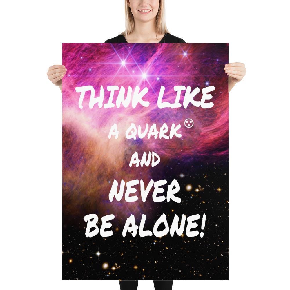 ✨ This inspiring science poster says “Think like a Quark and never be alone!” against a breathtaking James Webb space telescope cosmic photo. Perfect wall art for physics lovers, science classrooms, and astronomy fans who love clever quotes and space-inspired motivation. A James Webb space print that blends cosmic beauty, JWST imagery, and motivational science design.