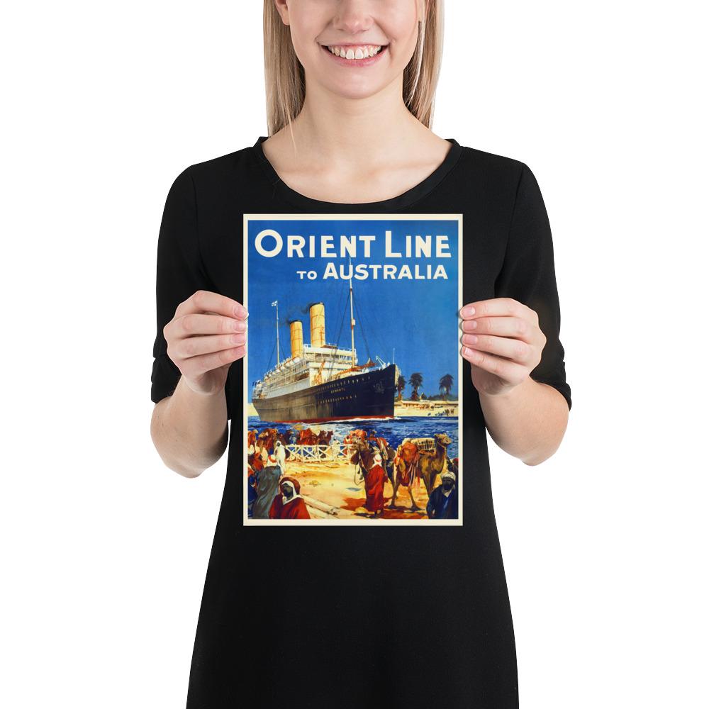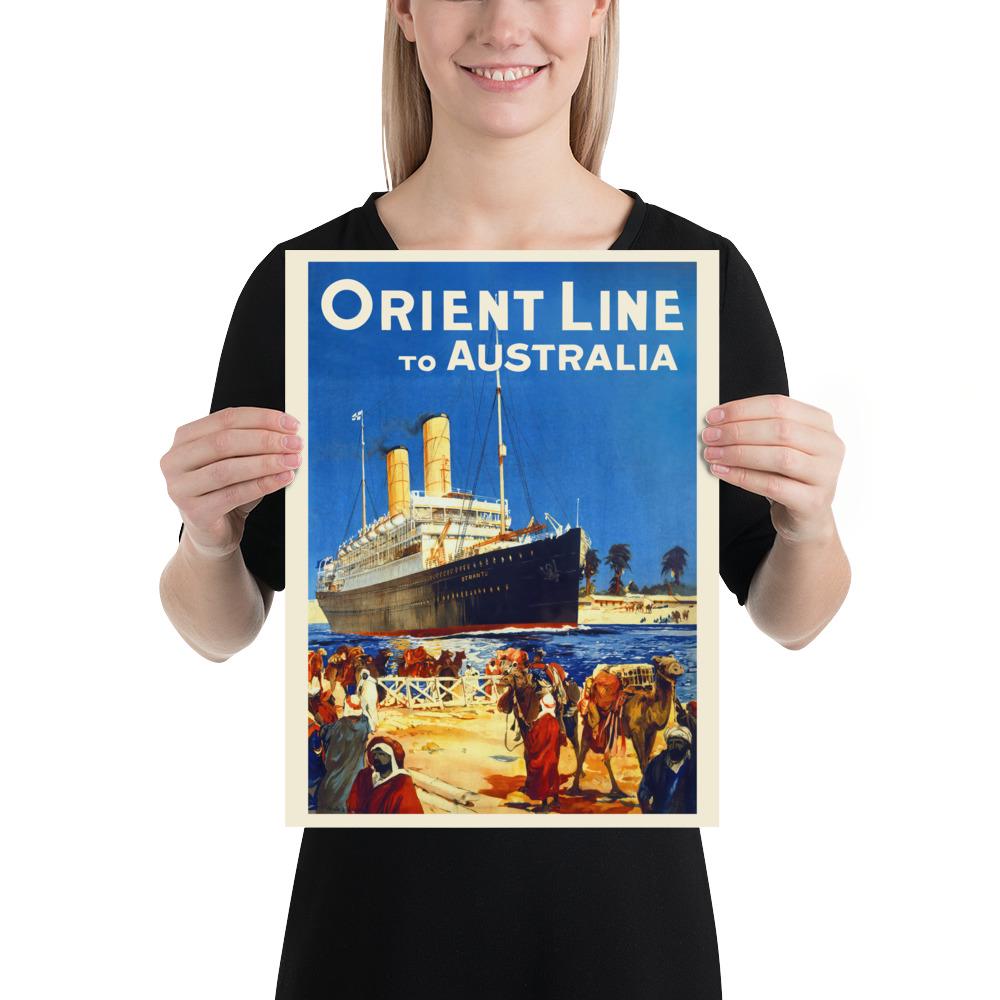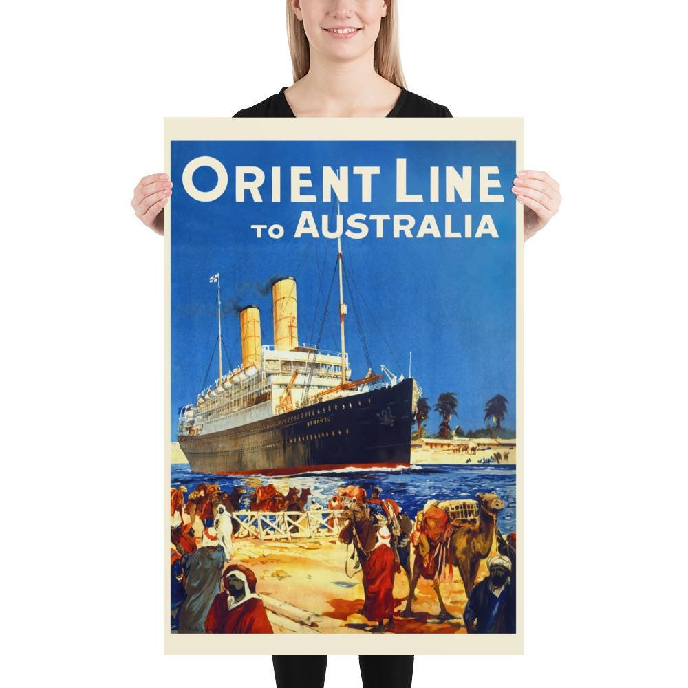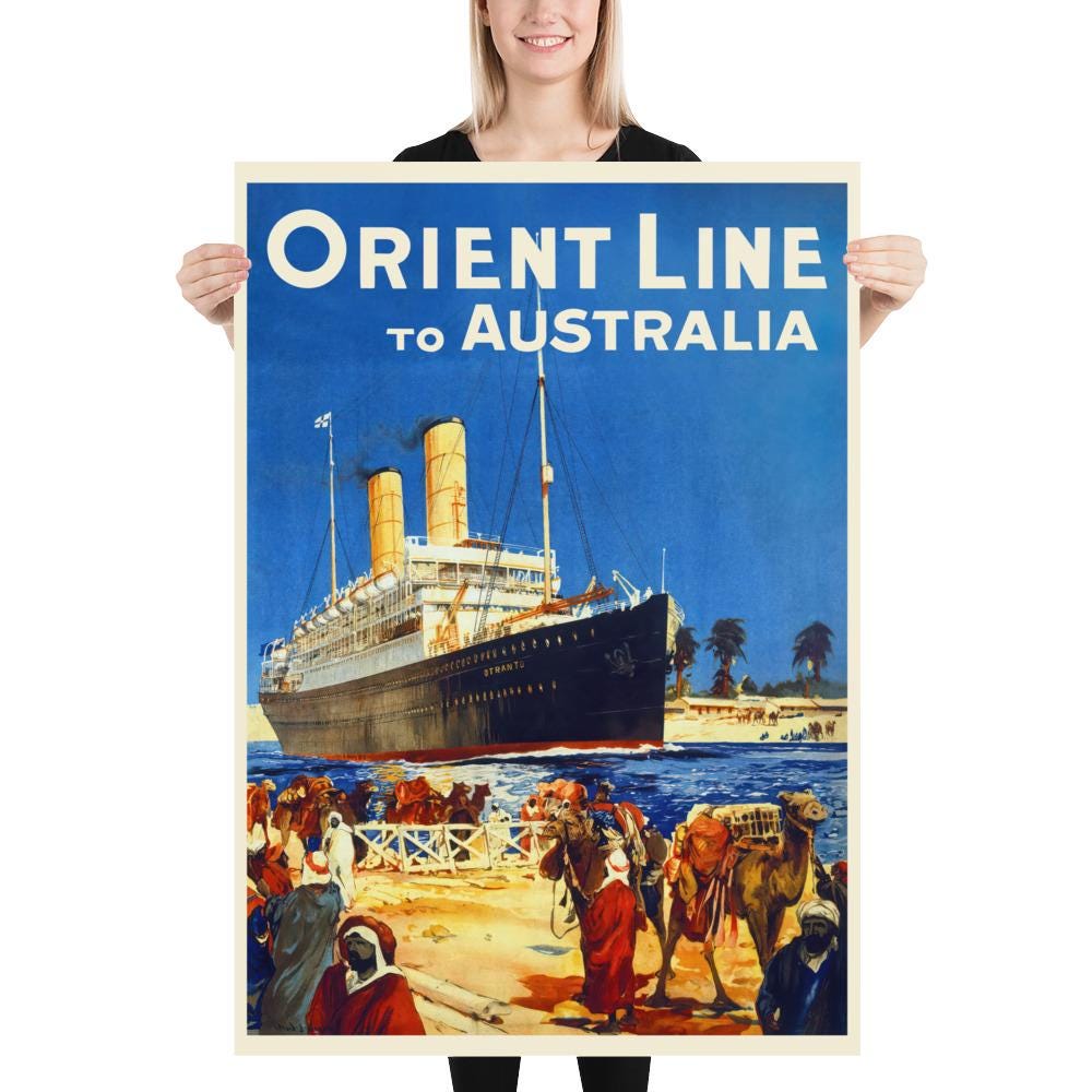 🚢 This vintage travel poster of the Orient Line to Australia captures the golden age of ocean cruises and maritime adventure. The majestic cruise ship set against a desert landscape evokes the glamor and excitement of 1930s travel art. Perfect for lovers of nautical decor, vintage posters, and retro cruise aesthetics.