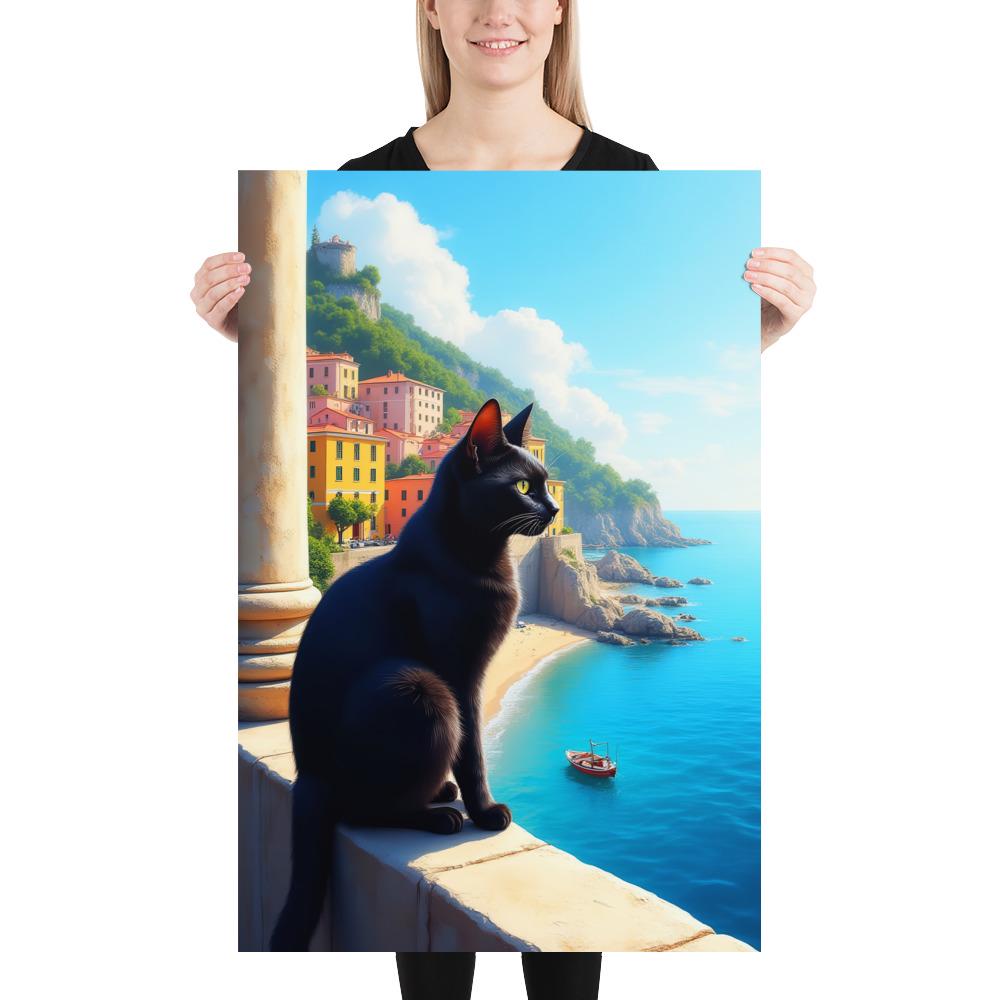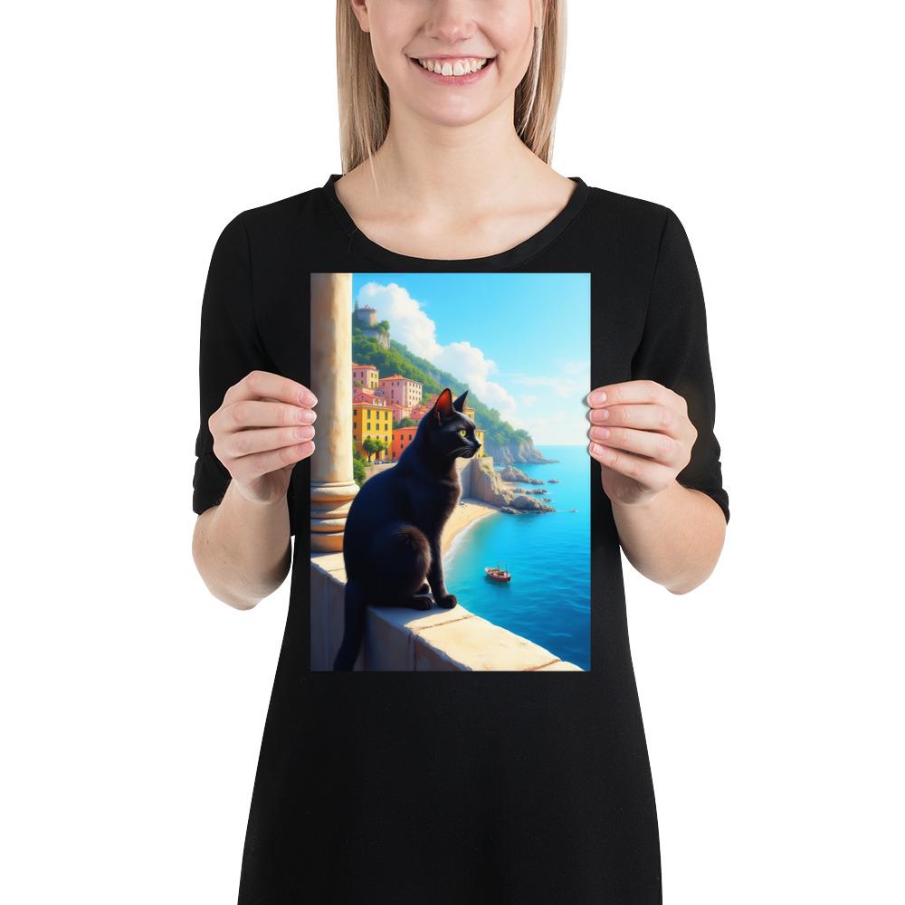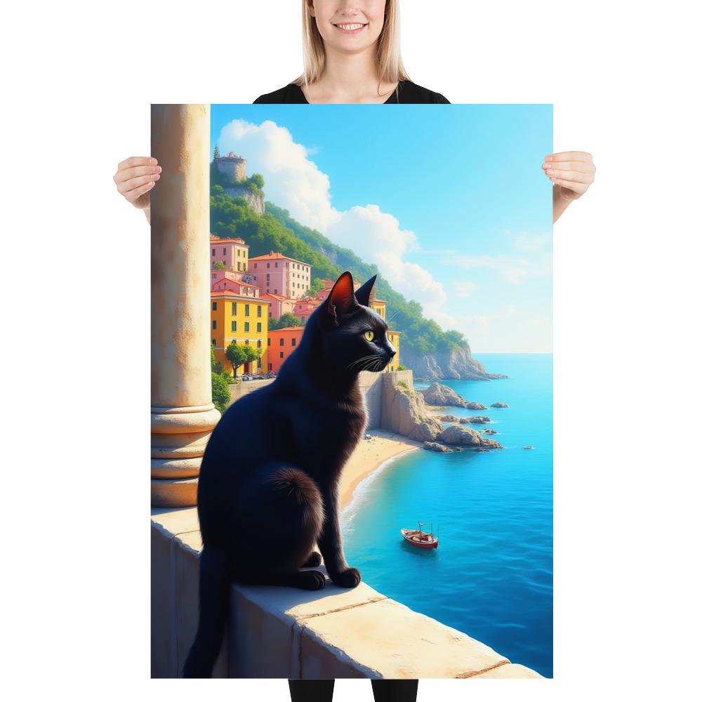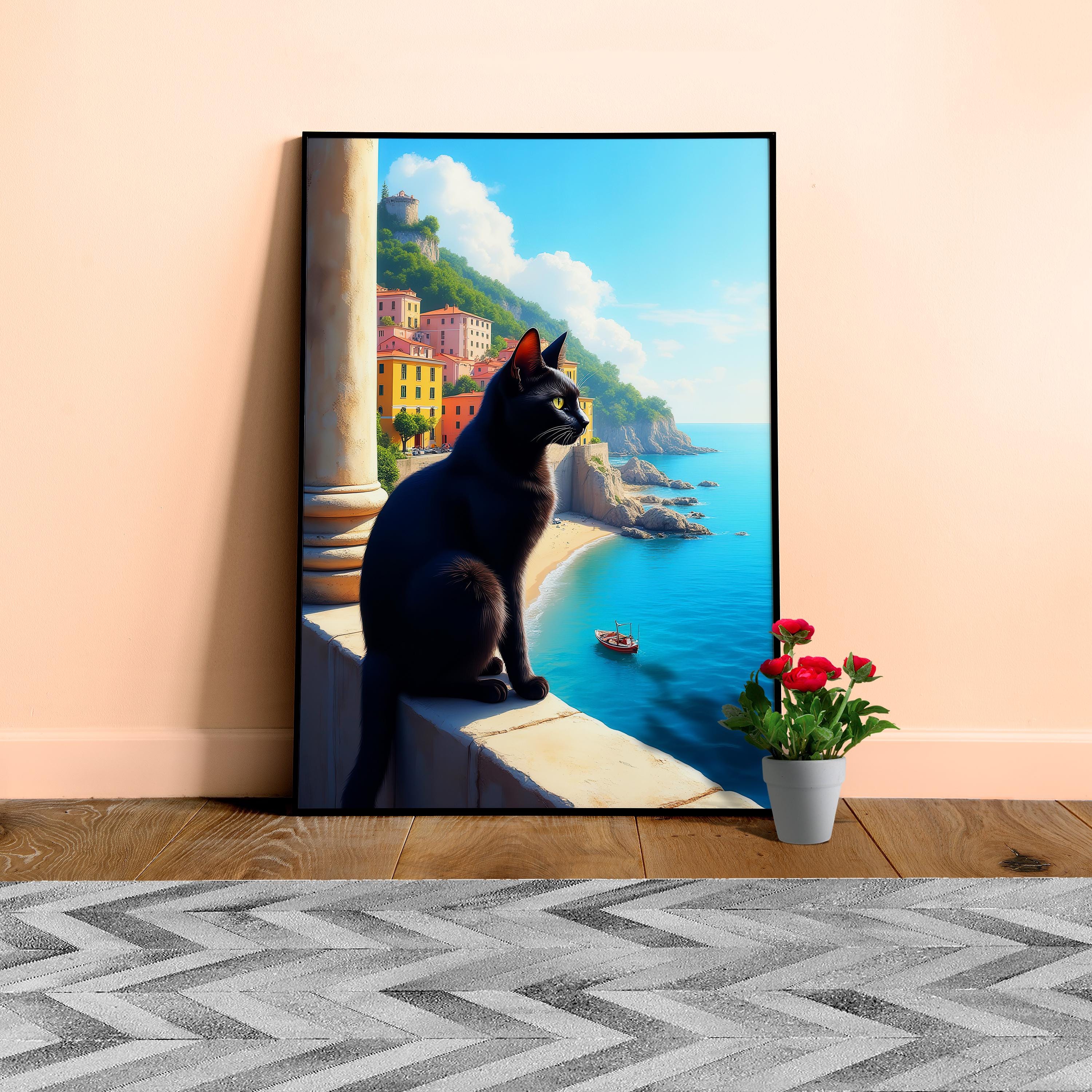 Mediterranean Cat Poster – Black Cat Wall Art, Italy Coast Print / Seaside Village Painting with view, Cat Lover Home Decor, Coastal Wall Art and gift ⛔ HQ-quality.