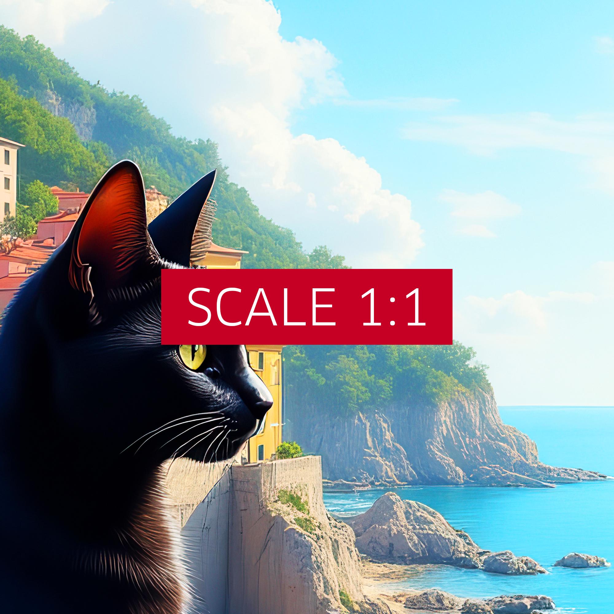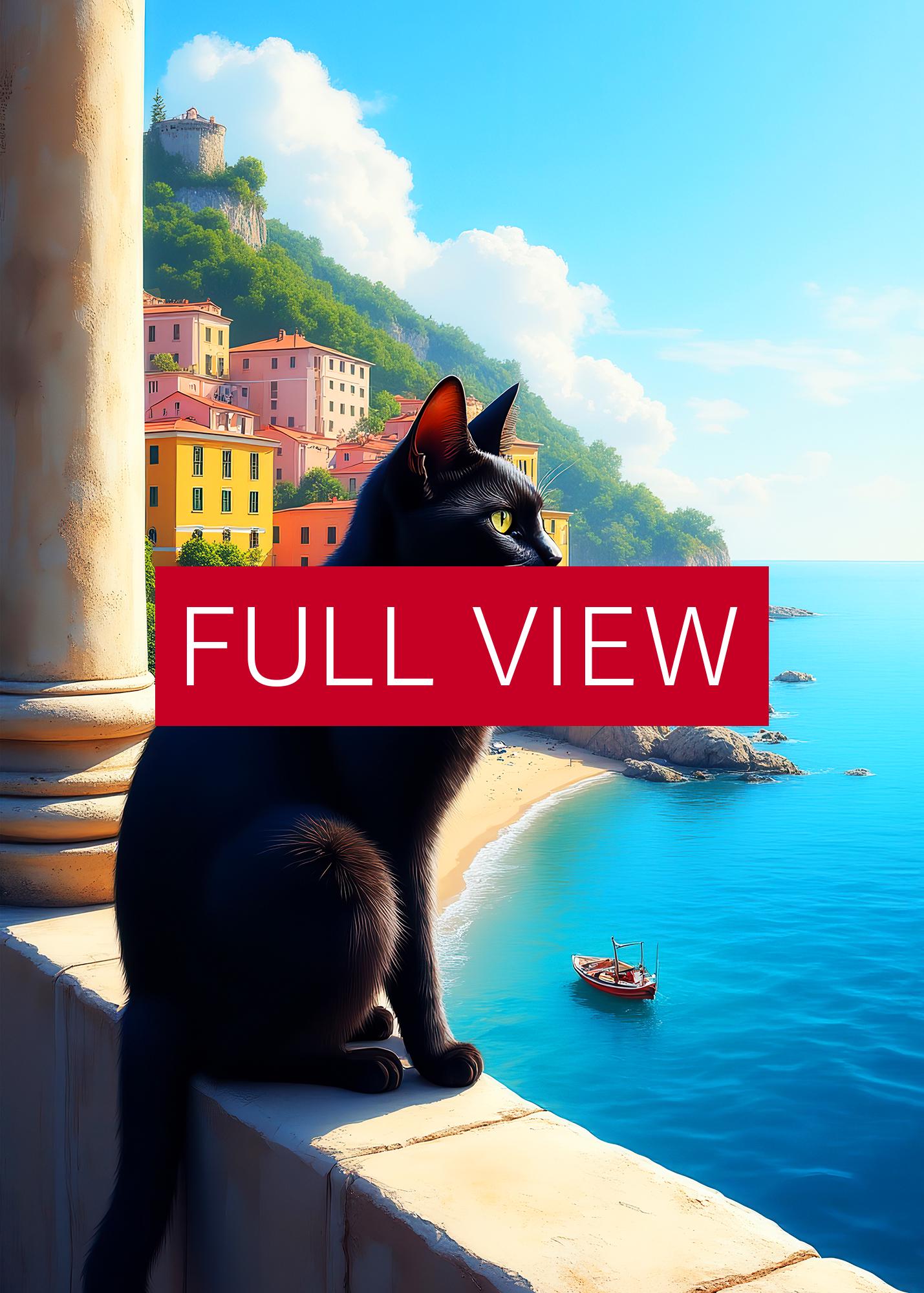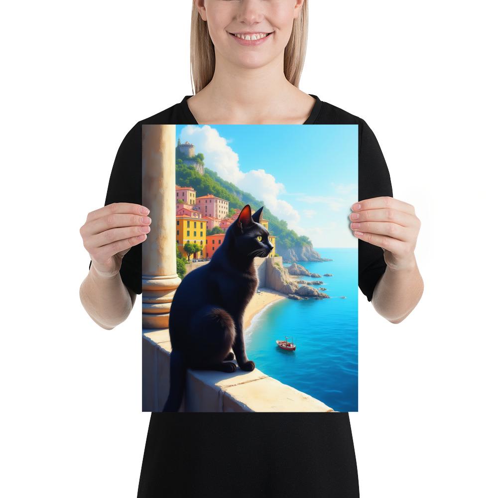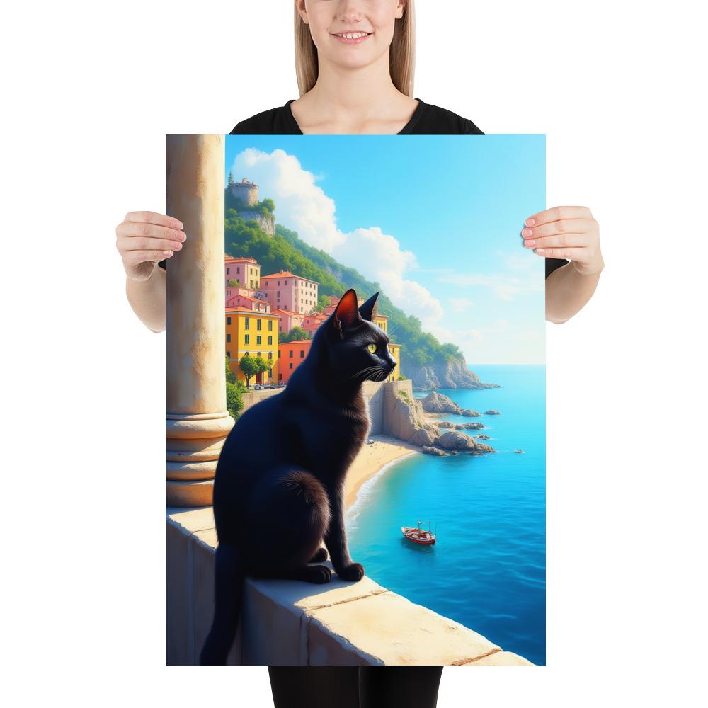 Mediterranean Cat Poster – Black Cat Wall Art, Italy Coast Print / Seaside Village Painting with view, Cat Lover Home Decor, Coastal Wall Art and gift ⛔ HQ-quality.