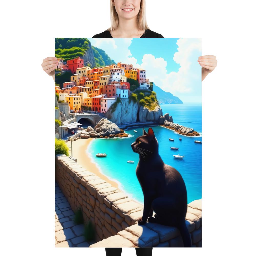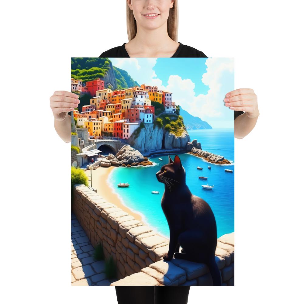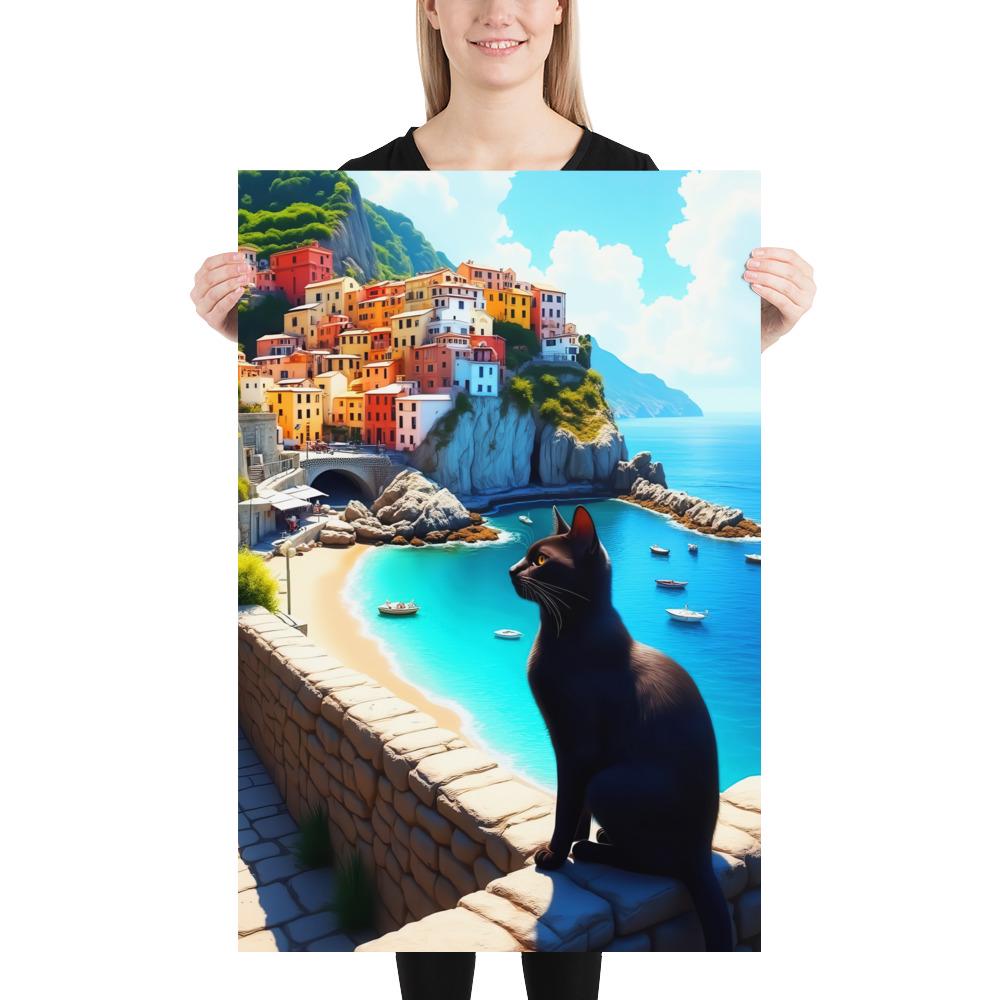 Black Cat Poster – Mediterranean Wall Art, Italy Coast Print / Seaside Cat Painting, Coastal Home Decor, Summer Travel Poster ⛔ HQ-quality.