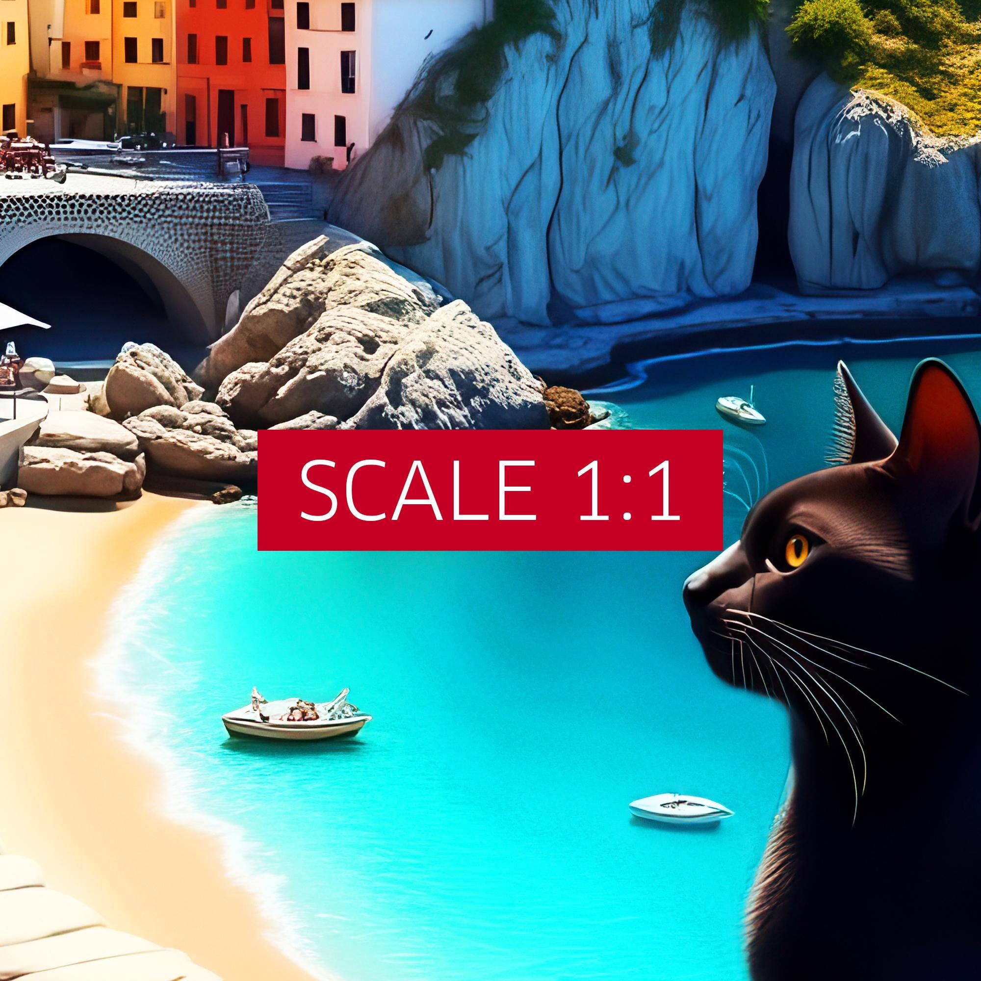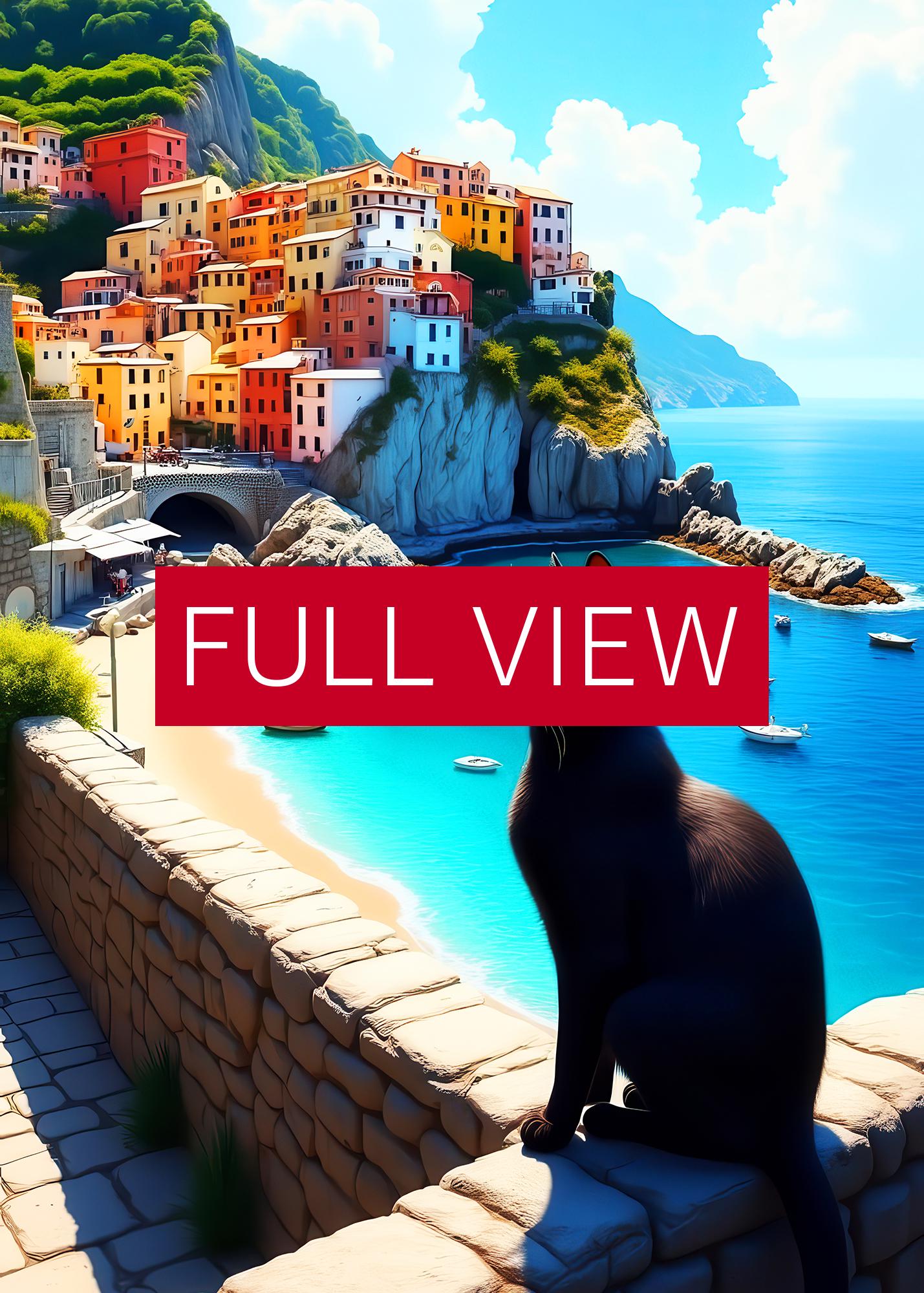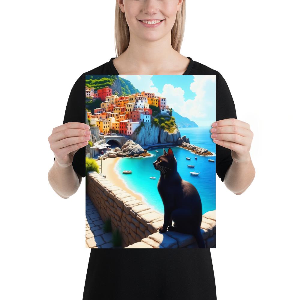 Black Cat Poster – Mediterranean Wall Art, Italy Coast Print / Seaside Cat Painting, Coastal Home Decor, Summer Travel Poster ⛔ HQ-quality.