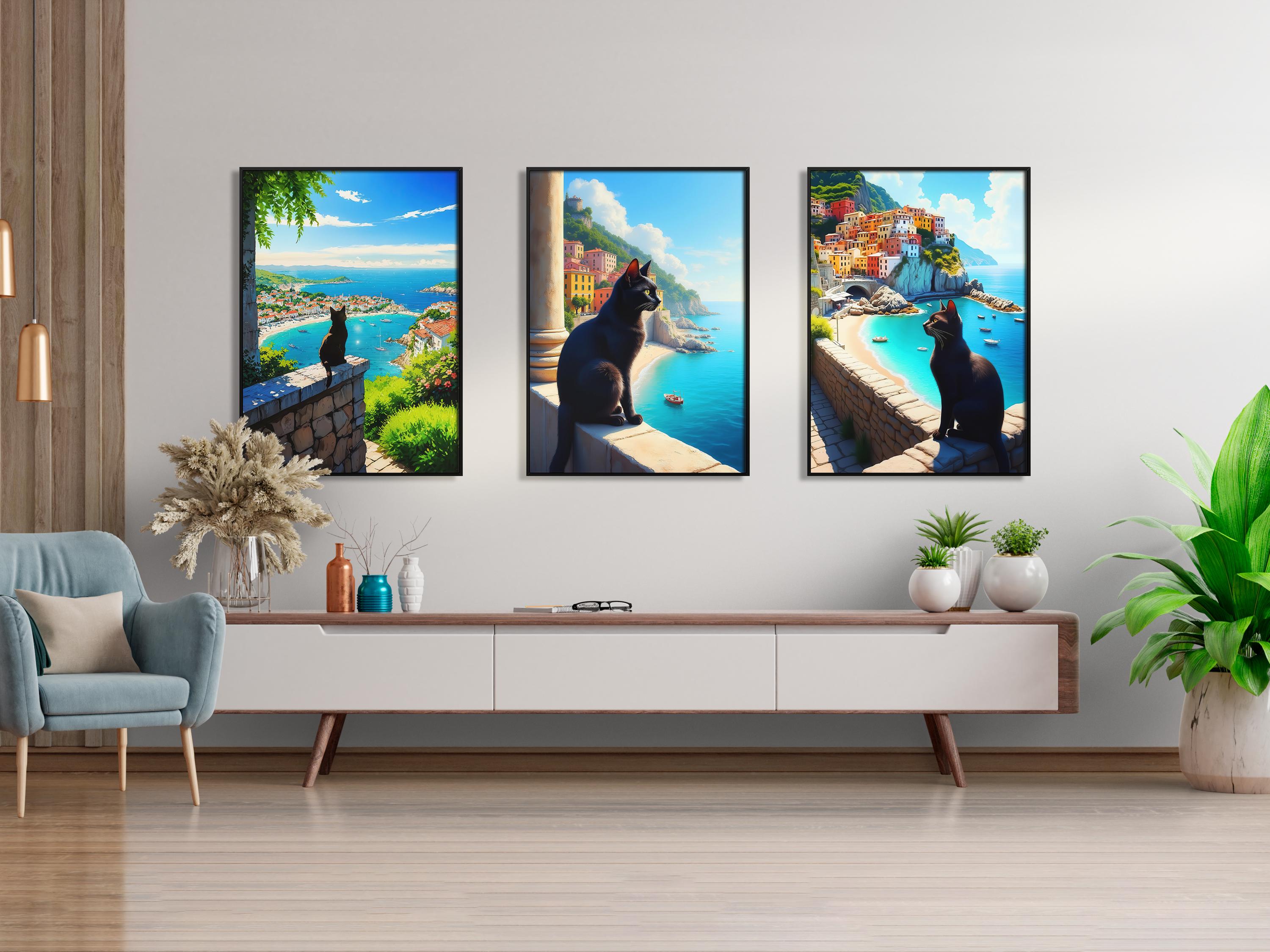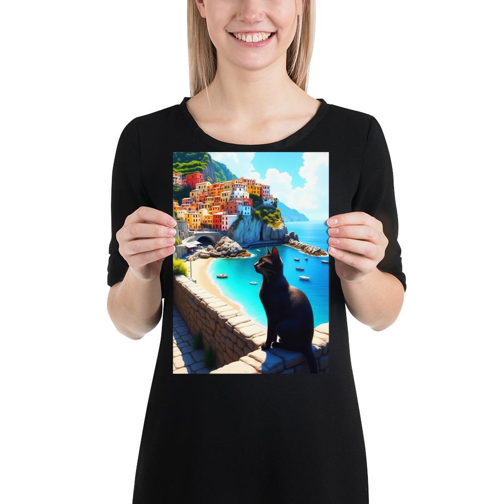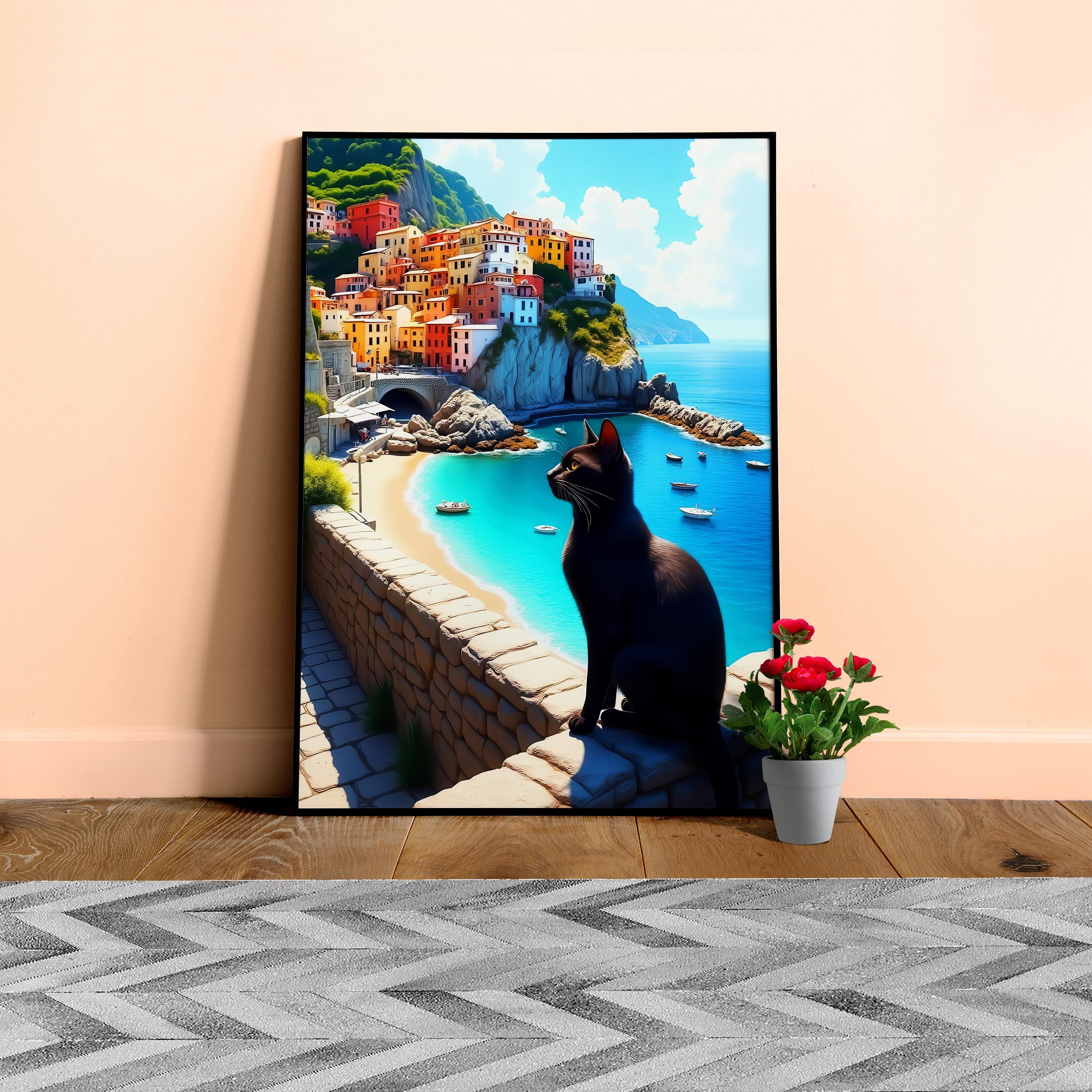 🐈🇮🇹 This Mediterranean Black Cat Poster shows a graceful cat gazing over a sunny Italian seaside town with colorful houses and blue ocean views. Perfect for cat lovers, travel enthusiasts, and fans of coastal decor, this wall art captures peaceful summer beauty and timeless charm. Bring a touch of Italy and feline elegance into your home with this stunning seaside print.