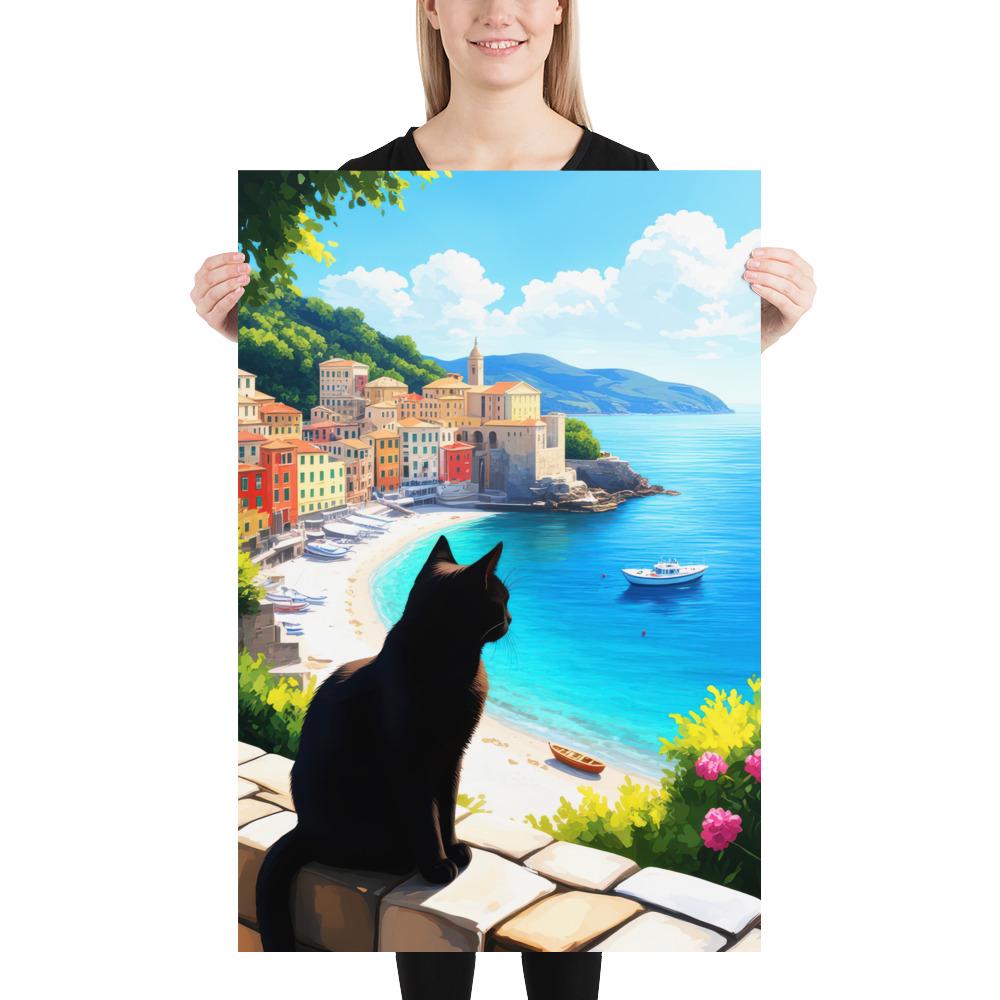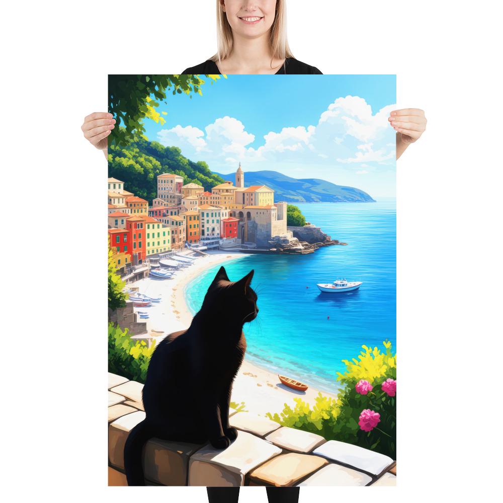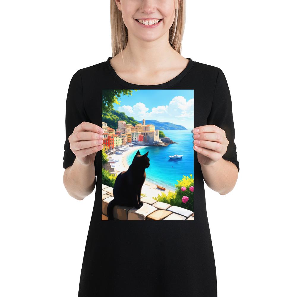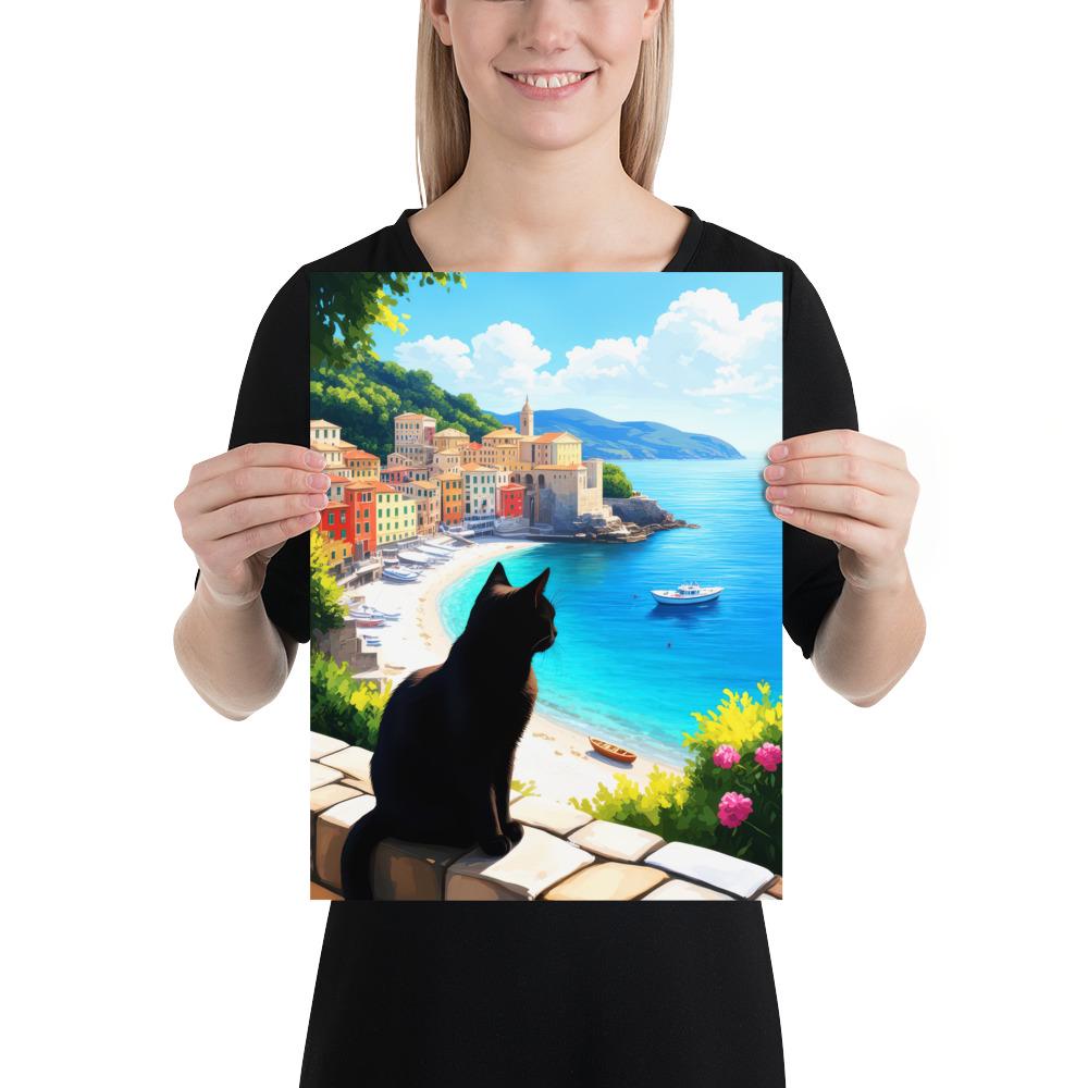 Coastal Village: Black Cat Poster – Mediterranean Wall Art, Italy Coast Painting / Seaside Cat print, Home Decor, Summer Travel Poster ⛔ HQ-quality.