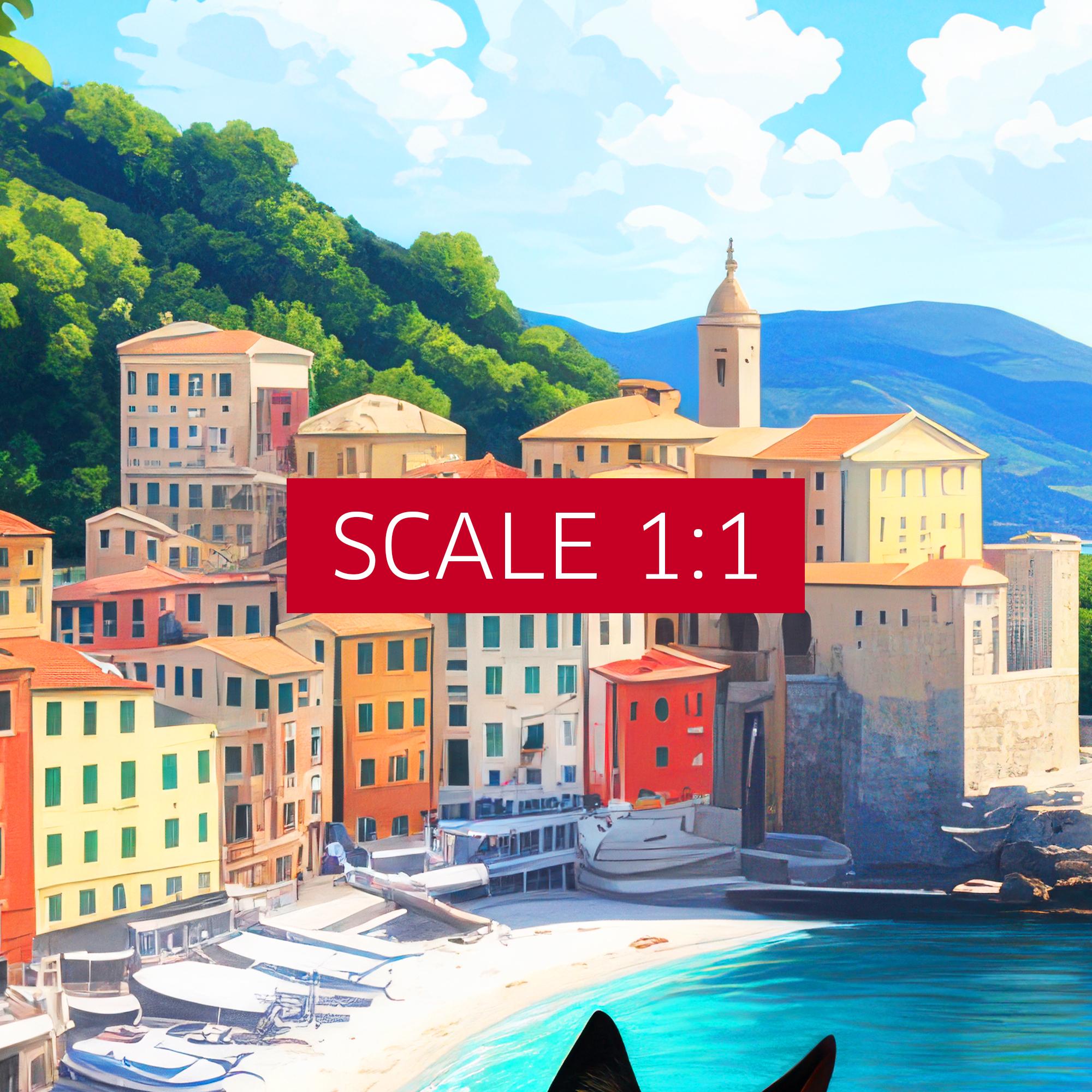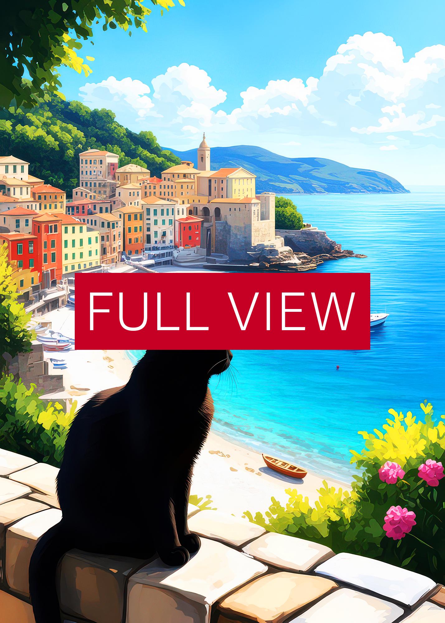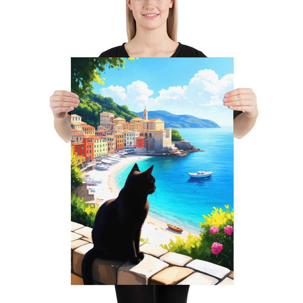 Coastal Village: Black Cat Poster – Mediterranean Wall Art, Italy Coast Painting / Seaside Cat print, Home Decor, Summer Travel Poster ⛔ HQ-quality.
