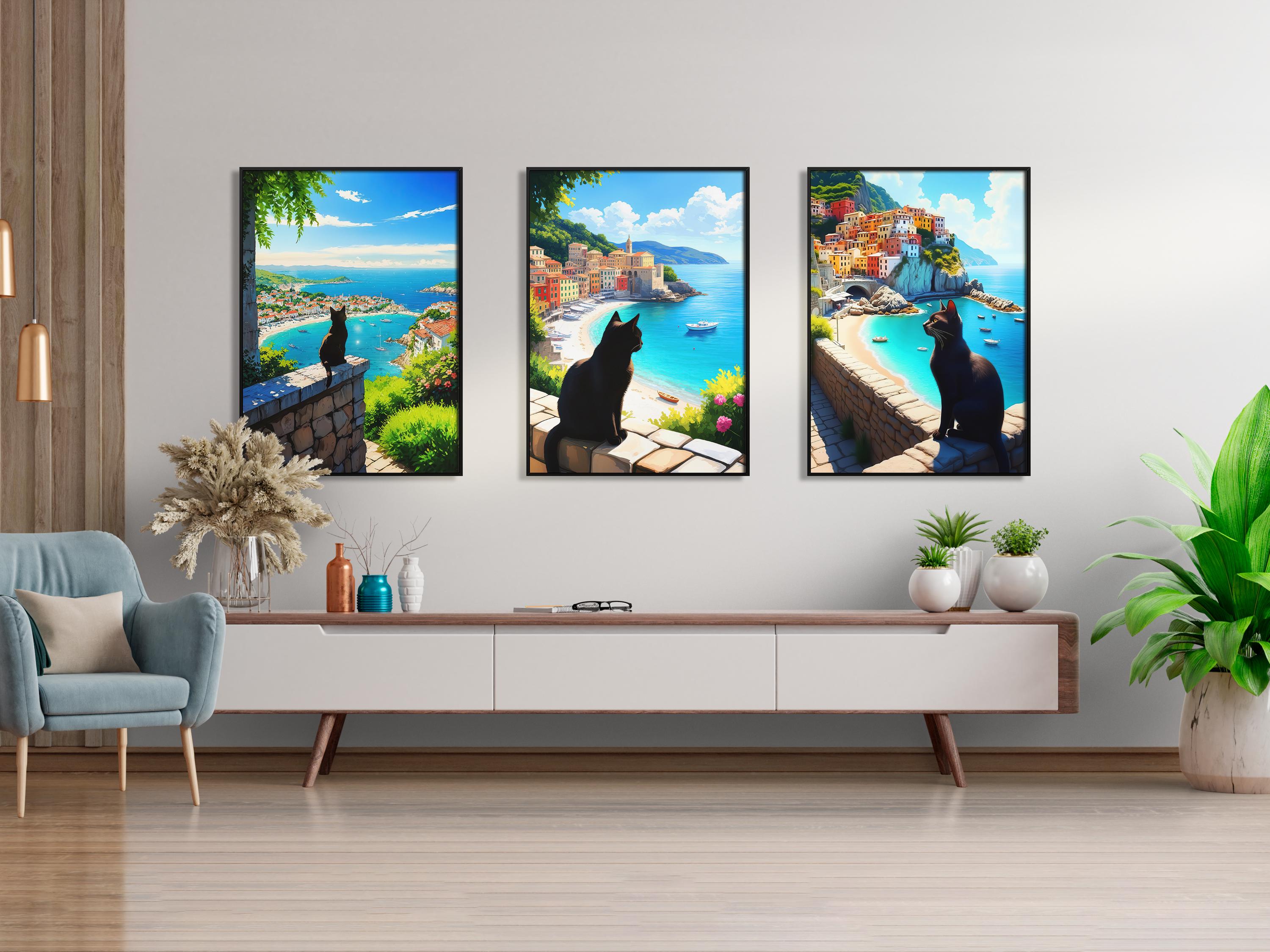 🐈🇮🇹 This Mediterranean Black Cat Poster shows a graceful cat gazing over a sunny Italian seaside town with colorful houses and blue ocean views. Perfect for cat lovers, travel enthusiasts, and fans of coastal decor, this wall art captures peaceful summer beauty and timeless charm. These Mediterranean wall art prints bring warmth, wanderlust, and feline elegance to any home decor.