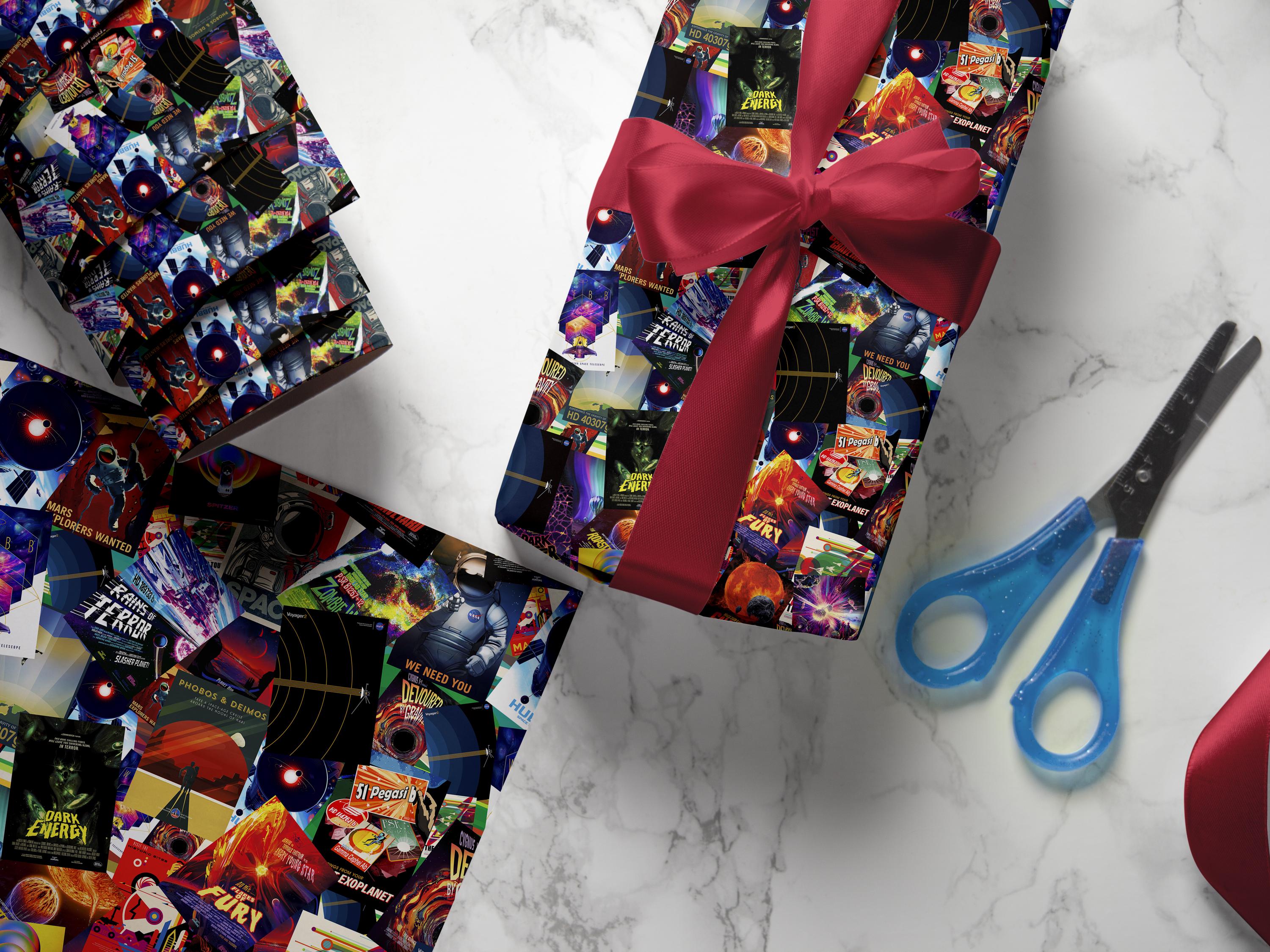 Retro Space Posters Wrapping Paper – Vintage Sci-Fi Gift Wrap for Christmas and New Year, Mid-Century Space Age Holiday Packaging ⛔ HQ-quality.