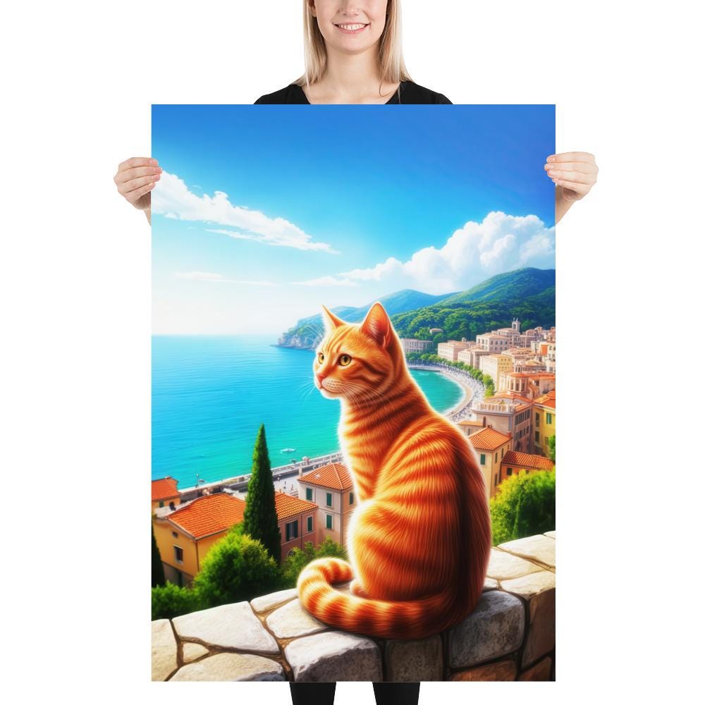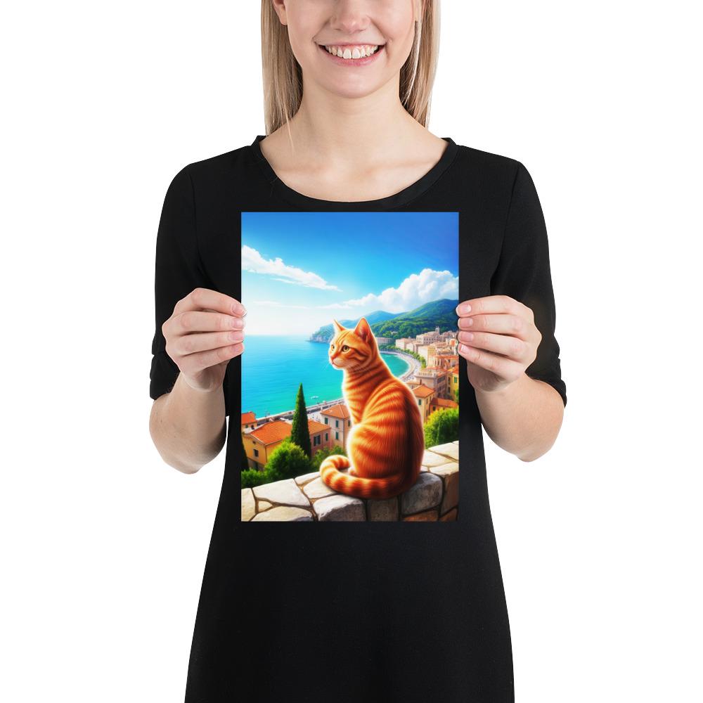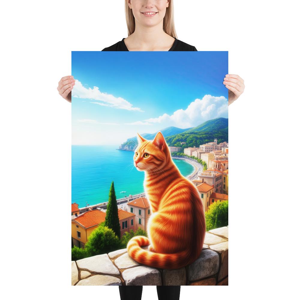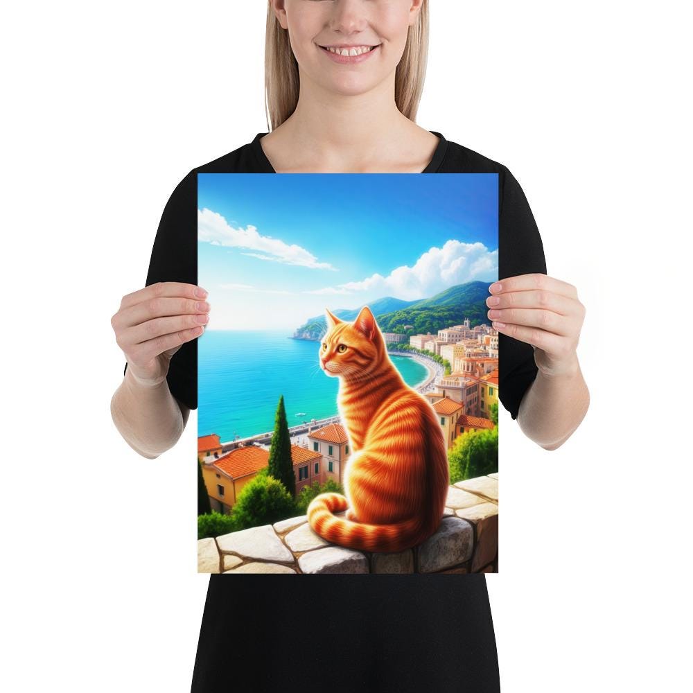 Mediterranean Orange Cat poster – Italy Coast Art Print / Ginger Cat Painting, Seaside Decor, Coastal Summer Poster, Travel Wall Art ⛔ HQ-quality.