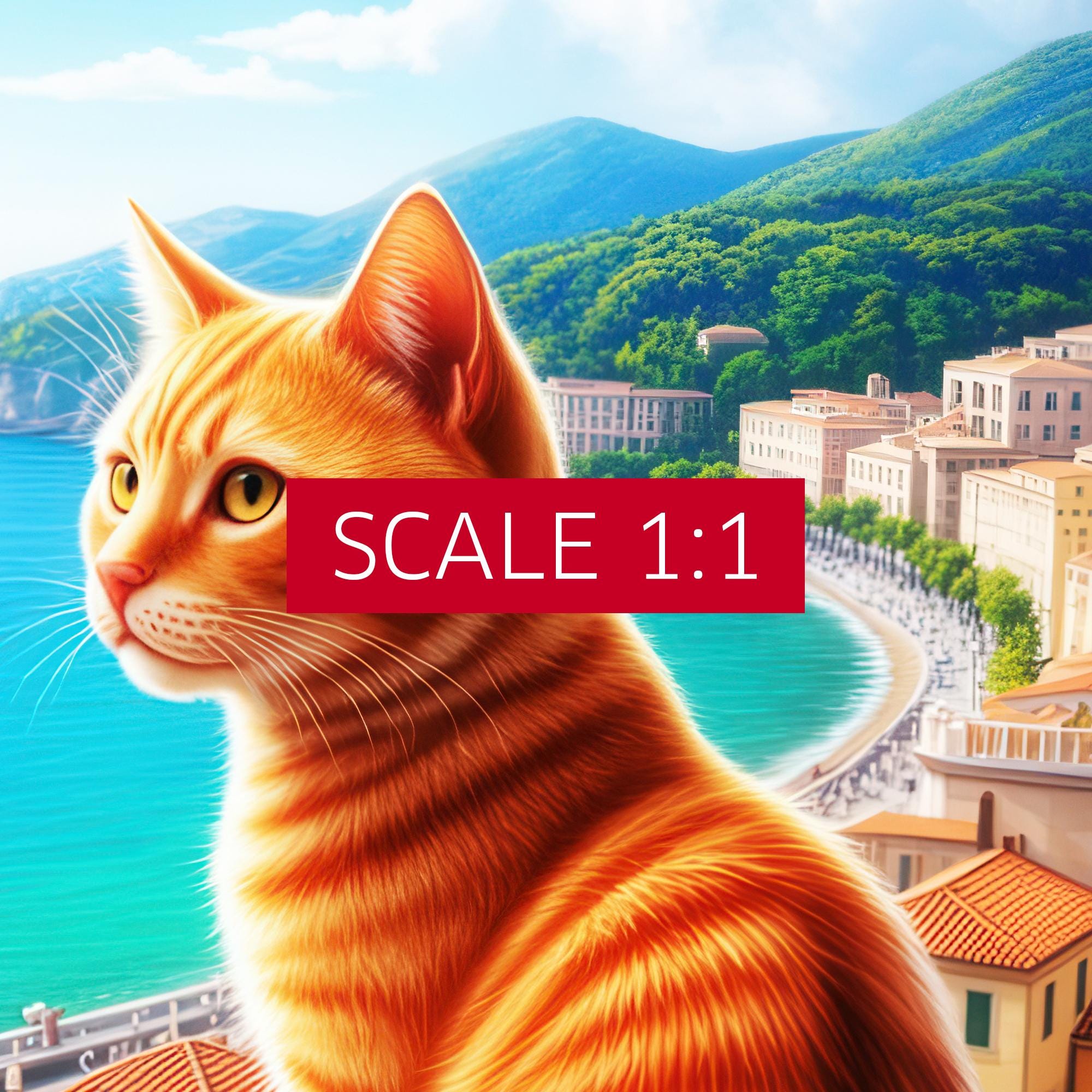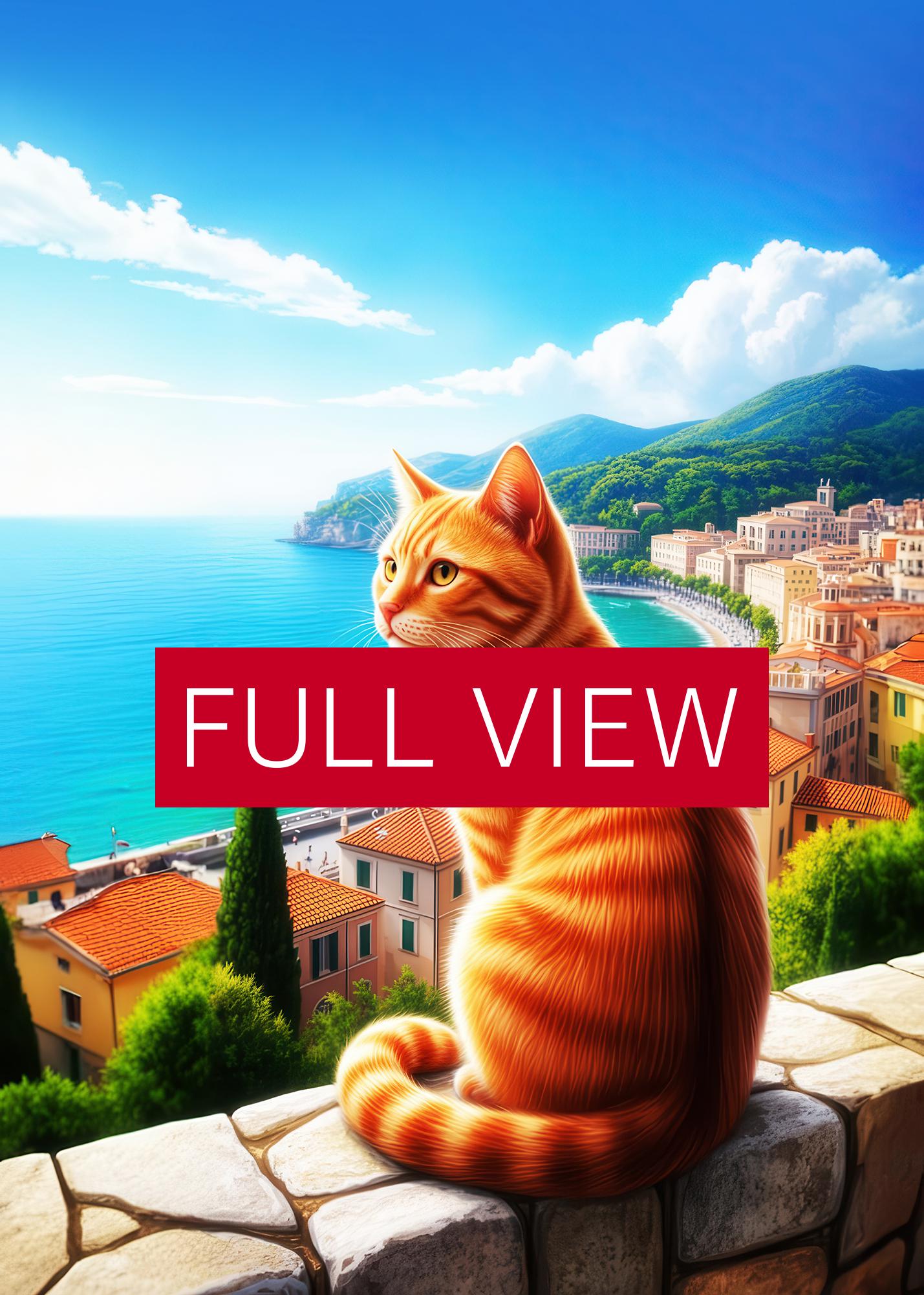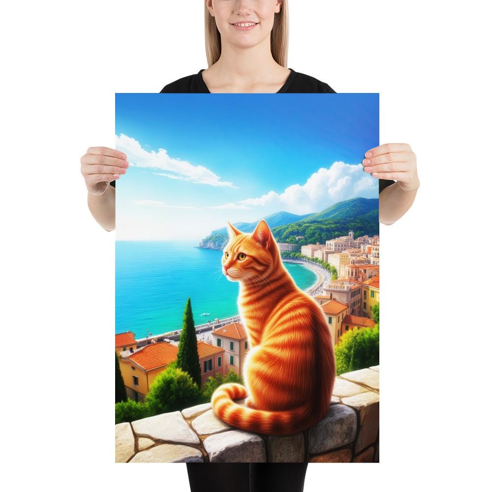 Mediterranean Orange Cat poster – Italy Coast Art Print / Ginger Cat Painting, Seaside Decor, Coastal Summer Poster, Travel Wall Art ⛔ HQ-quality.