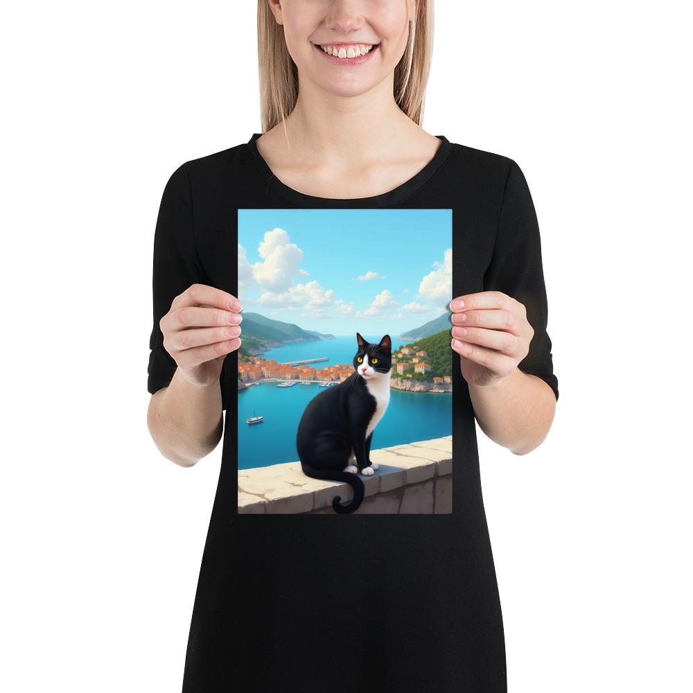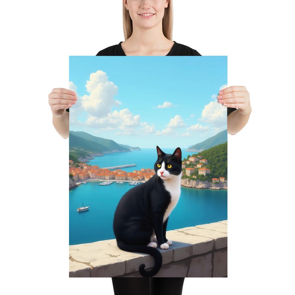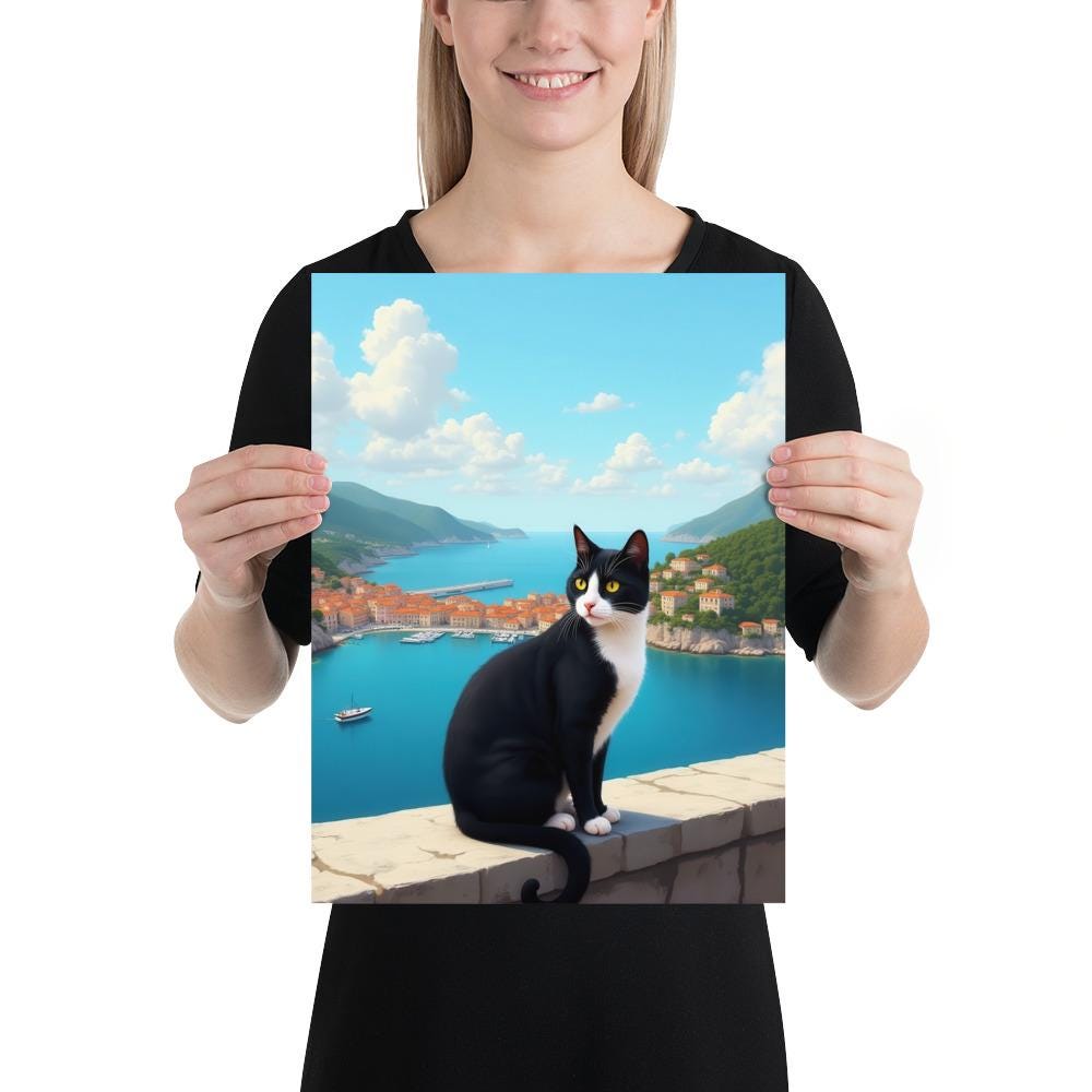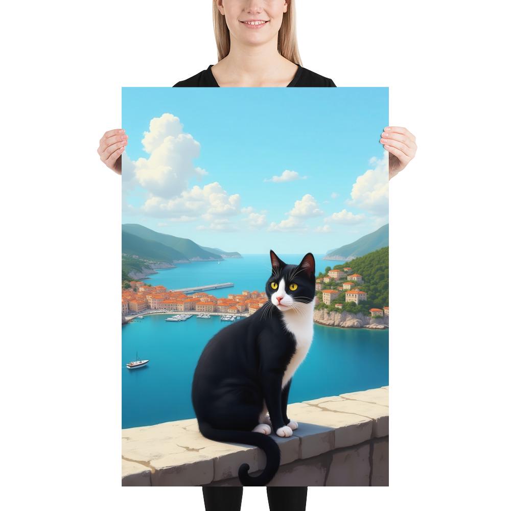 Black-White Cat Poster – Mediterranean Coastal Print, Italian Seaside Wall Art / Cat Lover Home Decor, Tranquil Travel Art ⛔ HQ-quality.