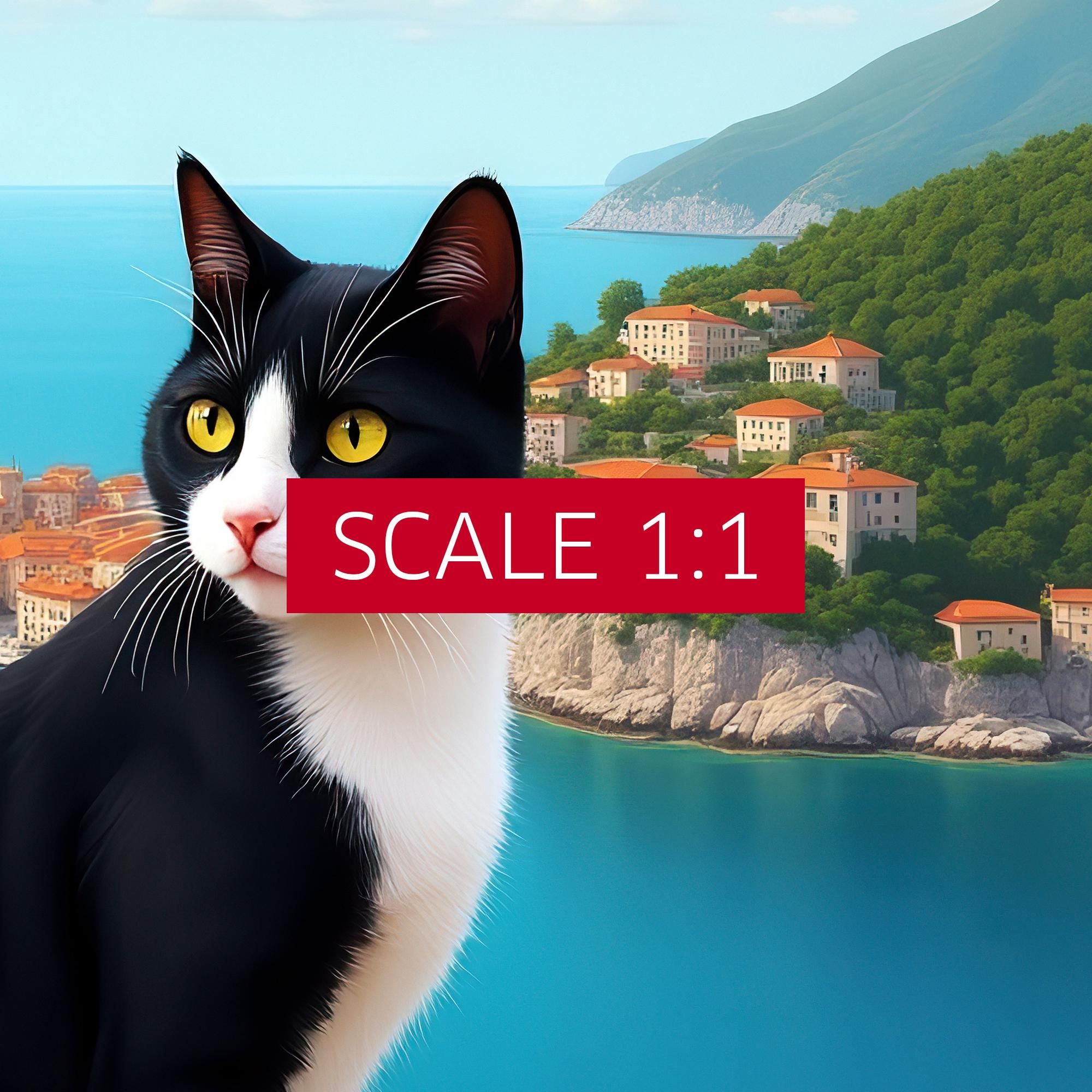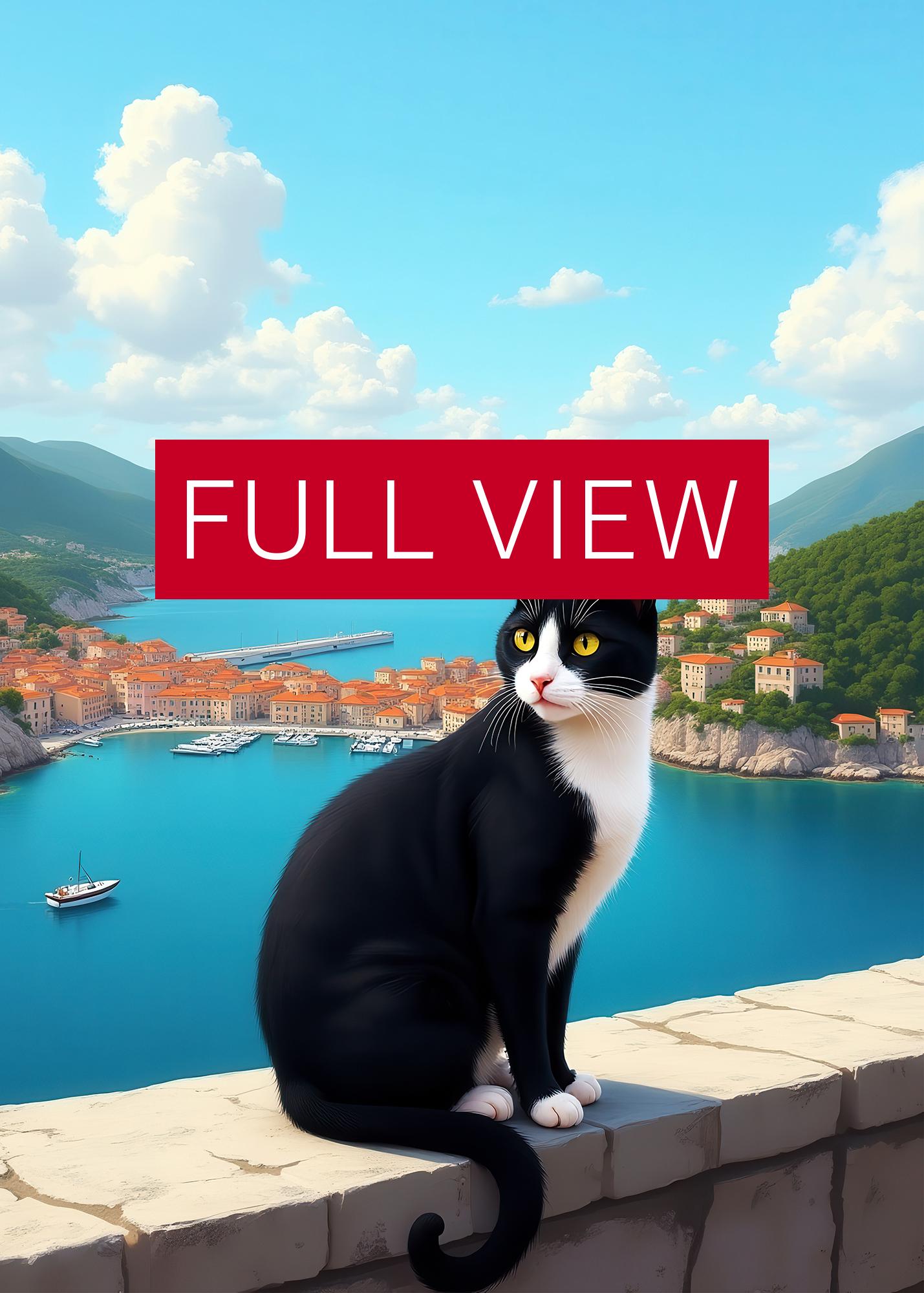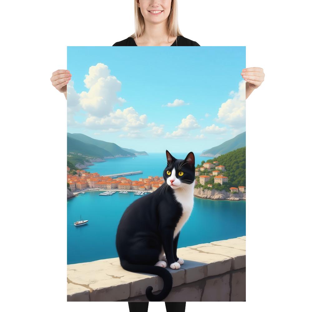 Black-White Cat Poster – Mediterranean Coastal Print, Italian Seaside Wall Art / Cat Lover Home Decor, Tranquil Travel Art ⛔ HQ-quality.