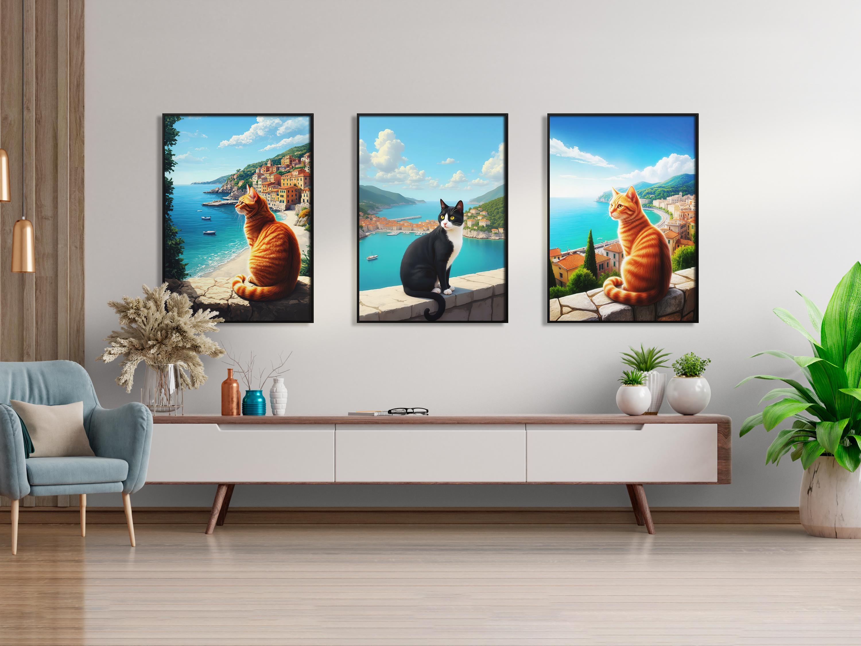 😸 This Black and White Cat Poster Series captures the charm of Mediterranean coastal towns bathed in sunlight and sea breeze. Each wall art print features a peaceful cat overlooking the blue sea and Italian-style rooftops, bringing serenity and wanderlust to your home. Perfect for cat lovers and travel dreamers who adore coastal wall art and Mediterranean vibes.