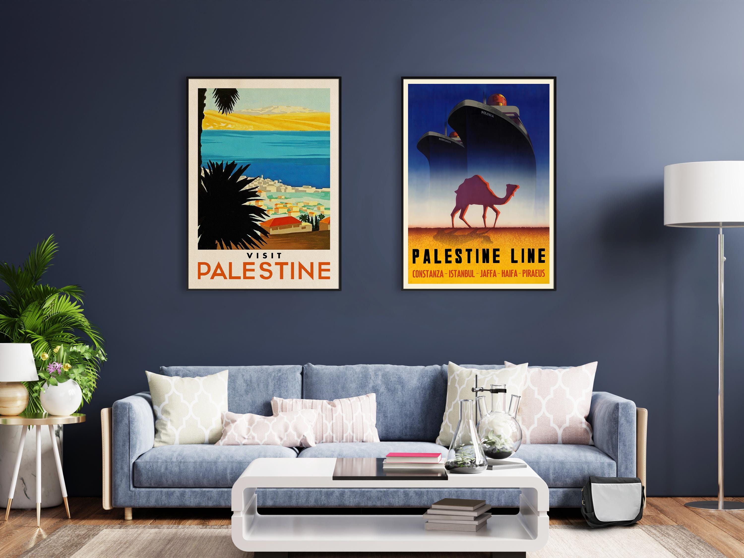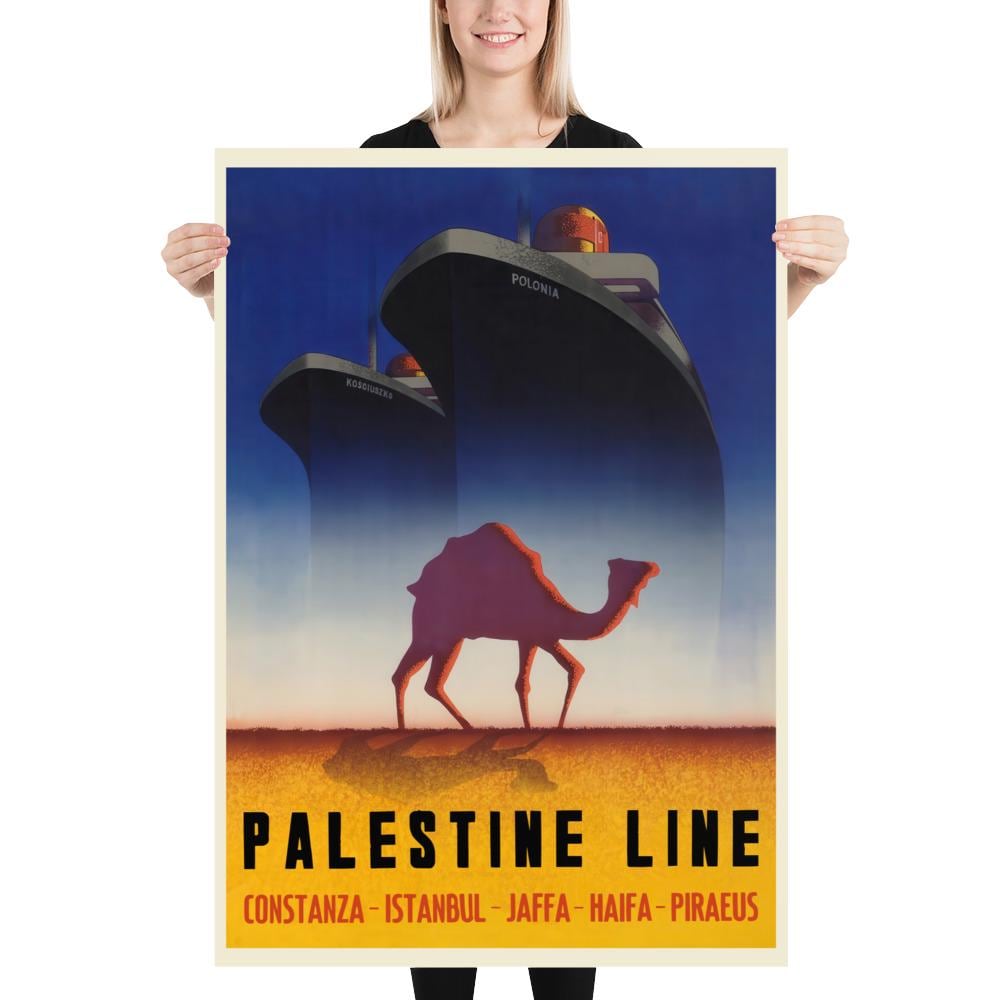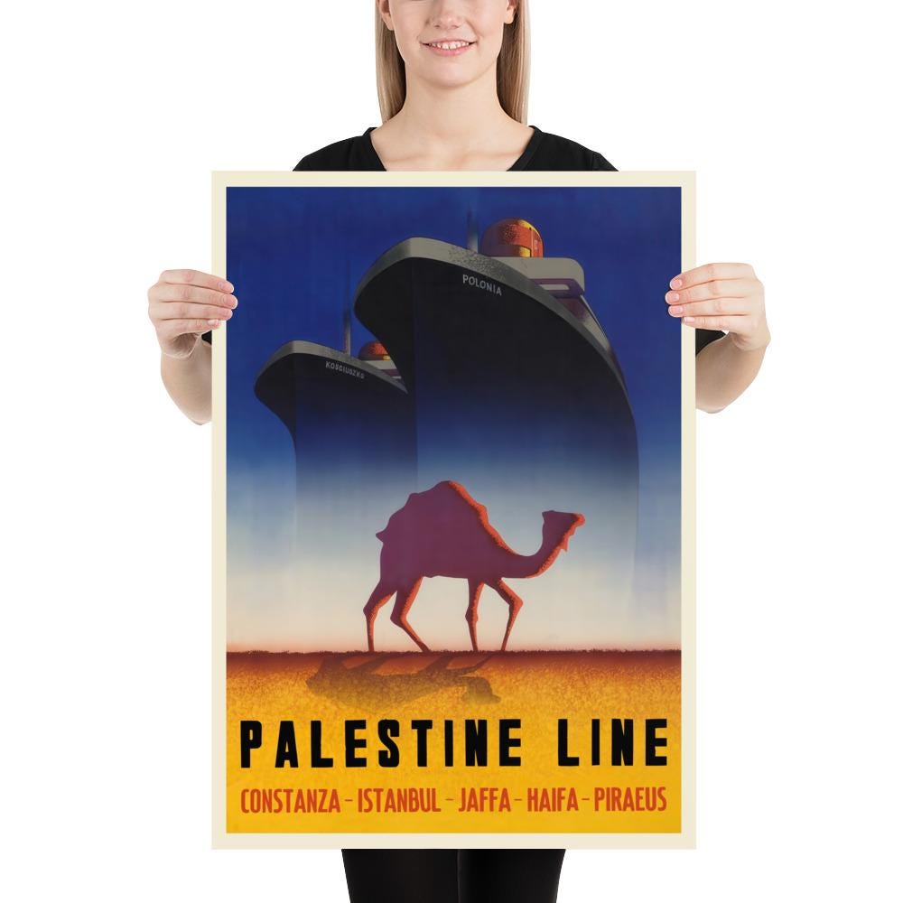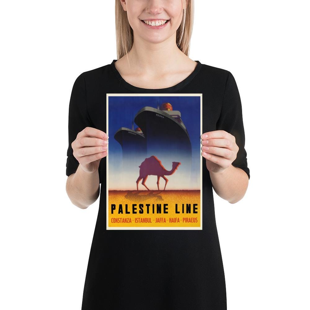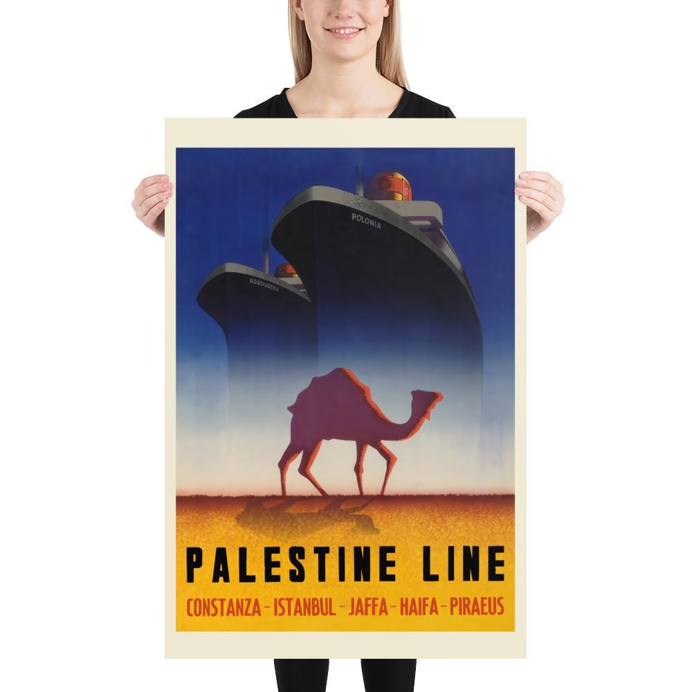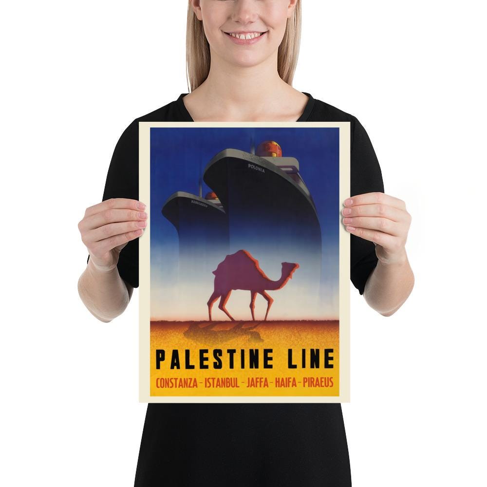 🚢 This rare Palestine Line vintage poster captures the golden age of Mediterranean travel, featuring a striking camel silhouette and majestic ocean liners. Originally created to promote voyages between Jaffa, Haifa, Istanbul, and Piraeus, this retro Palestine art print brings timeless elegance and history into any interior. Perfect for collectors of vintage travel posters, maritime art, and Middle Eastern heritage lovers.