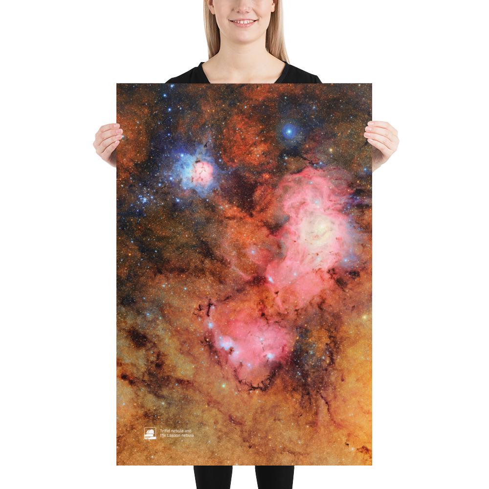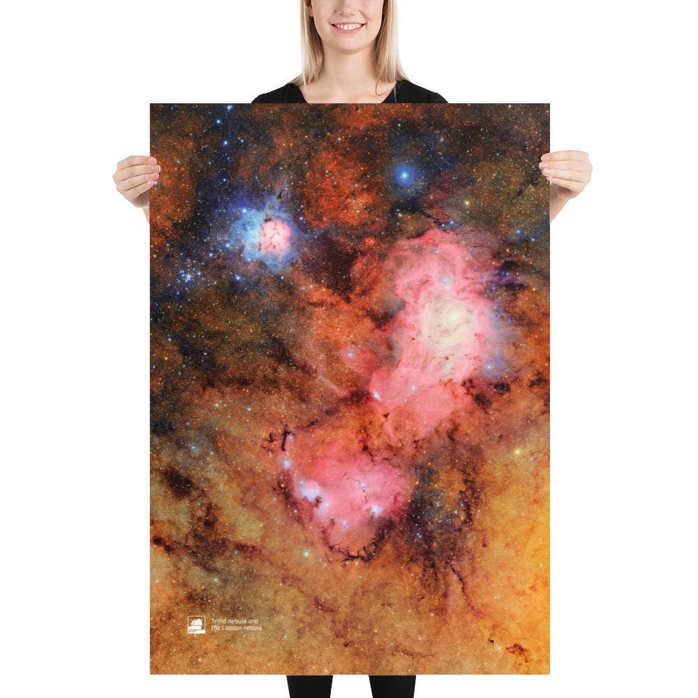 ✨ This image is made up of 678 separate photographs taken by the NSF–DOE Vera C. Rubin Observatory over a period of just over seven hours. This process clearly reveals faint or invisible details, such as the clouds of gas and dust that make up the Trifid nebula (top) and the Lagoon nebula, both of which are located several thousand light-years away from Earth. With ultra hi-res detail and vivid cosmic colors, this space poster brings the wonders of the universe right into your home.