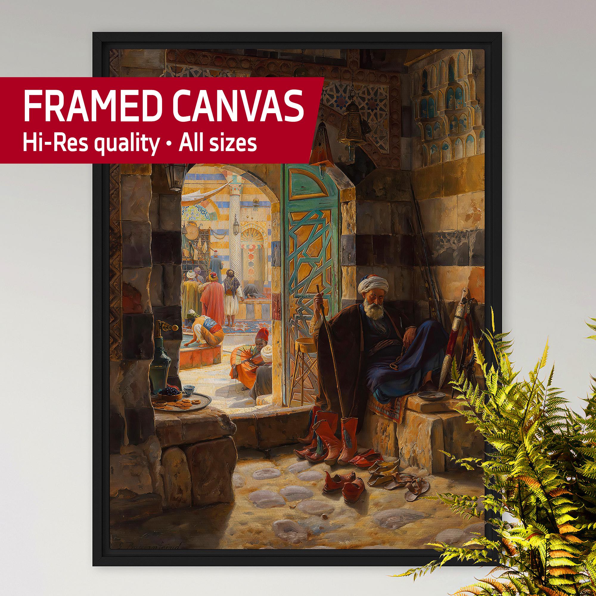 🕌 Experience the calm and detail of 19th-century Damascus with this reproduction of Warden of the Mosque, Damascus by Gustav Bauernfeind, 1891. This Orientalist painting features a quiet moment of a mosque guardian at rest, surrounded by Islamic architecture and vibrant daily life just beyond the door. Perfect for collectors of Middle Eastern art, mosque scenes, and vintage travel illustrations.