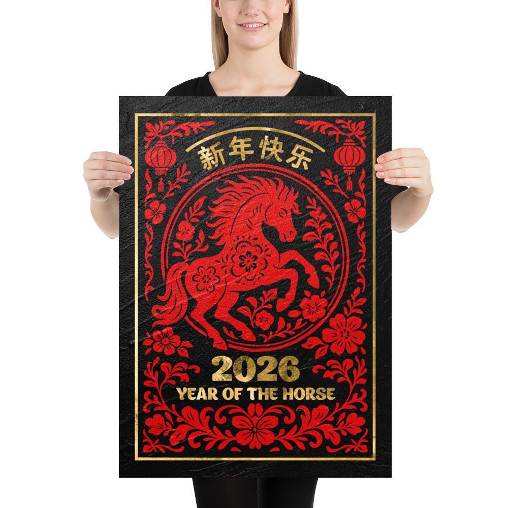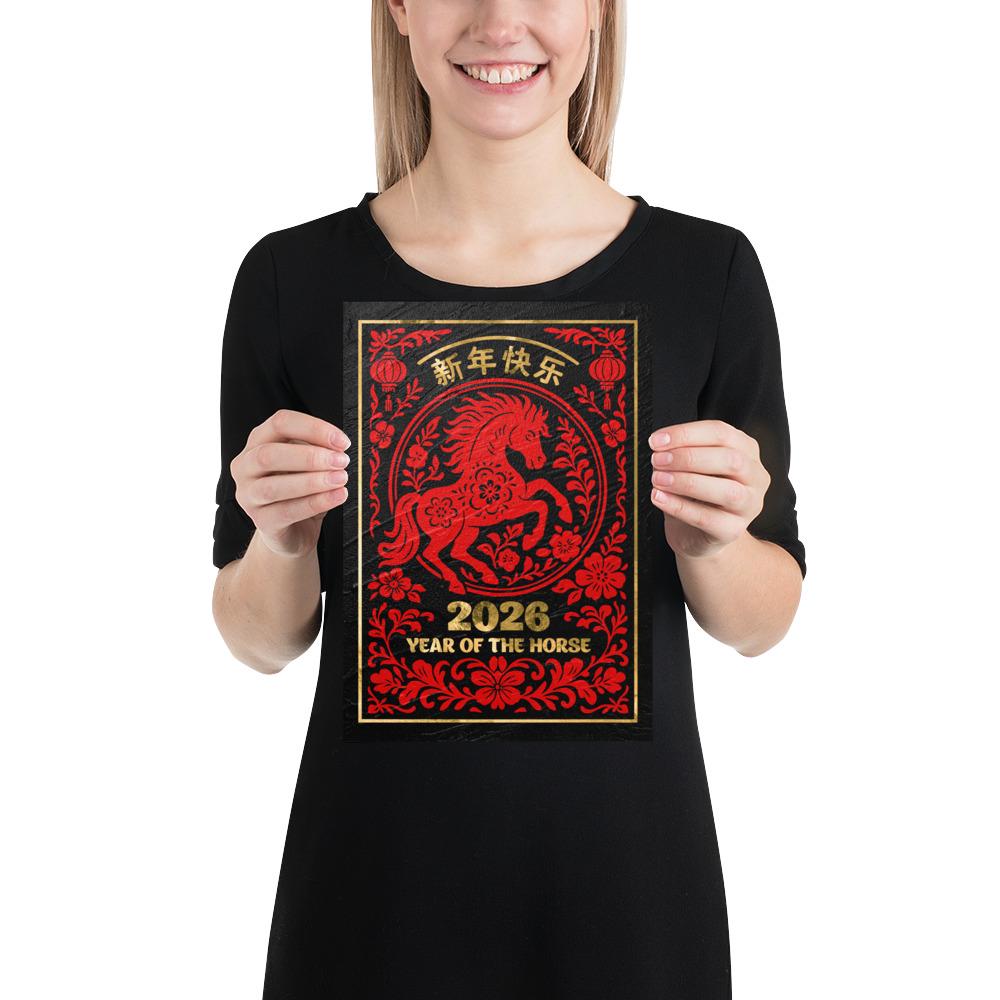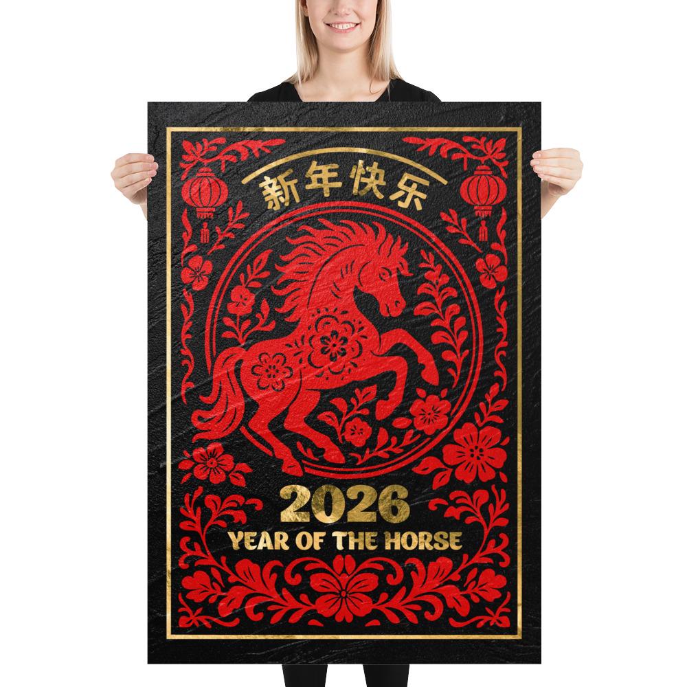Chinese Lunar New Year 2026 Horse Poster – Gold on Black Granite. Year of the Horse wall decor, Lunar New Year print ⛔ HQ-quality