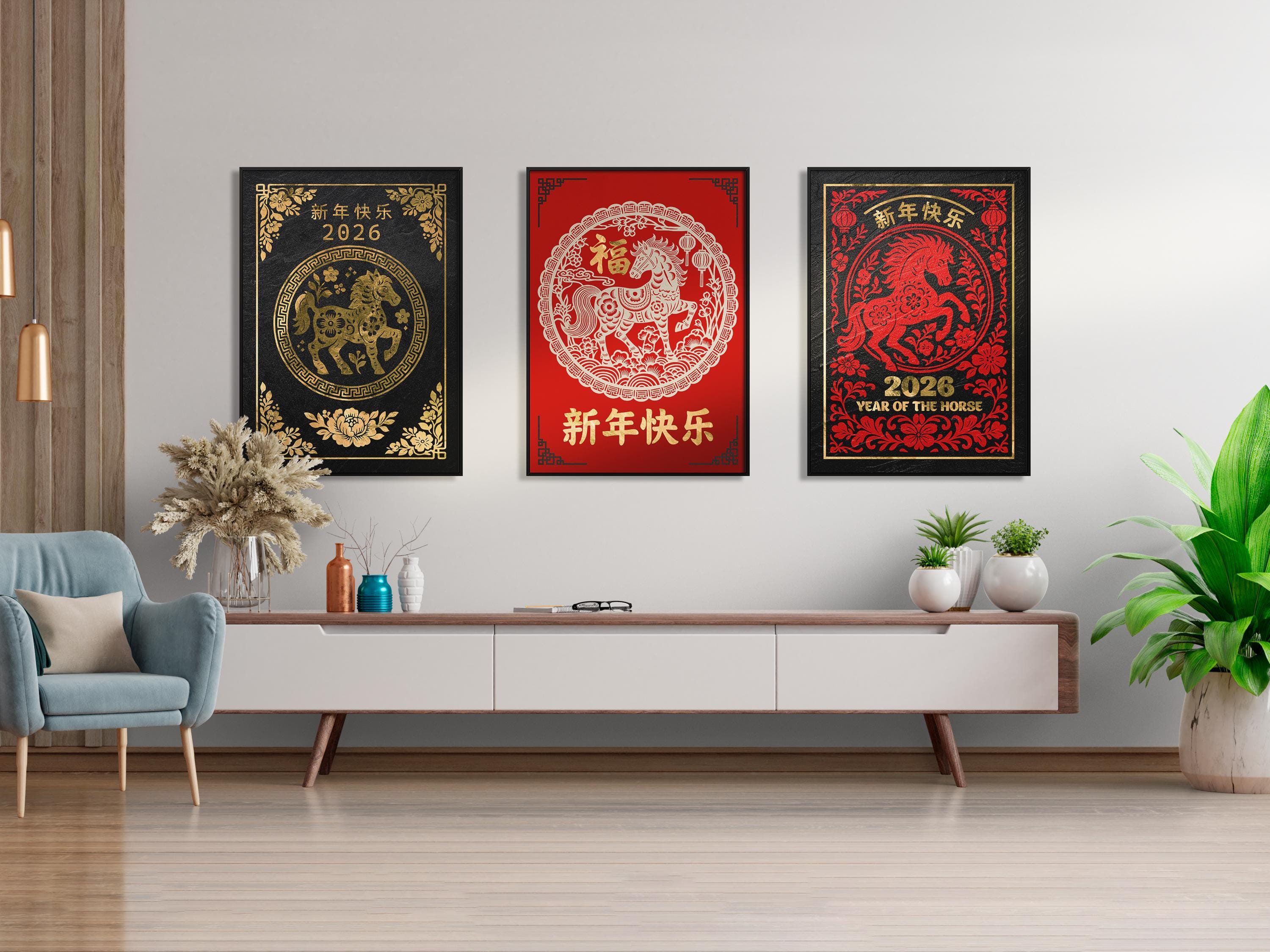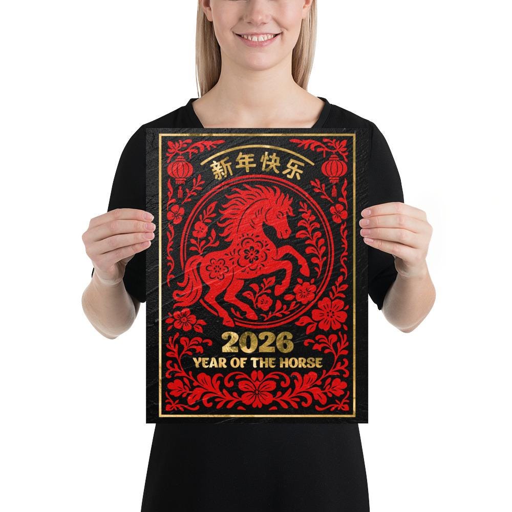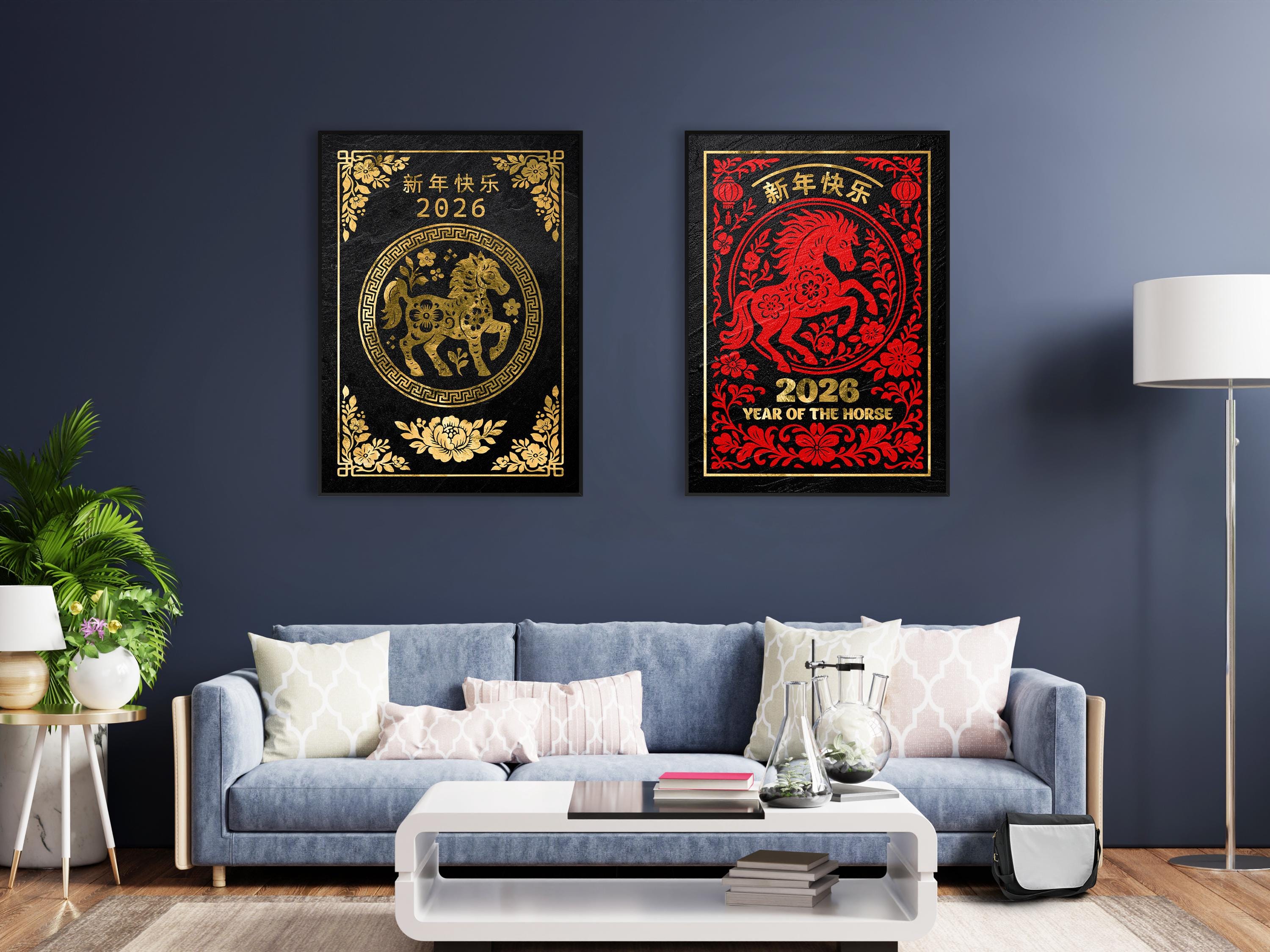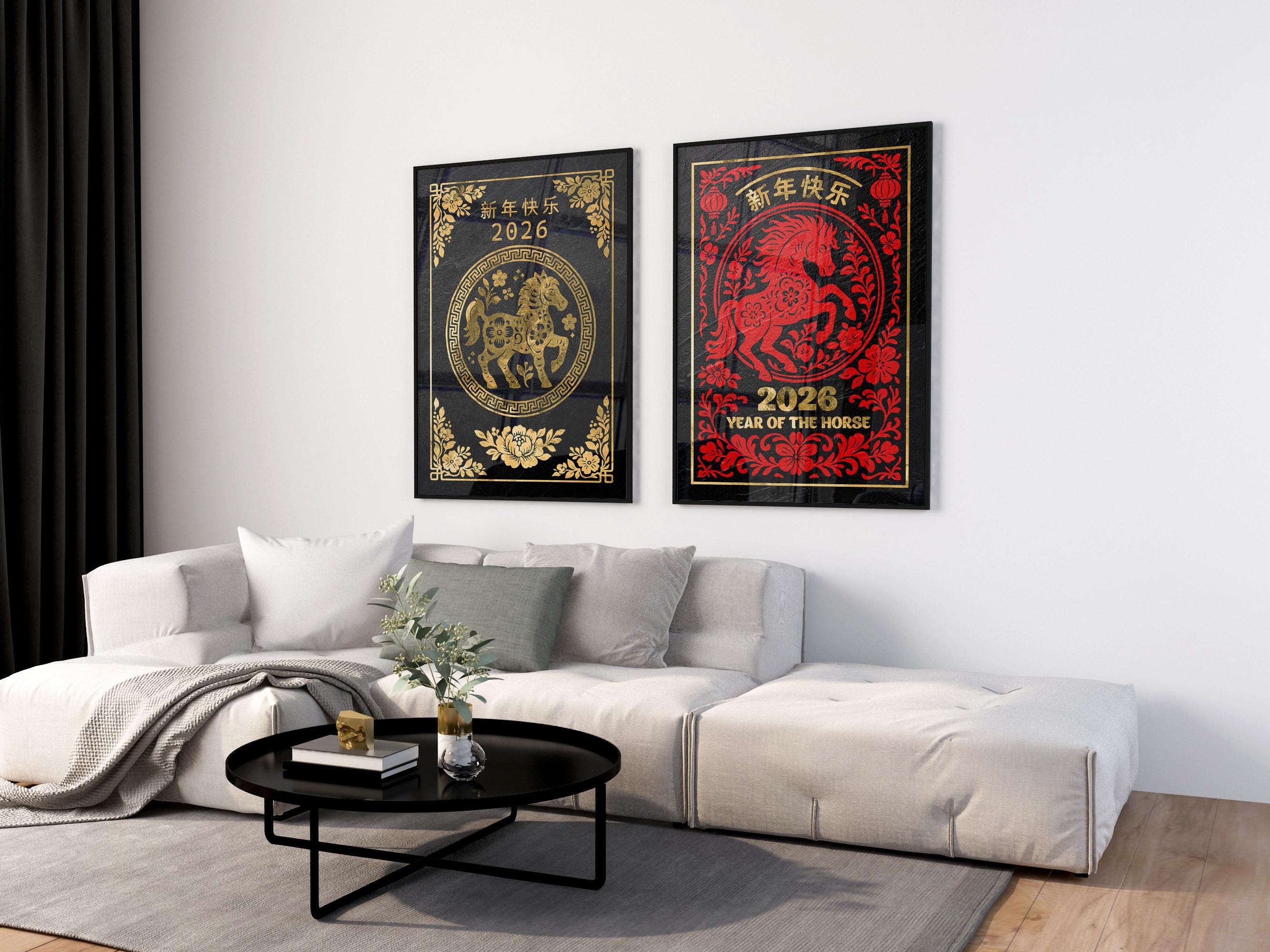 🎇 Celebrate the Chinese Lunar New Year 2026 with this luxurious black-and-gold Year of the Horse poster featuring intricate traditional patterns and refined metallic textures. This elegant wall art set brings together modern minimalism and ancient symbolism, making each Lunar New Year print perfect for festive décor or as a meaningful gift. Every design from this 4-poster collection highlights the beauty of gold on granite, adding a timeless touch to your Chinese New Year celebration.