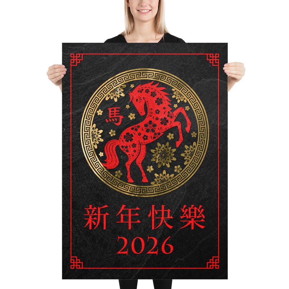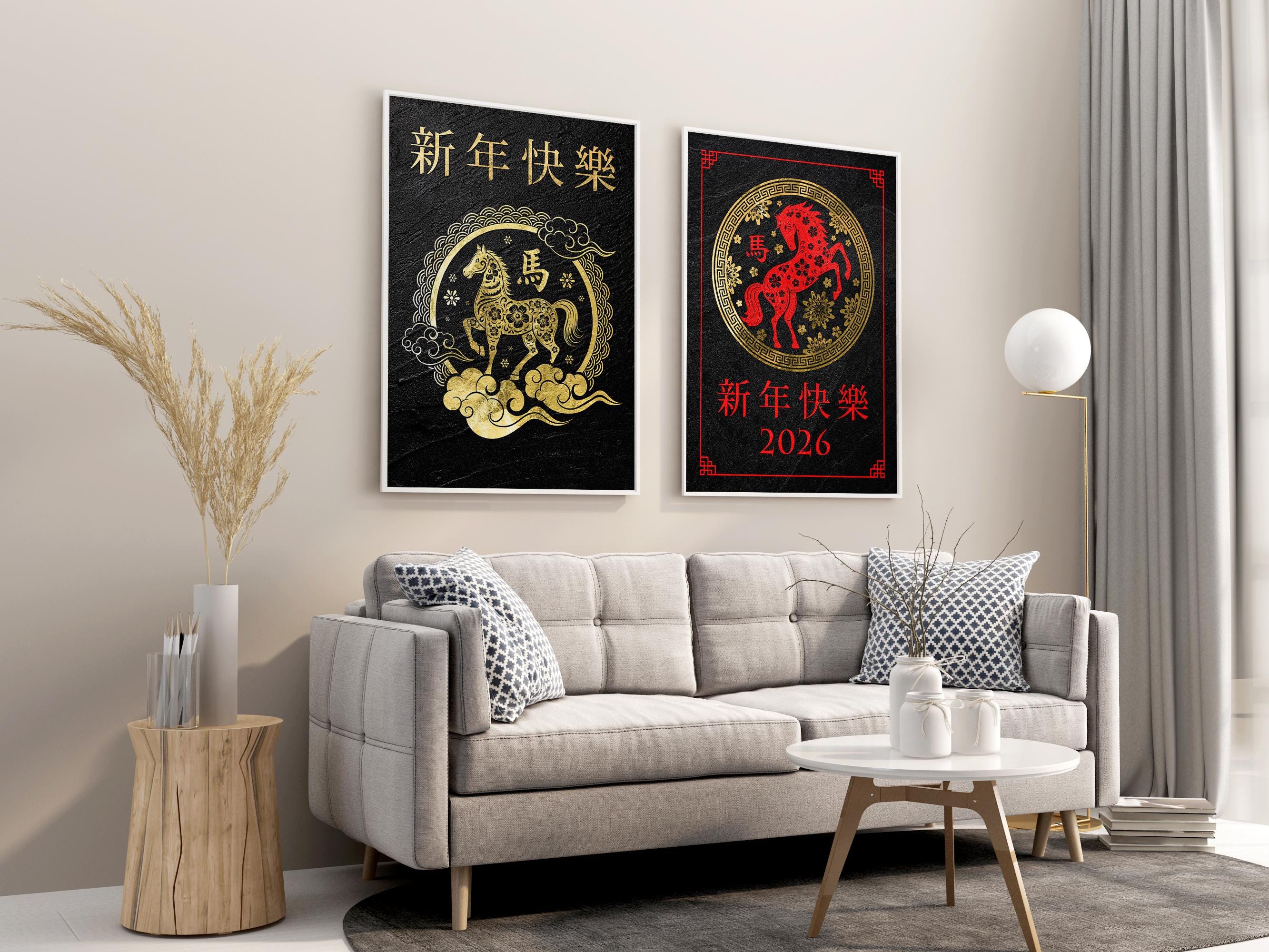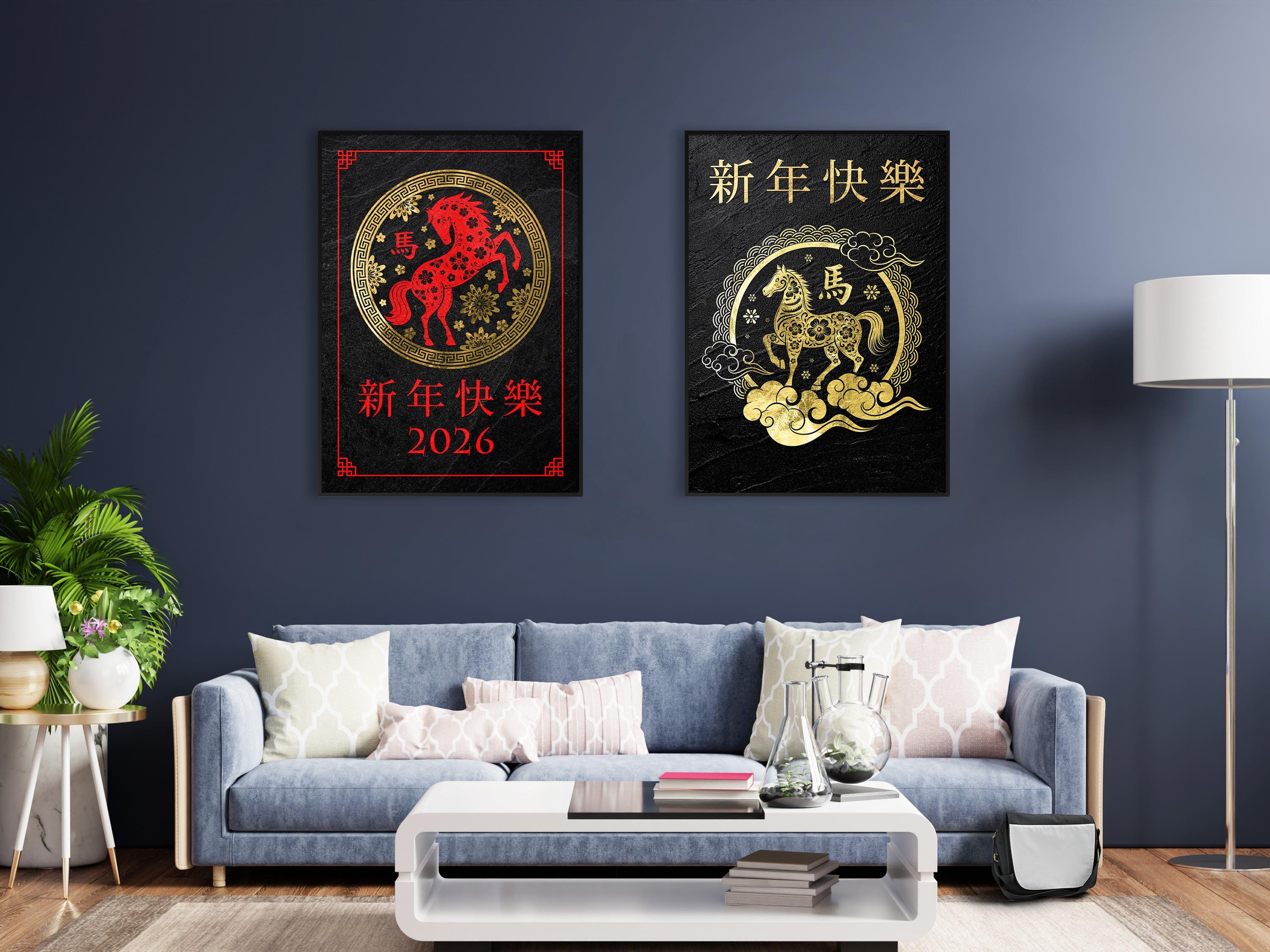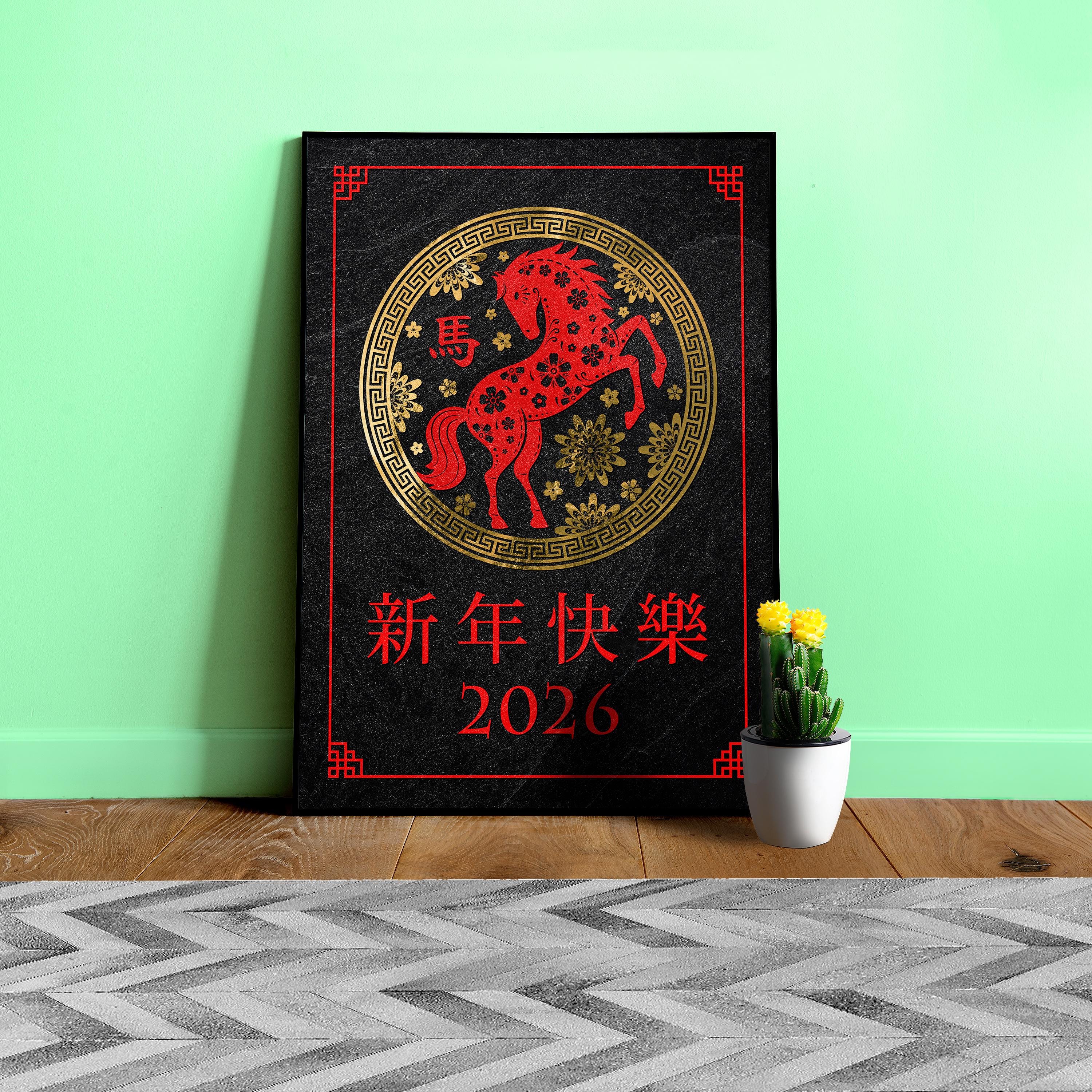 🎉 Bring prosperity and bold festive style into your home with this premium Chinese Lunar New Year 2026 – Year of the Horse poster crafted in striking gold on black granite. The artwork blends traditional Chinese symbolism with elegant modern design, making it a standout piece for Lunar New Year decor or a meaningful gift for loved ones. Part of a 4-poster collection, each print showcases refined golden details that honor the spirit, strength, and good fortune of the Horse year.