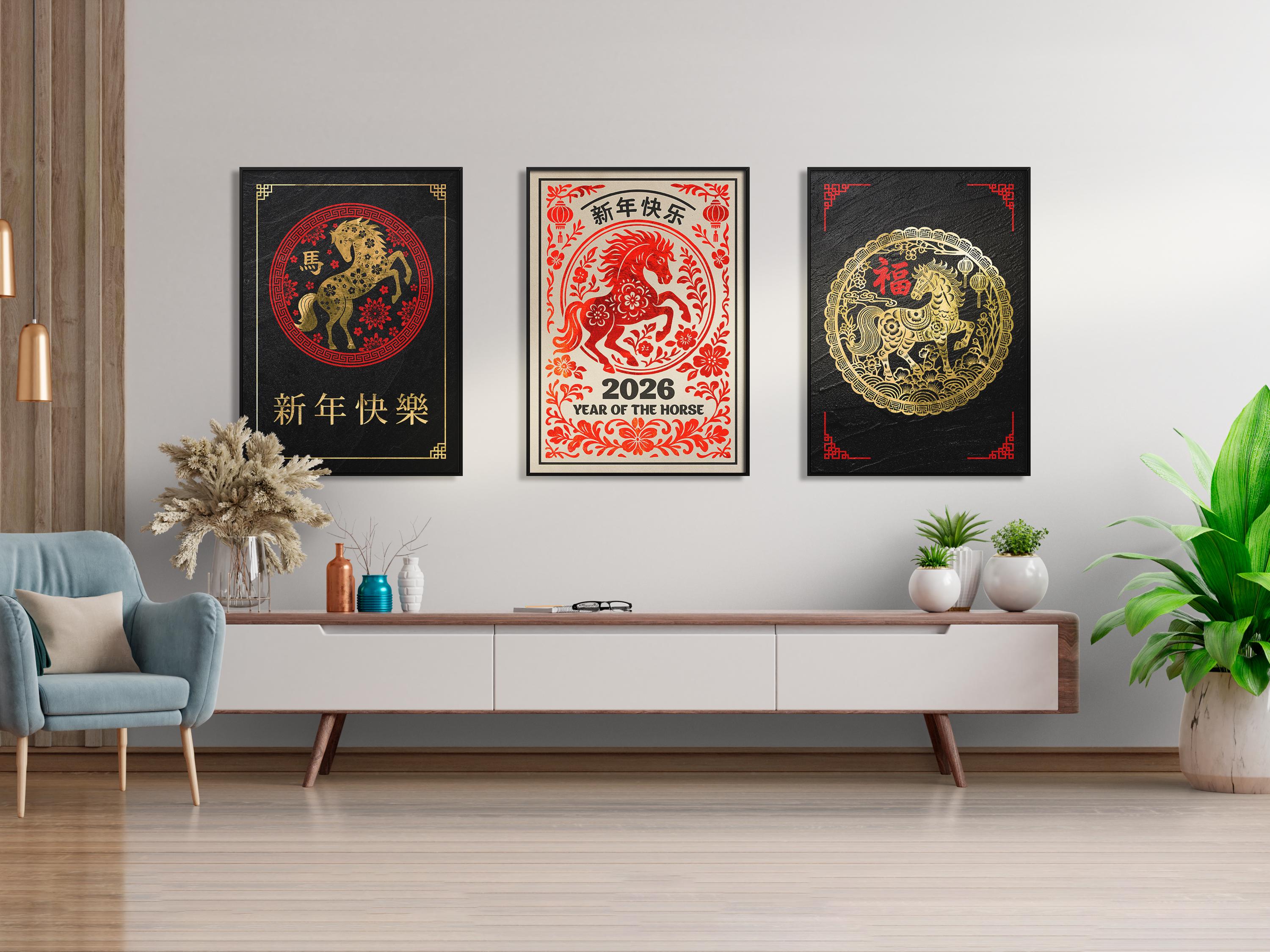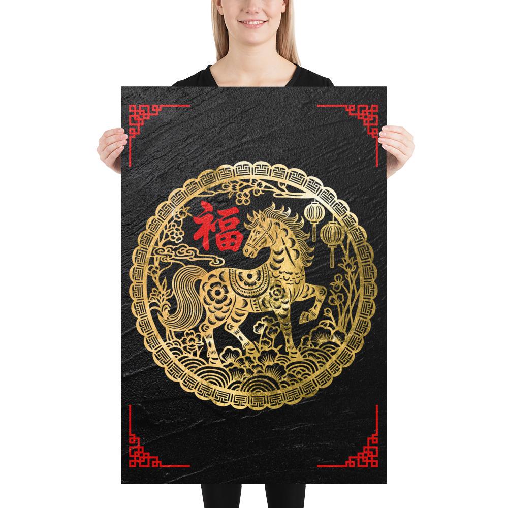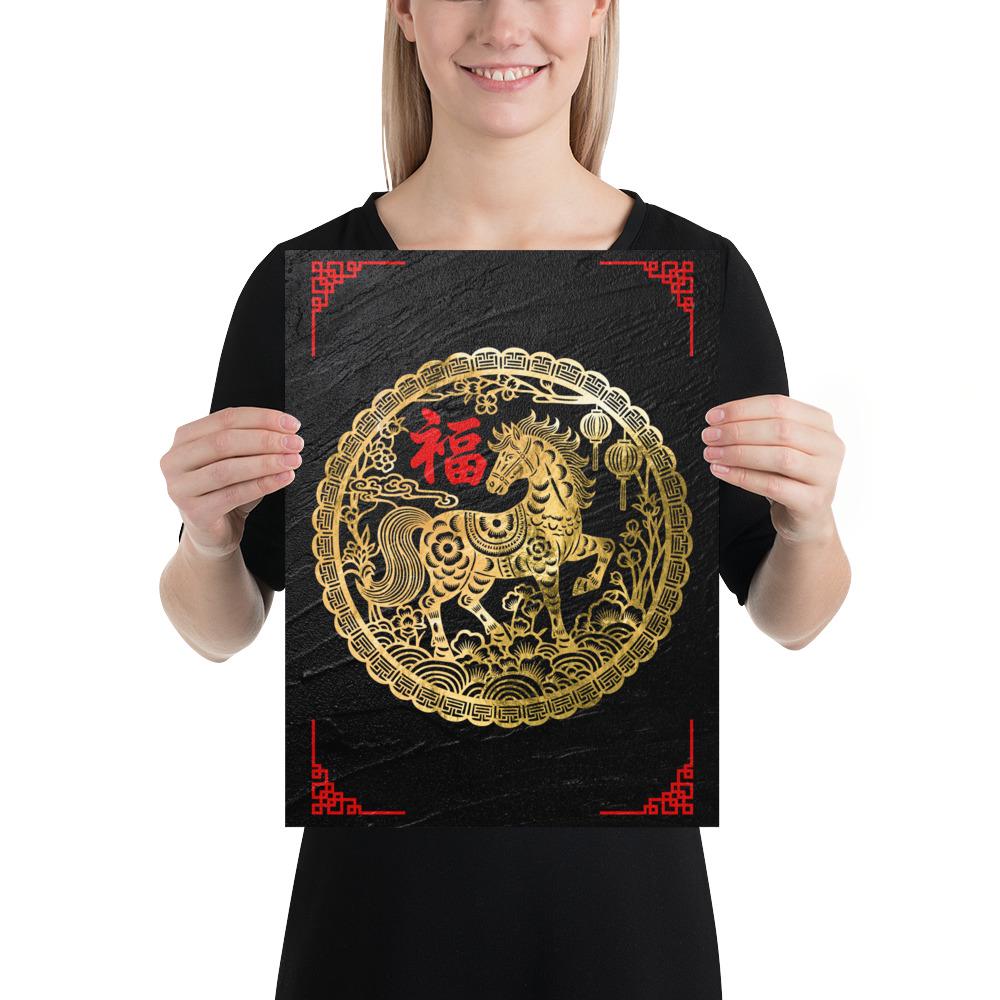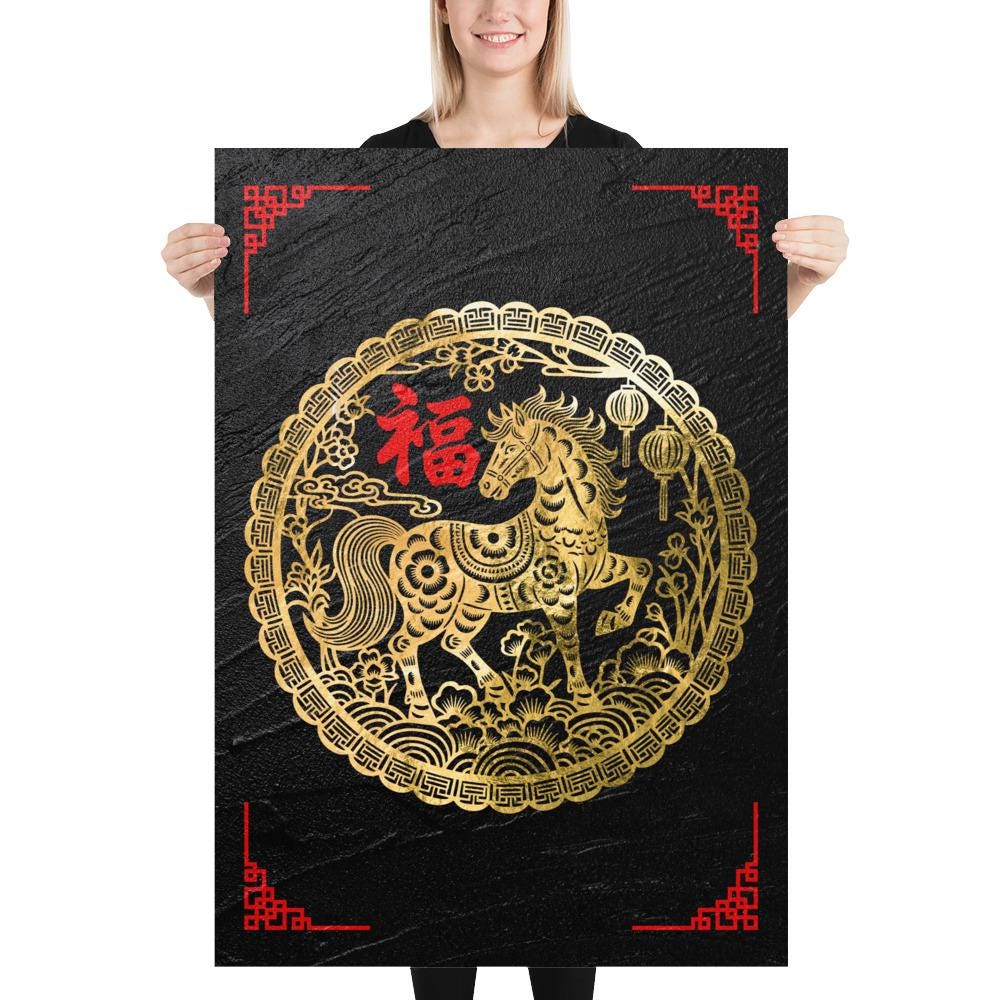 🎉 Bring prosperity and bold festive style into your home with this premium Chinese Lunar New Year 2026 – Year of the Horse poster crafted in striking gold on black granite. The artwork blends traditional Chinese symbolism with elegant modern design, making it a standout piece for Lunar New Year decor or a meaningful gift for loved ones. Part of a 4-poster collection, each print showcases refined golden details that honor the spirit, strength, and good fortune of the Horse year.