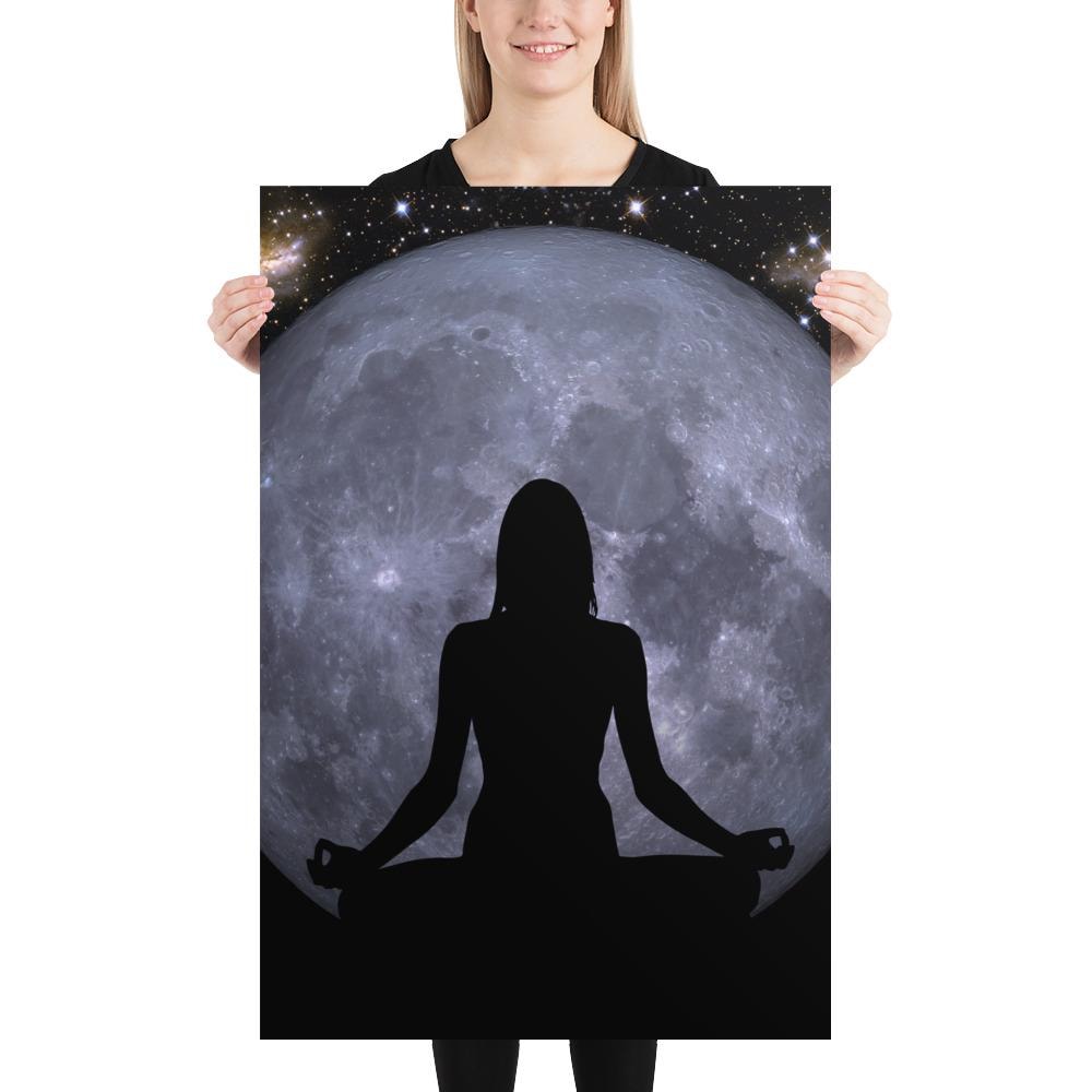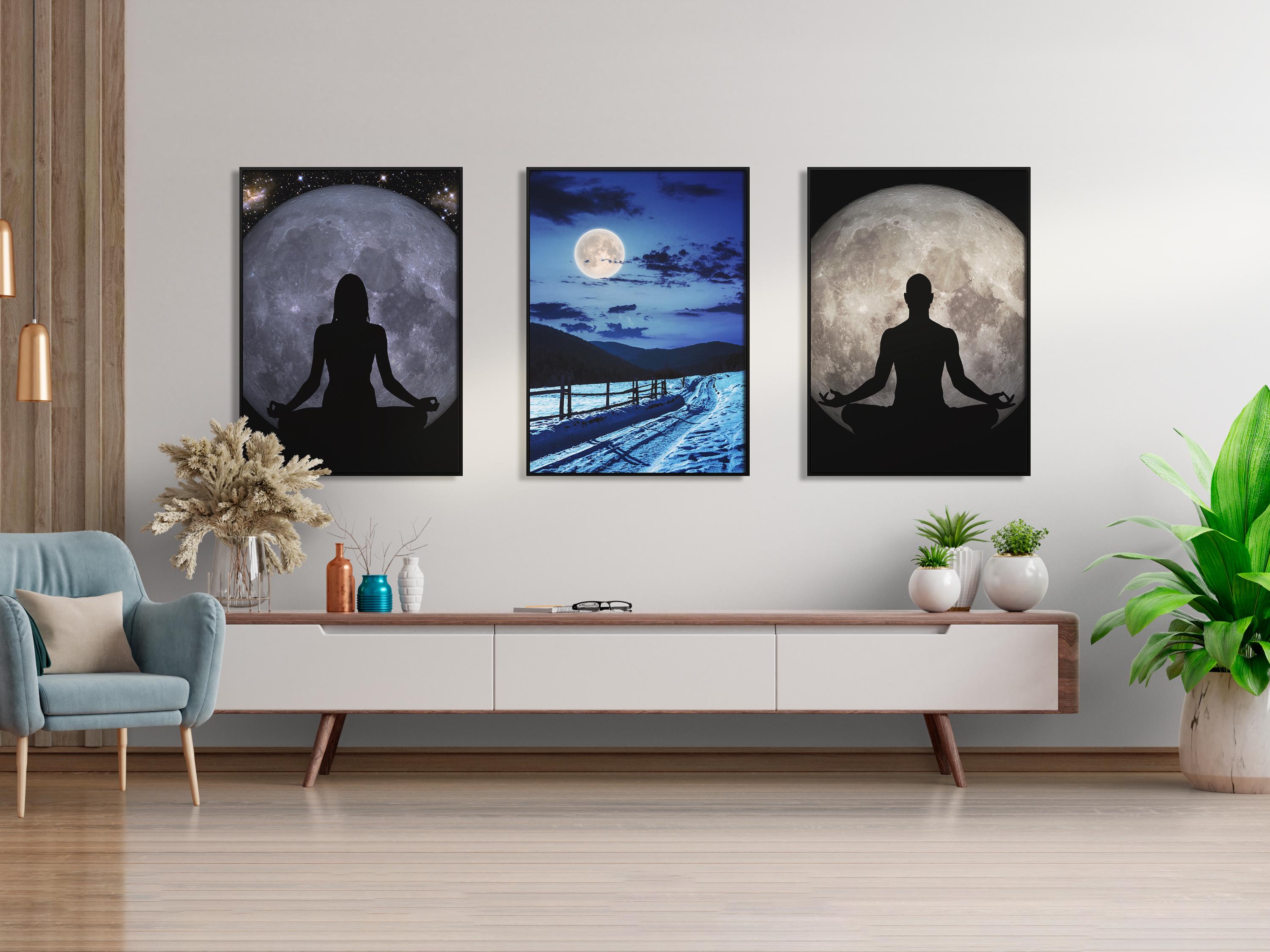 🌕 This moon meditation poster features a calm woman silhouette sitting in lotus pose against a full moon on a deep black background, creating powerful spiritual wall art with a minimalist aesthetic. The contrast of the giant moon and meditating woman evokes yoga decor, zen art, and mindfulness art, perfect for a meditation room or modern interior. This atmospheric moon wall art blends mystical art, night sky art, and cosmic decor into a striking minimalist poster for contemplative spaces.