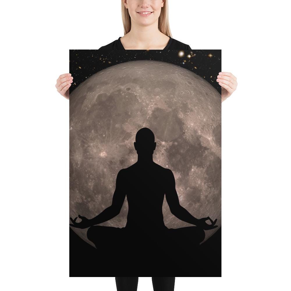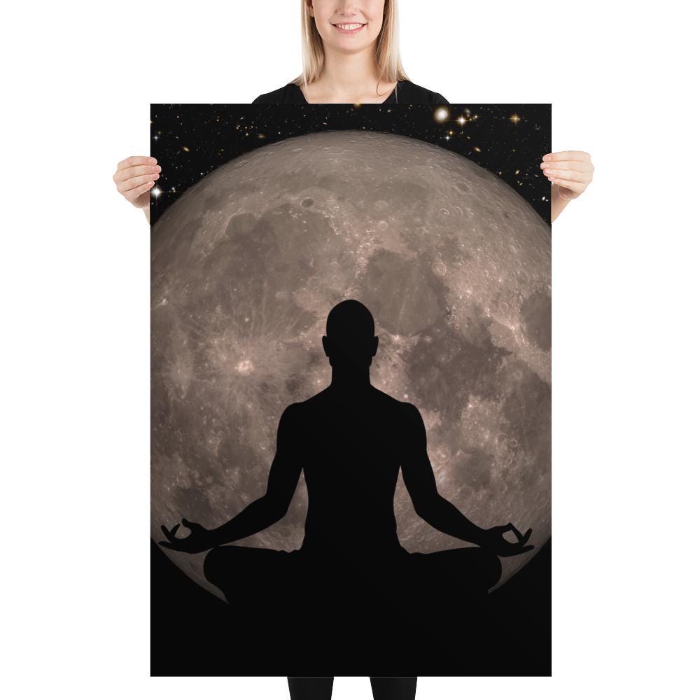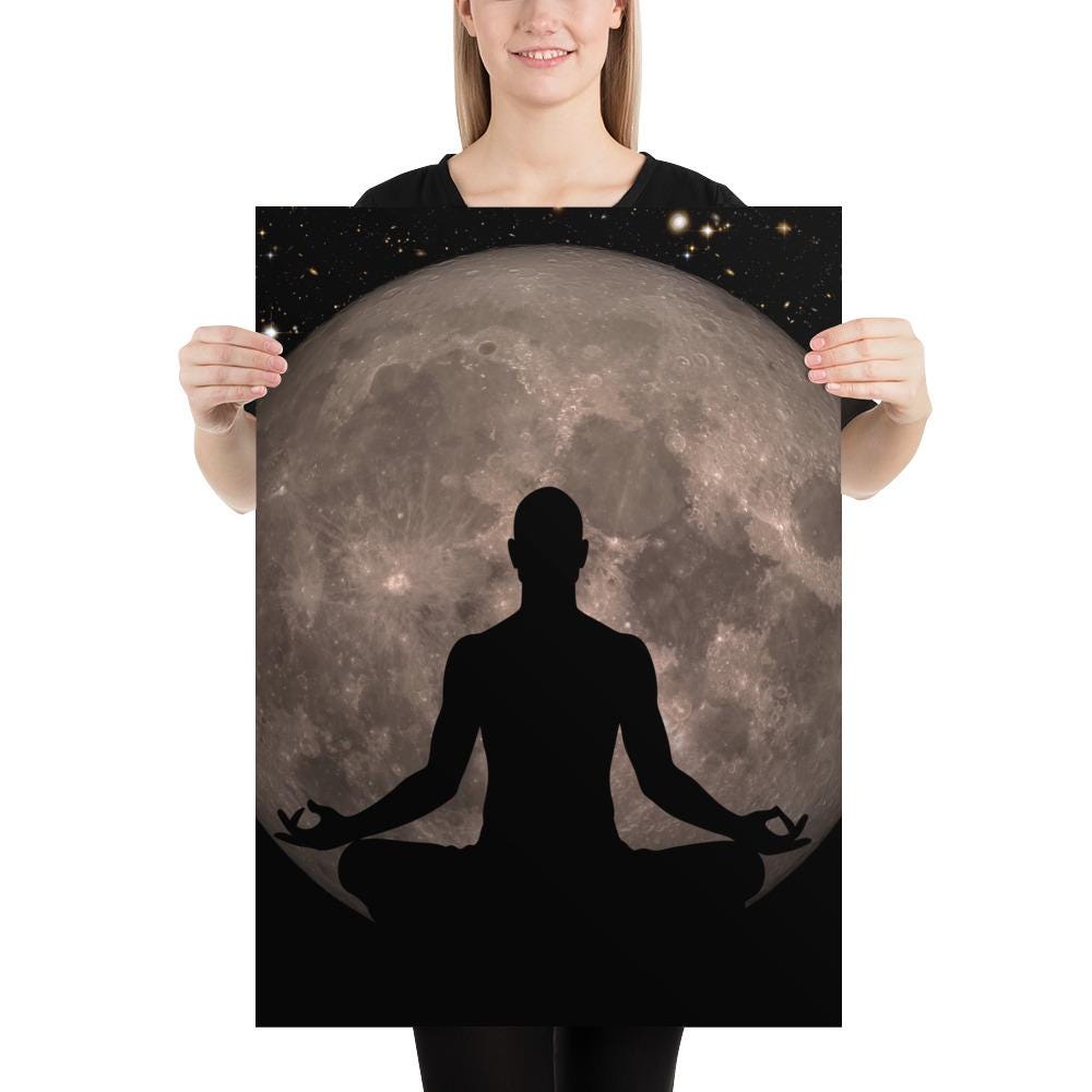 Full Moon Meditation Poster – Man Silhouette in Lotus Pose with Full Moon. Cosmos and Universe black art print, Yoga decor ⛔ HQ-quality.