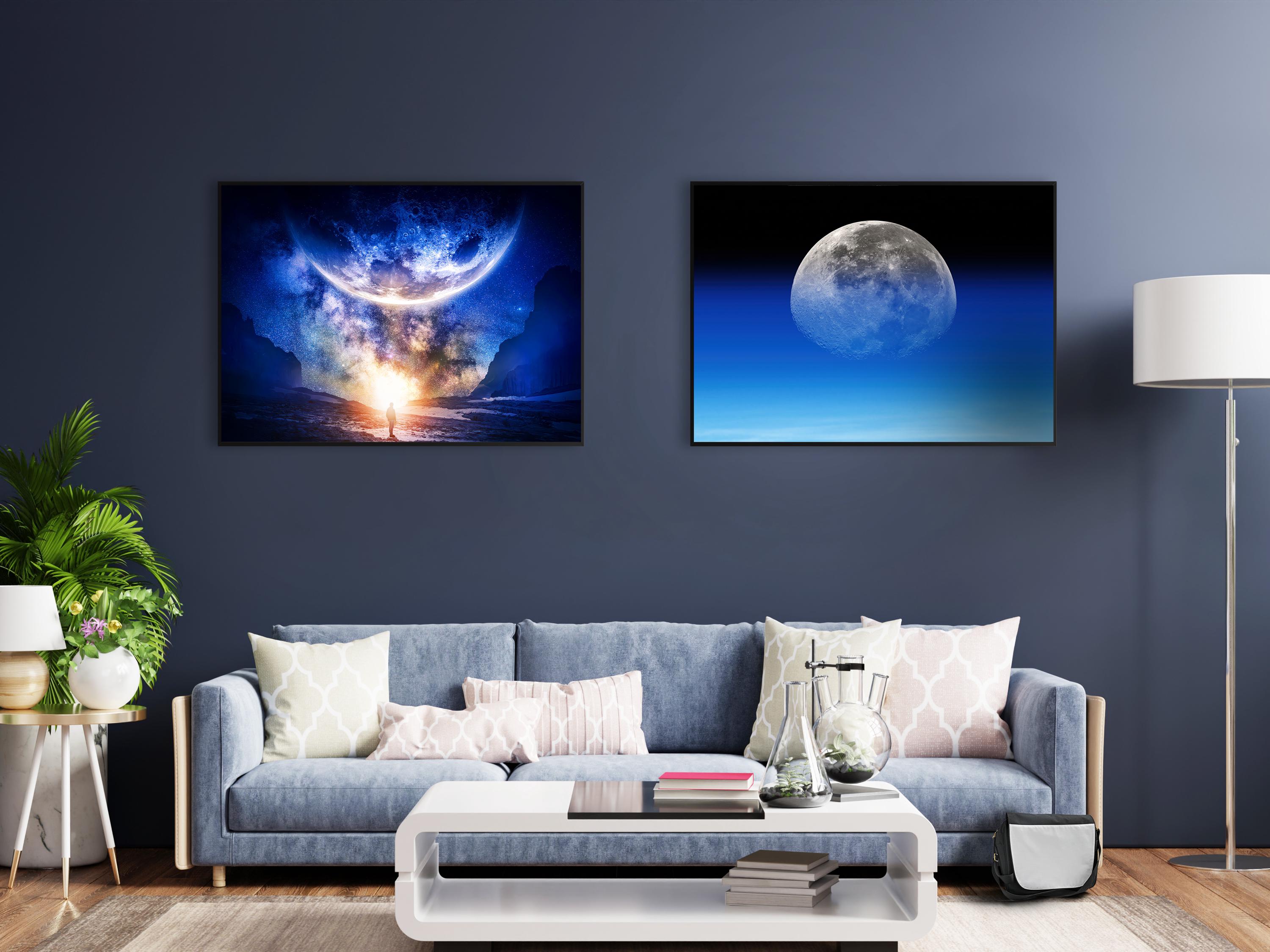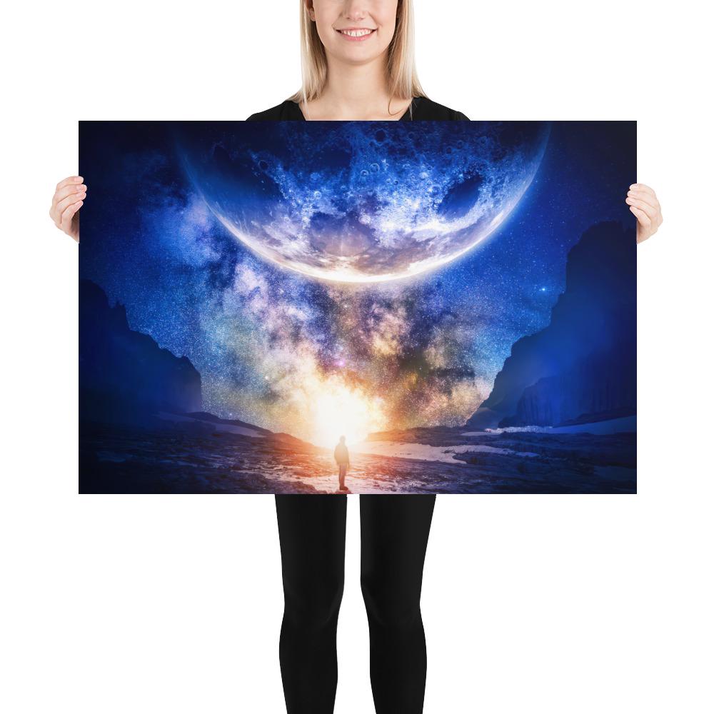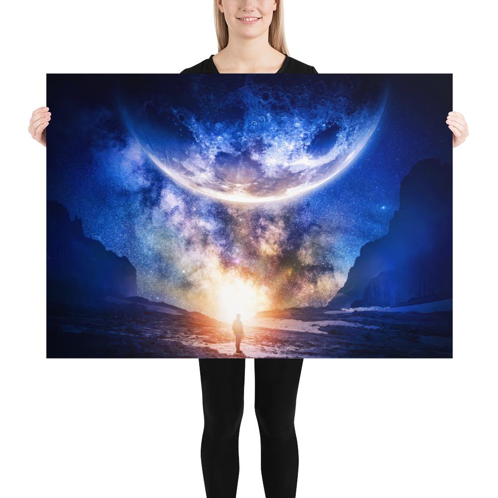🌌 This moon poster shows a lone human standing beneath a giant moon hanging low over the horizon, with a bright distant light illuminating the landscape in a surreal cosmic scene. This cosmic art blends space art, night sky, and stars cosmos aesthetics, creating a powerful sci-fi poster with a sense of mystery, scale, and human solitude. Perfect as wall decor for modern interiors, this space poster adds atmosphere to bedrooms, studios, and meditation spaces inspired by the moon, space, and cosmos.