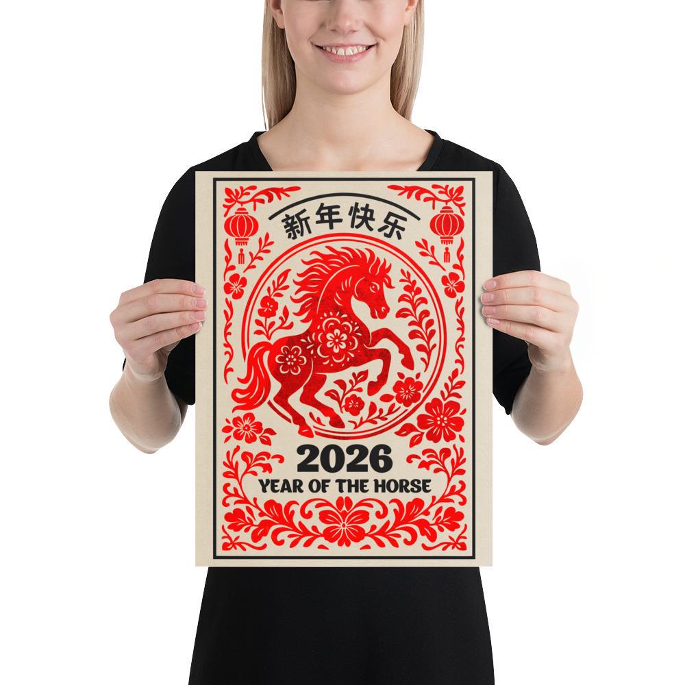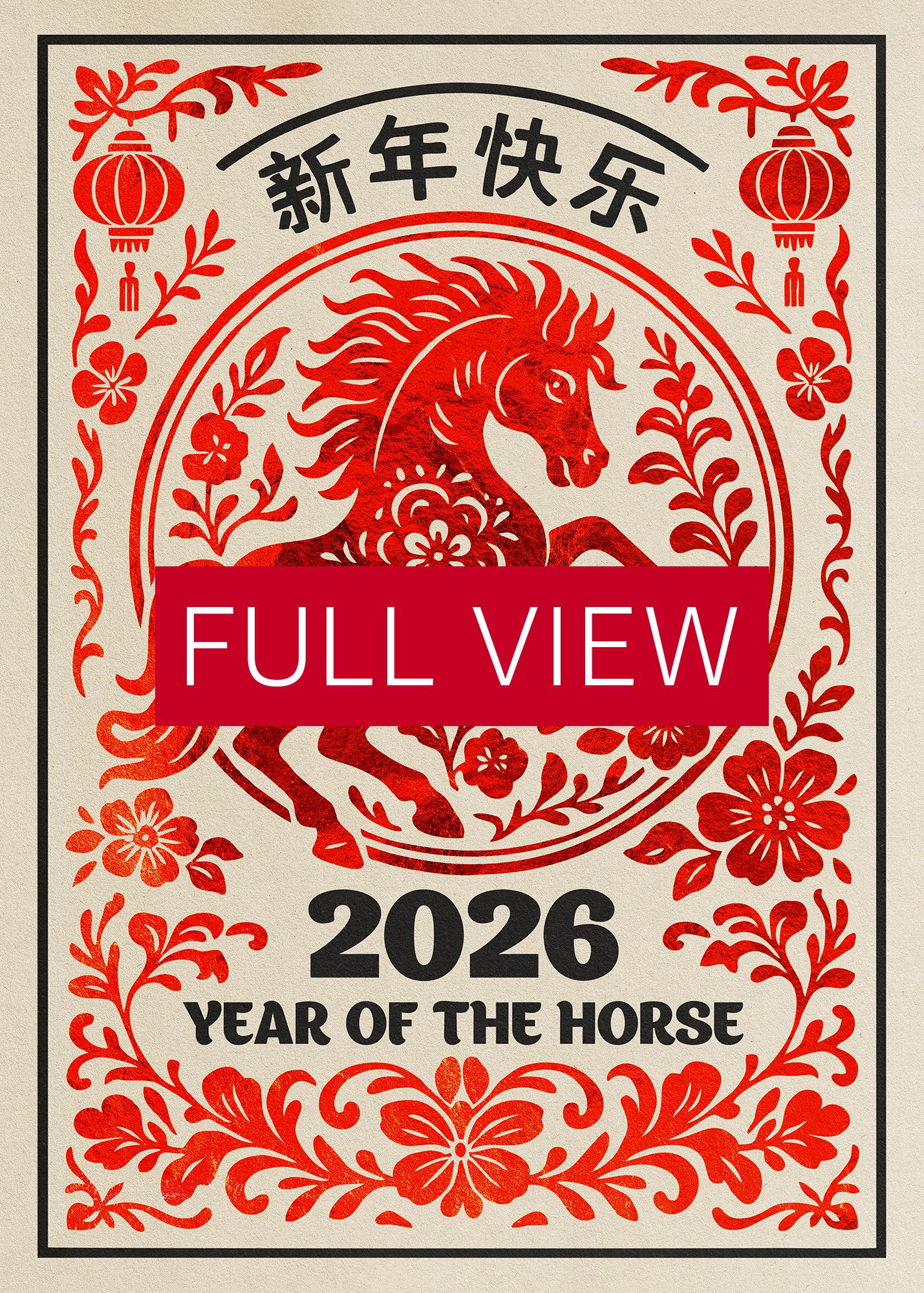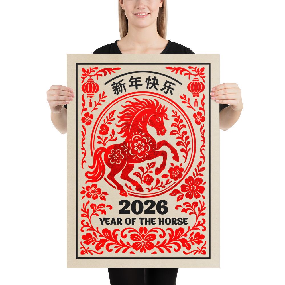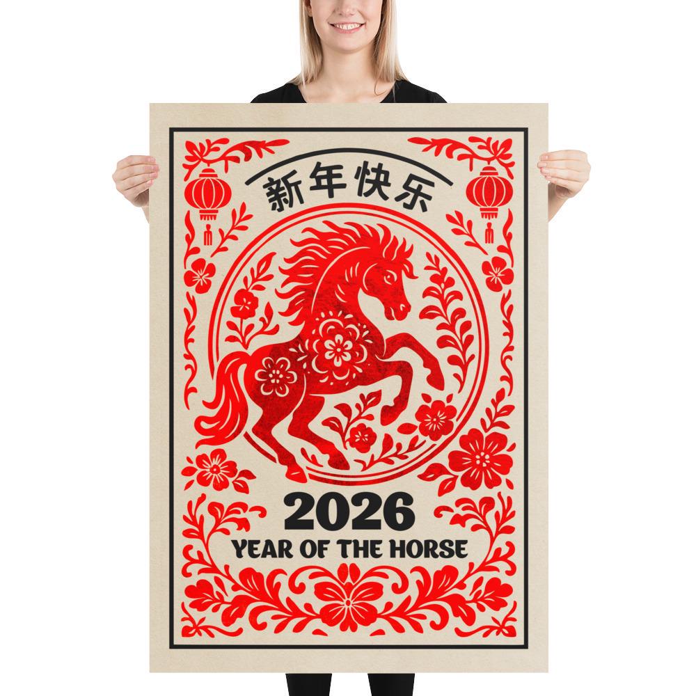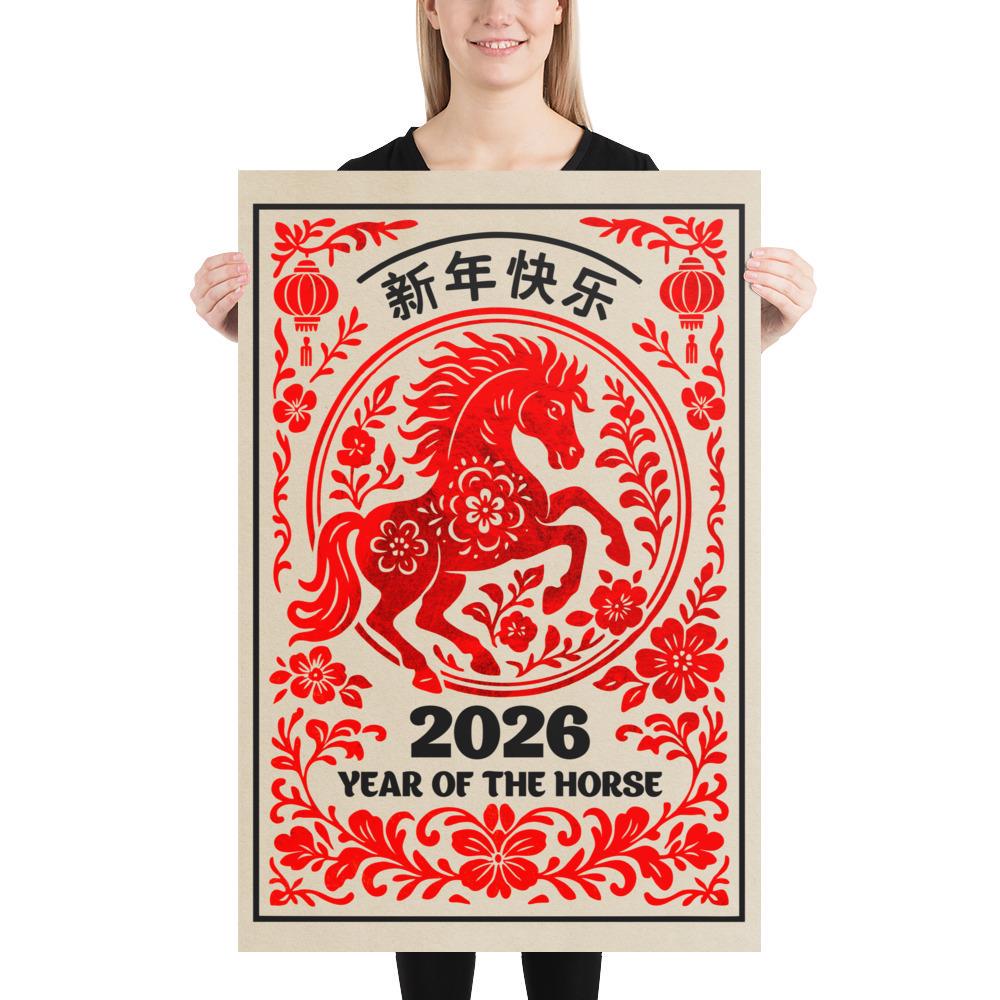 Year of the Horse Chinese Lunar New Year 2026 Poster – Red Gold Chinese Zodiac Wall Art • Oriental Horse Festival Wall Decor ⛔ HQ-quality