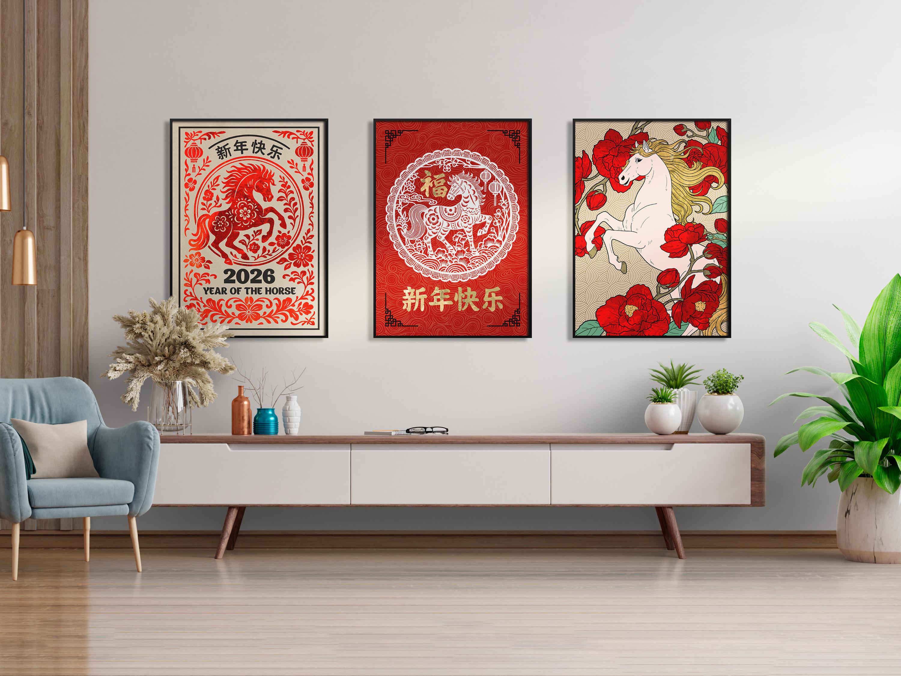 🧧 This Year of the Horse poster set celebrates Chinese Lunar New Year with four red and gold artworks printed on a warm beige paper texture, inspired by traditional Chinese New Year art. The collection features lunar zodiac symbolism, elegant horse poster illustrations, and authentic Asian decor aesthetics perfect for festive interiors and seasonal wall decor. Ideal for collectors of oriental poster, red gold poster, Chinese zodiac, and lunar new year decor, this printable set brings timeless holiday energy into any space.