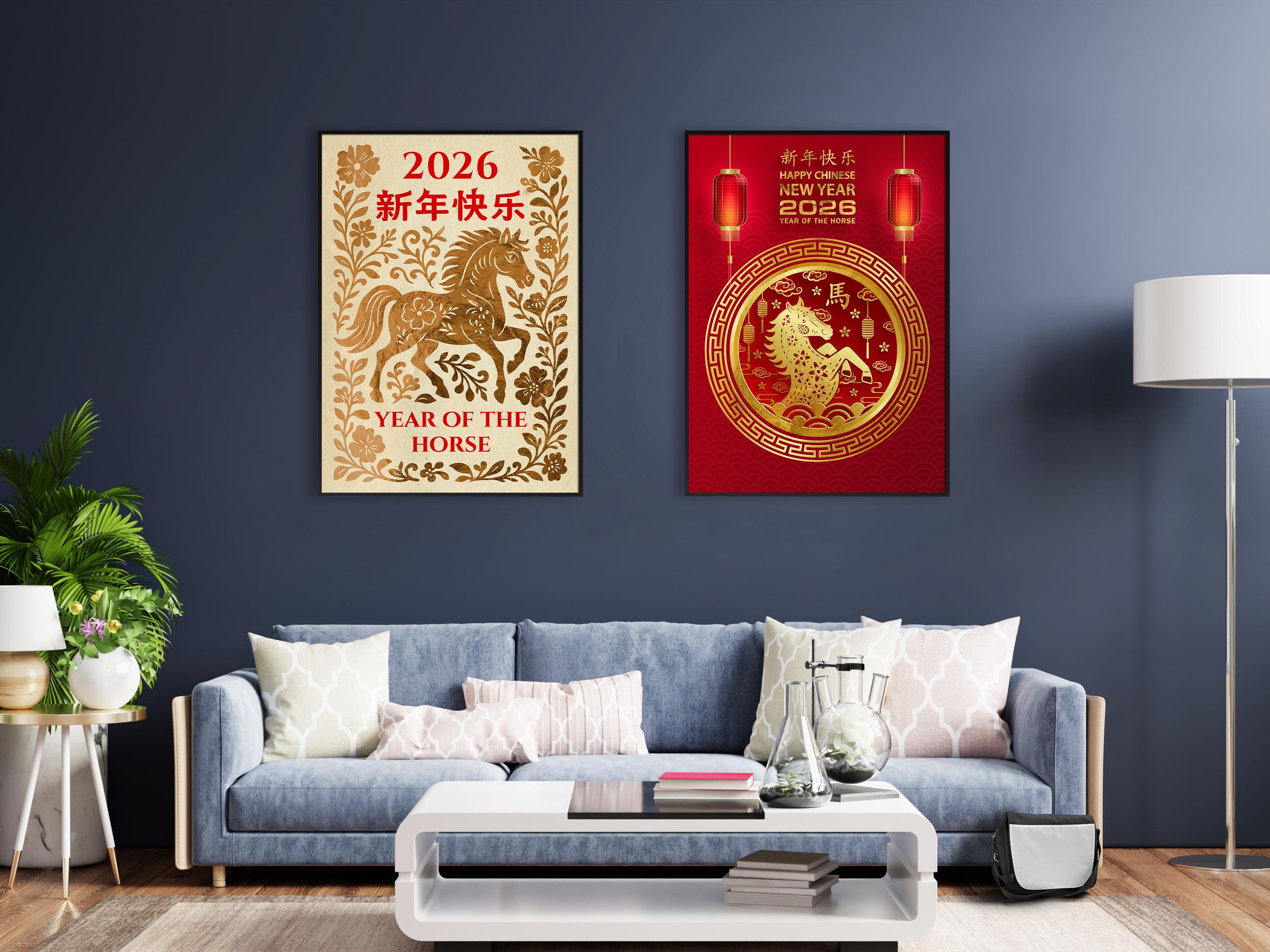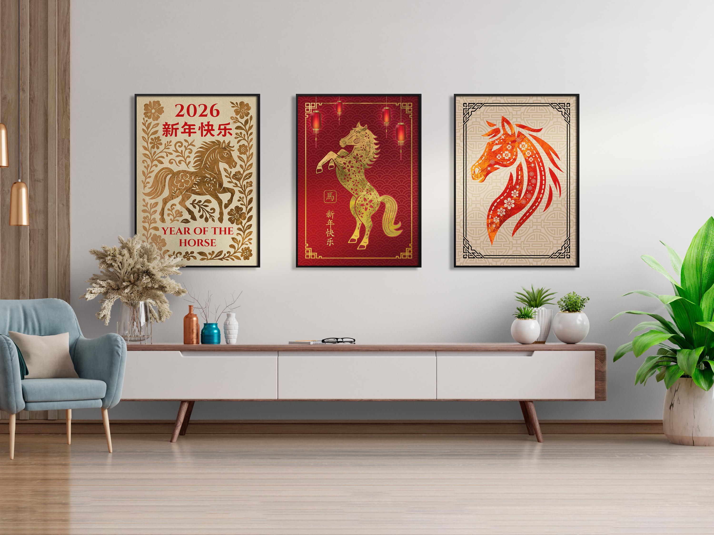 🧧 This Year of the Horse poster set celebrates Chinese Lunar New Year with four red and gold artworks printed on a warm beige paper texture, inspired by traditional Chinese New Year art. The collection features lunar zodiac symbolism, elegant horse poster illustrations, and authentic Asian decor aesthetics perfect for festive interiors and seasonal wall decor. Ideal for collectors of oriental poster, red gold poster, Chinese zodiac, and lunar new year decor, this printable set brings timeless holiday energy into any space.