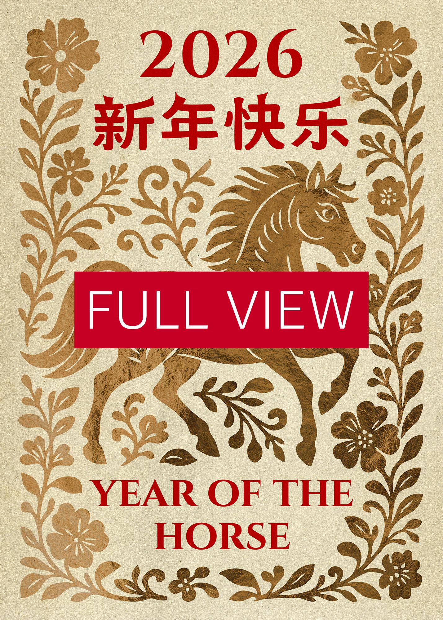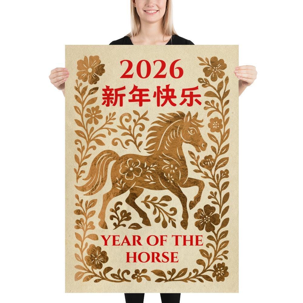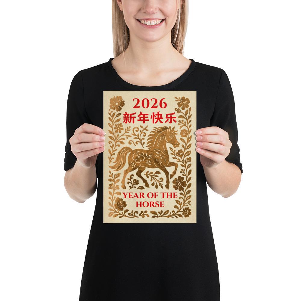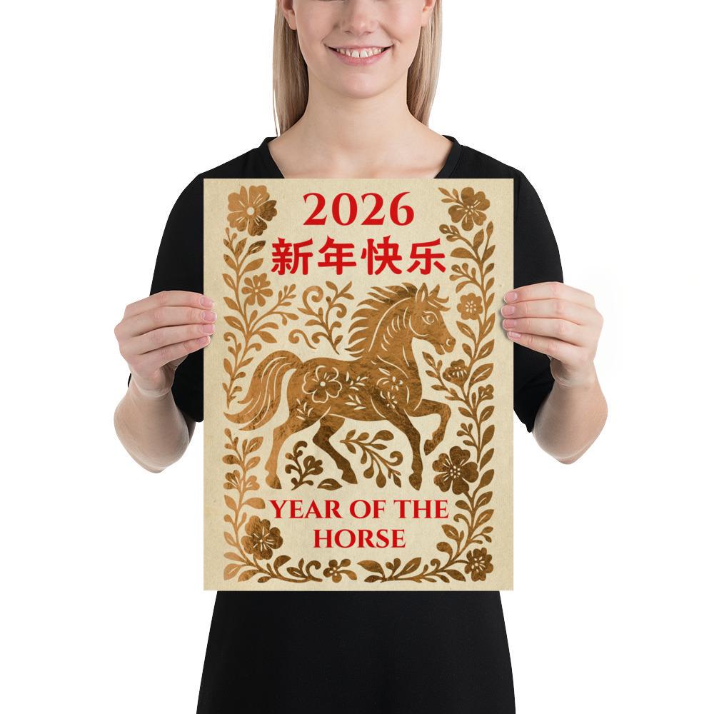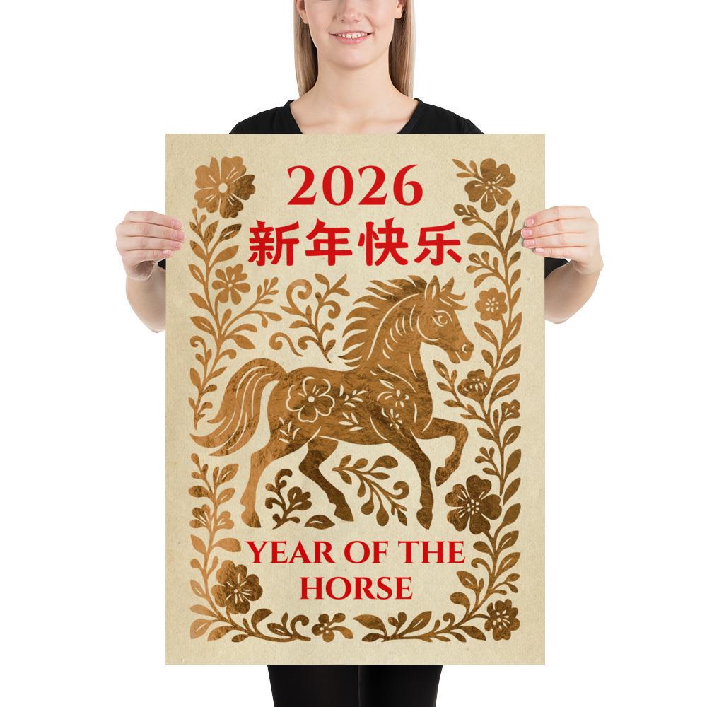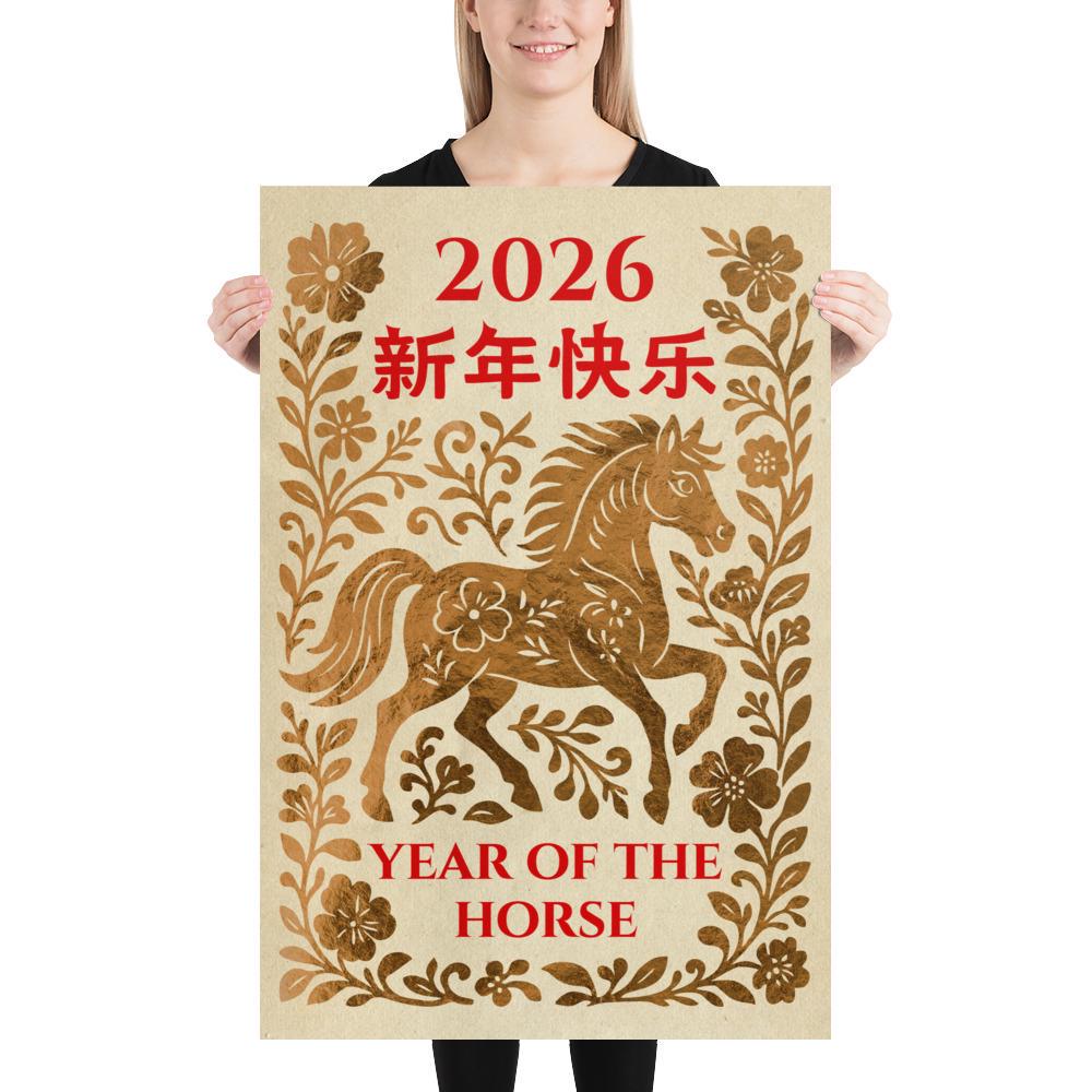 Year of the Horse, 2026 Chinese Lunar New Year Poster – Yellow Gold Chinese Zodiac Wall Art • Oriental Horse Festival Wall Print ⛔ HQ-quality