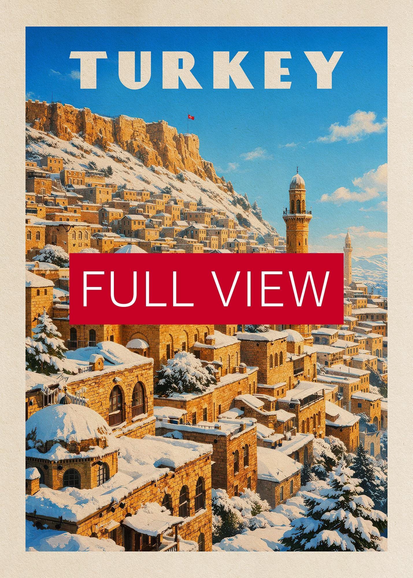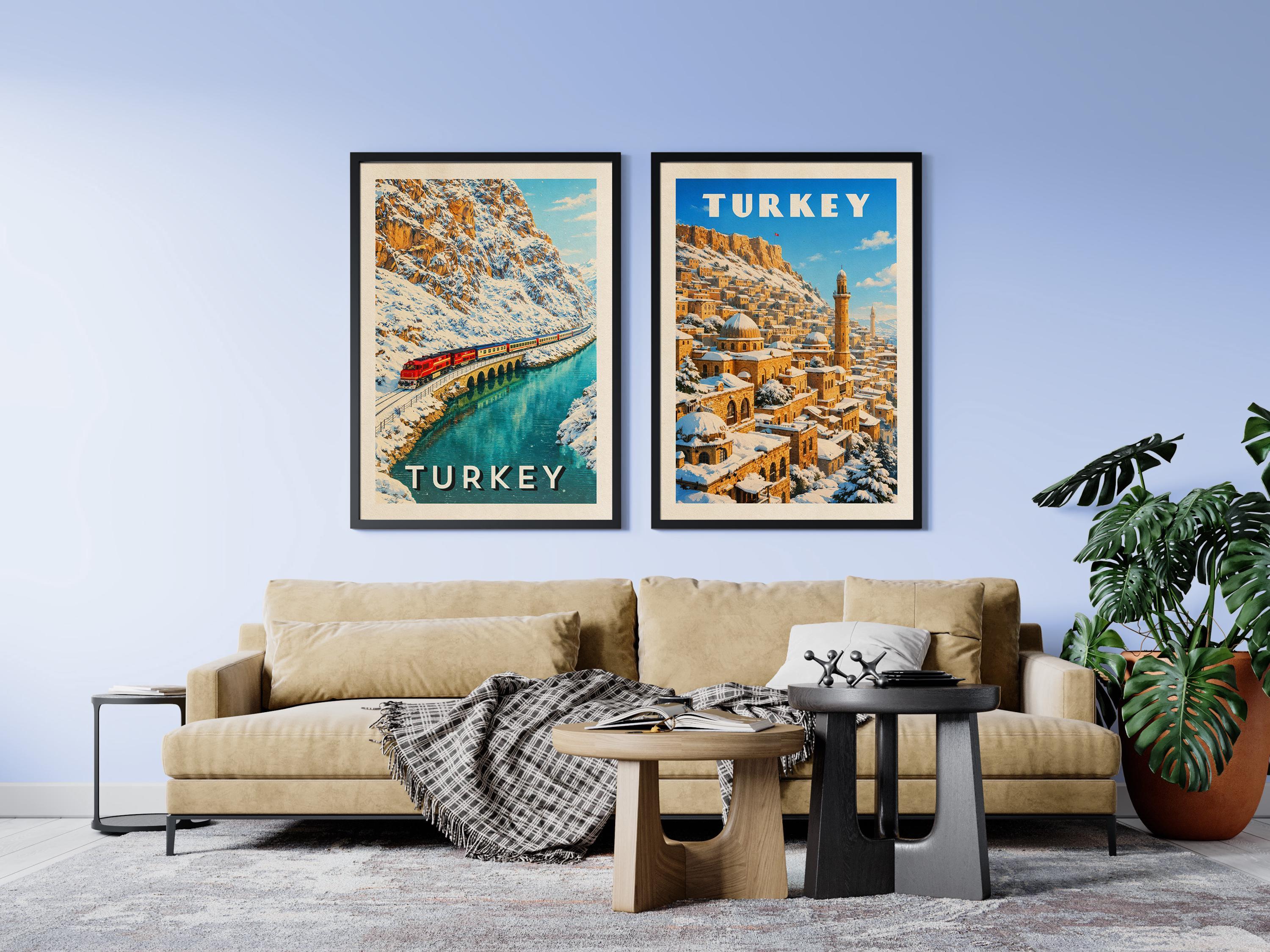❄️ This Winter Mardin Turkey poster from the Winter Turkey collection captures the magical atmosphere of the historic city covered in snow, turning it into a striking Turkey Poster for travel lovers. Designed as a Vintage Travel Print, the artwork highlights the warm stone architecture of Mardin and creates a beautiful Snowy Cityscape perfect for Travel Wall Art and Retro Travel Decor. This Turkey Travel Print works wonderfully as a Wall Art Poster and adds timeless character to modern Home Decor inspired by iconic destinations.